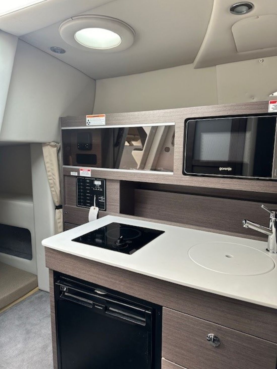 Spaces Saloon Engine room Cabins 1 Berths 4 Decoration Type interior Modern, wood look Color upholstery beige Mattresses Cushions Curtains Water Water tank & material Capacity 76 litre Water tank material plastic Inhoud 76 litre Waste water tank material plastic Waste water tank Waste water tank gauge Waste water tank drainpump Water system pressure Hot water Deck Shower Plumbing Number of showers 2 Toilets 1 Manual Kitchen Cooker & fuel Number 2 Cooking fuel electric Oven Amount 1 Microwave Amount 1 Fridge & power source Power source electric Freezer -
