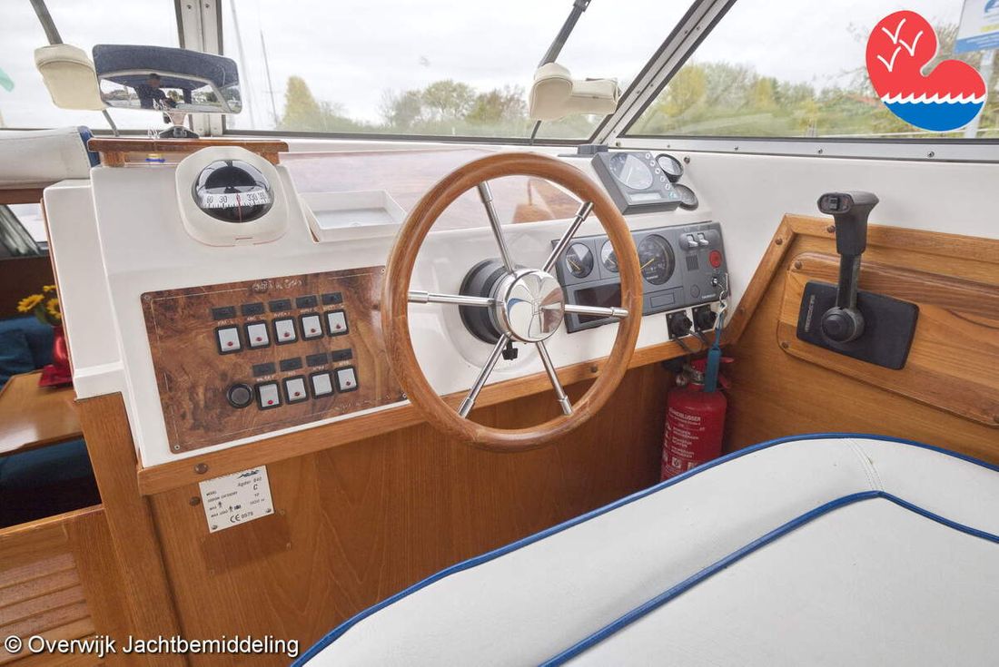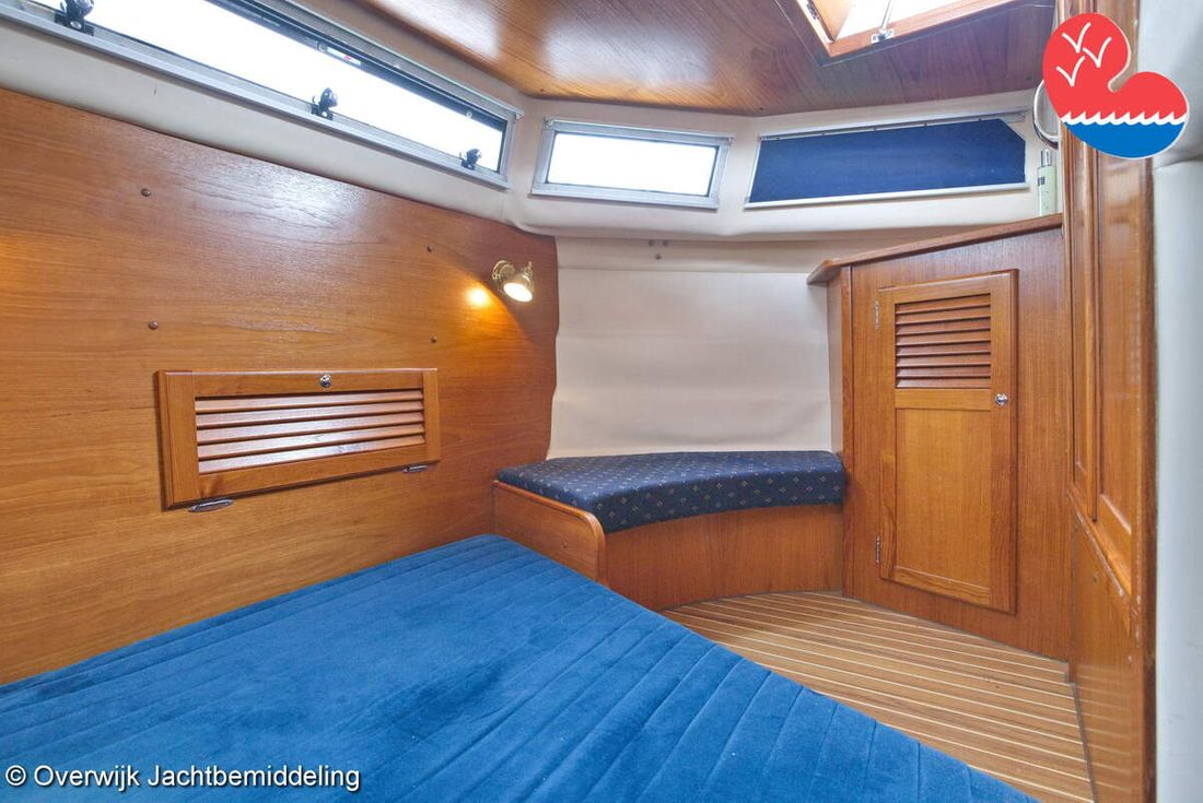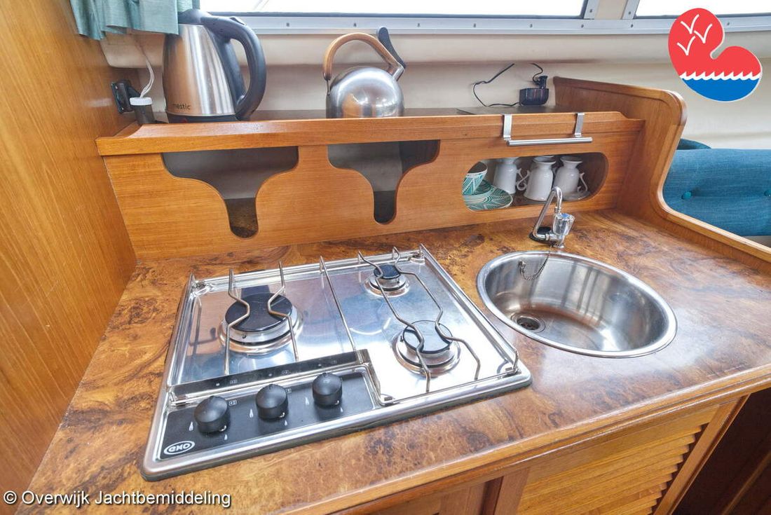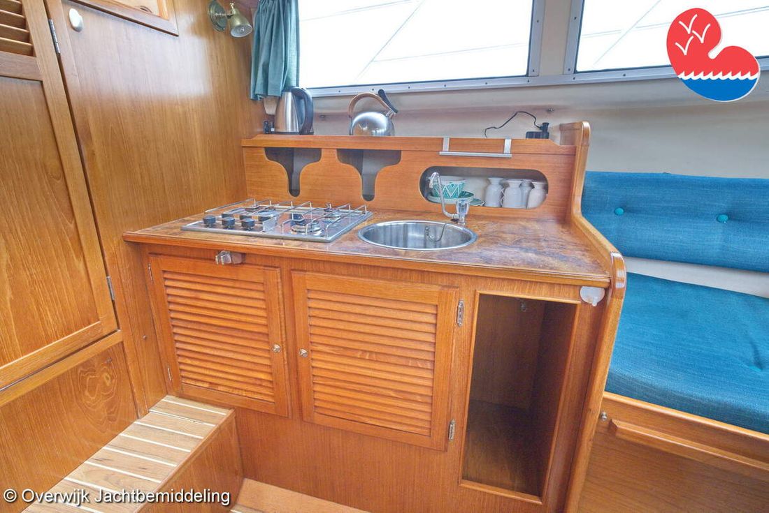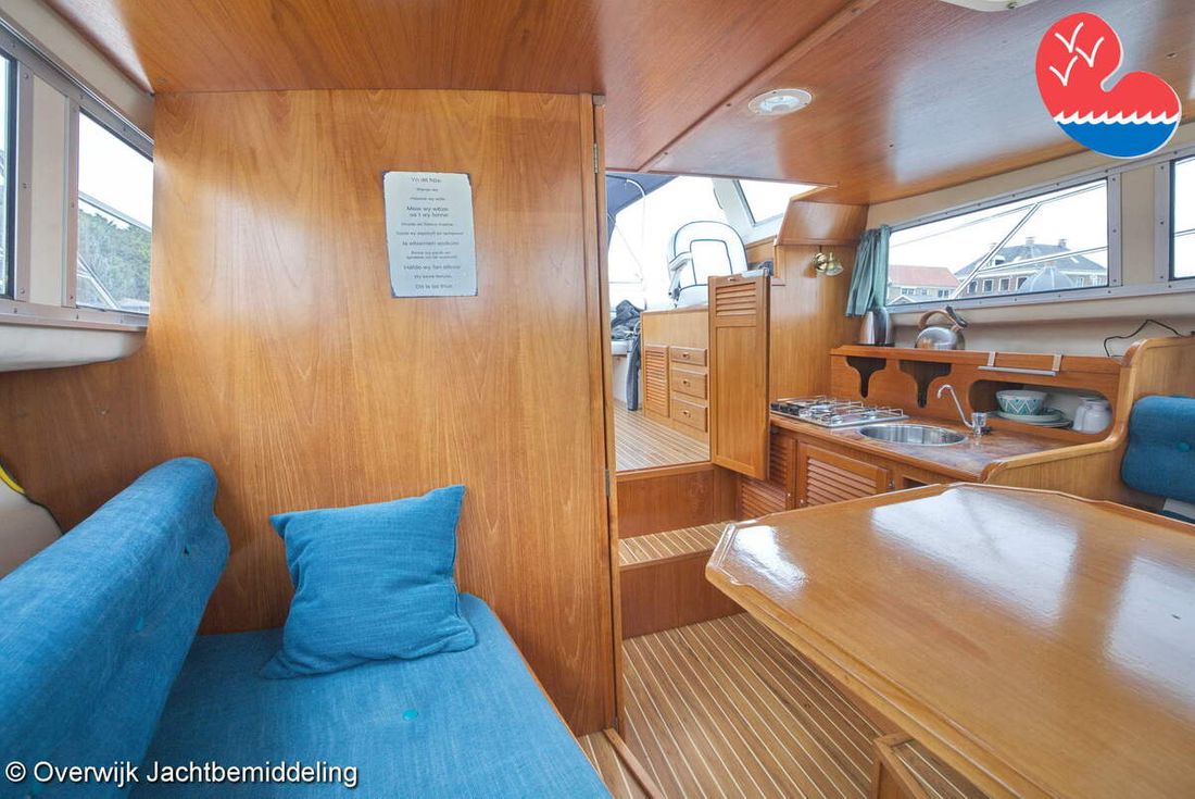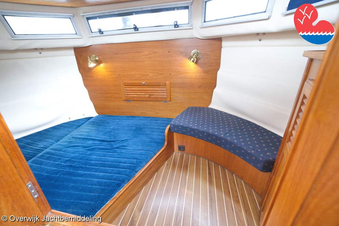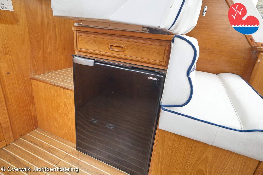Spaces Comments Headroom Wheelhouse 192 cm - Toilet room 172 cm - Forward cabin 179 cm - Aft cabin 130 cm. Separate Dining area Cabins 1 Comments Berths Bed aft cabin 200 x 140 cm - bed forward cabin (dinette) 240 x 155 cm. Layout and spaces inside Open cockpit with various benches and folding table. On the starboard side the steering position and on the port side various cupboards and the co-pilot's place - Aft cabin with a double bed, bench and cupboards. - Forward cabin with kitchen on the port side. Opposite the toilet room with electric toilet and washbasin. - Forepeak with round seat that can also be used as a double bed. Decoration Type interior Classic, warm Color upholstery white Mattresses Cushions Curtains Water Water tank & material Capacity 200 litre Water tank material plastic Inhoud 70 litre Waste water tank material plastic Waste water tank Waste water tank drainpump Deck suction Water system pressure Plumbing Toilets 1 Comments Toilets Jabsco. Manual Entertainment Radio/CD player Comments Radio/CD player Kenwood. Kitchen Cooker & fuel Number 3 Cooking fuel gas Fridge & power source Comments Fridge & power source Compressor refrigerator (new 2024) Capacity 90 litre Power source electric Freezer Comments Freezer In refrigerator. Capacity 10 litre Climate control Heating Webasto Airtop 3500 Diesel. hot air -