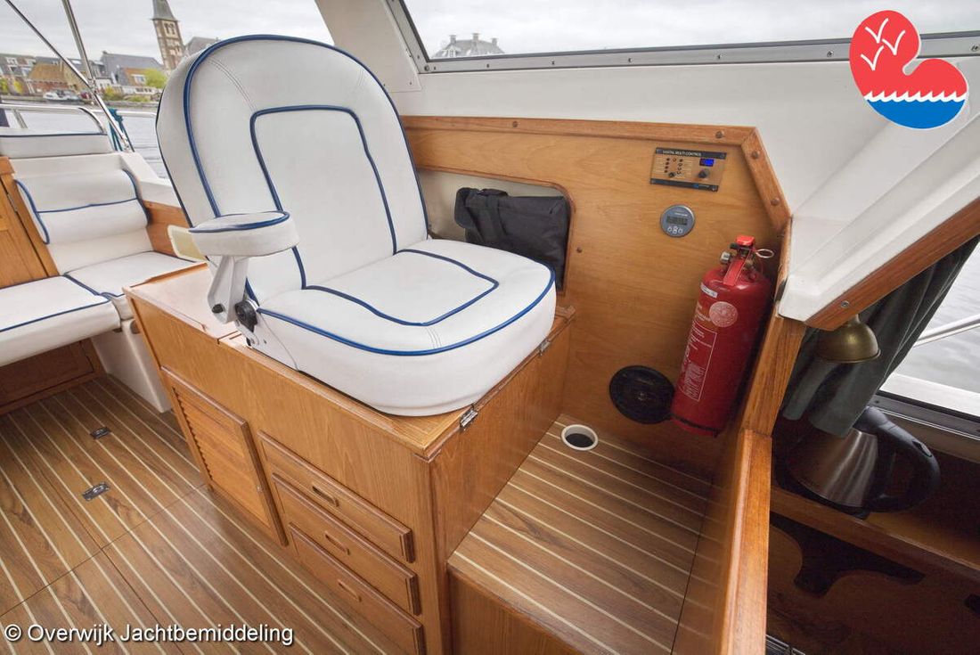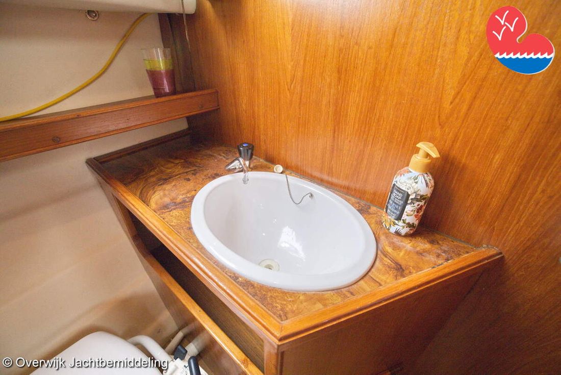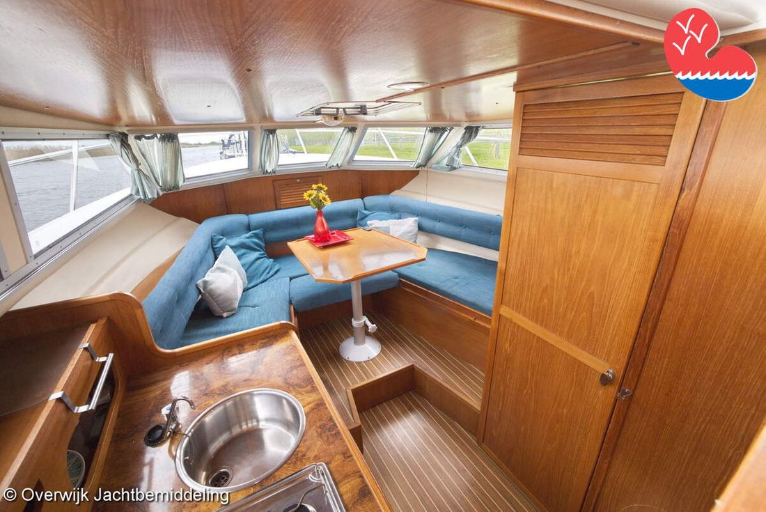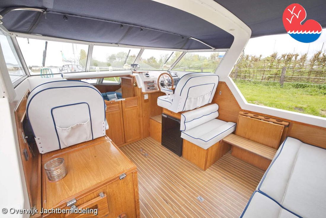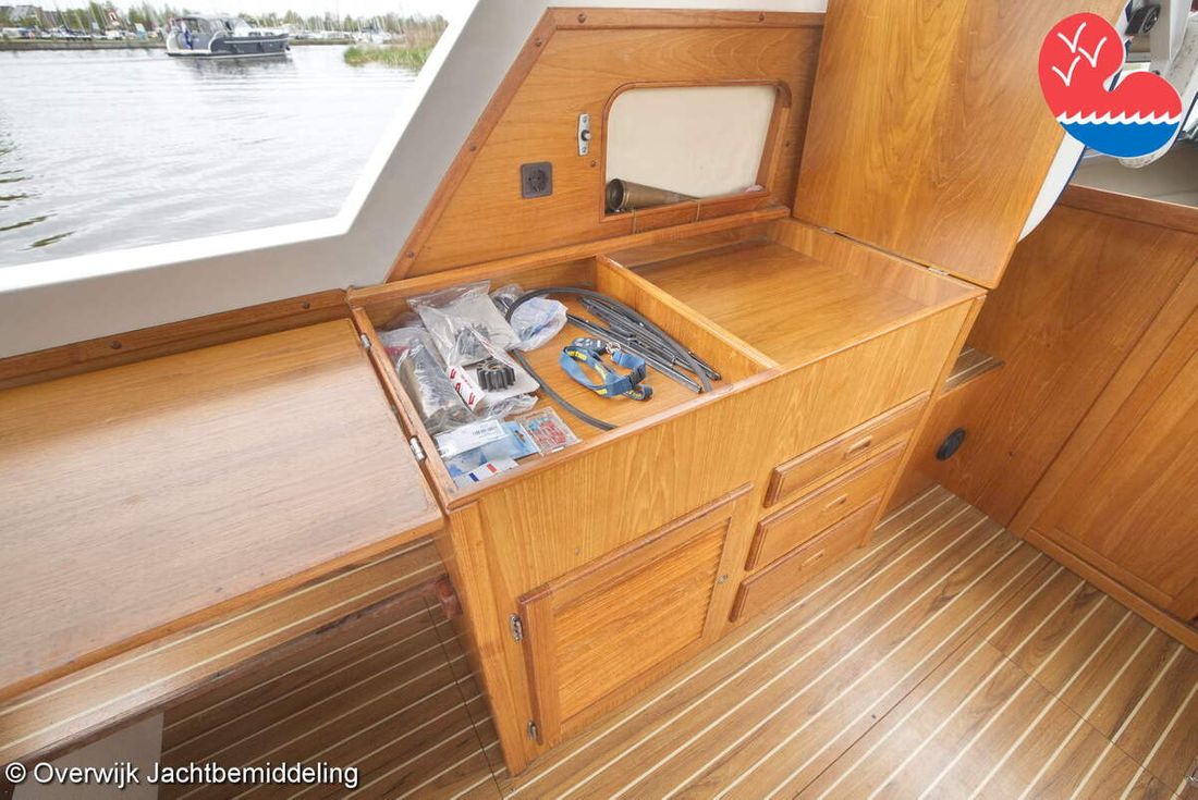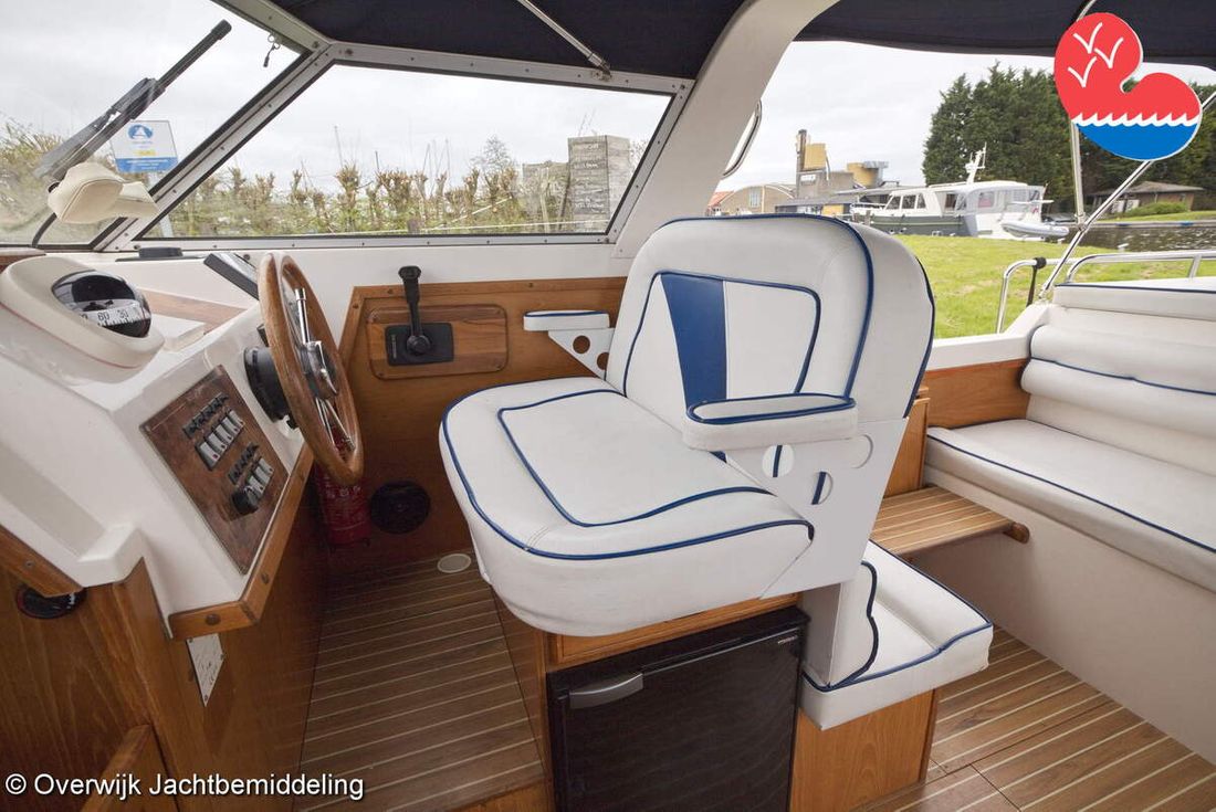 Spaces Comments Headroom Wheelhouse 192 cm - Toilet room 172 cm - Forward cabin 179 cm - Aft cabin 130 cm. Separate Dining area Cabins 1 Comments Berths Bed aft cabin 200 x 140 cm - bed forward cabin (dinette) 240 x 155 cm. Layout and spaces inside Open cockpit with various benches and folding table. On the starboard side the steering position and on the port side various cupboards and the co-pilot's place - Aft cabin with a double bed, bench and cupboards. - Forward cabin with kitchen on the port side. Opposite the toilet room with electric toilet and washbasin. - Forepeak with round seat that can also be used as a double bed. Decoration Type interior Classic, warm Color upholstery white Mattresses Cushions Curtains Water Water tank & material Capacity 200 litre Water tank material plastic Inhoud 70 litre Waste water tank material plastic Waste water tank Waste water tank drainpump Deck suction Water system pressure Plumbing Toilets 1 Comments Toilets Jabsco. Manual Entertainment Radio/CD player Comments Radio/CD player Kenwood. Kitchen Cooker & fuel Number 3 Cooking fuel gas Fridge & power source Comments Fridge & power source Compressor refrigerator (new 2024) Capacity 90 litre Power source electric Freezer Comments Freezer In refrigerator. Capacity 10 litre Climate control Heating Webasto Airtop 3500 Diesel. hot air -