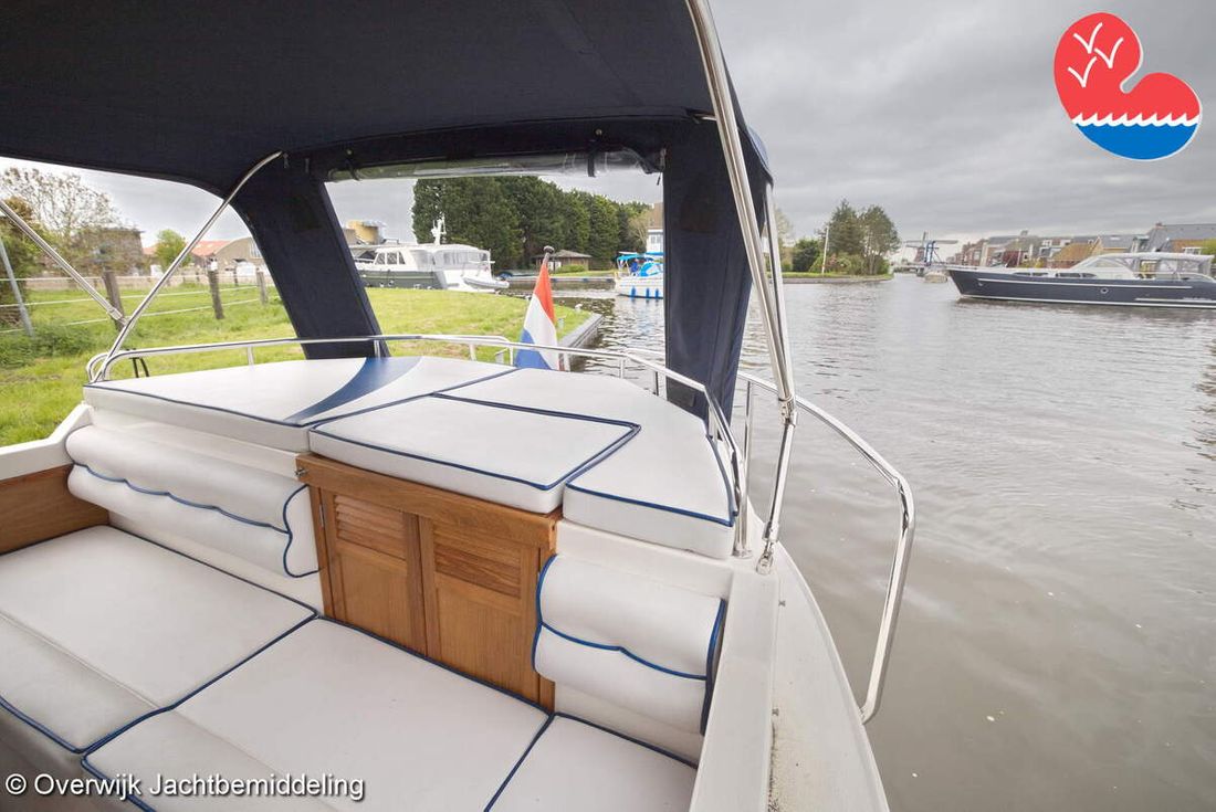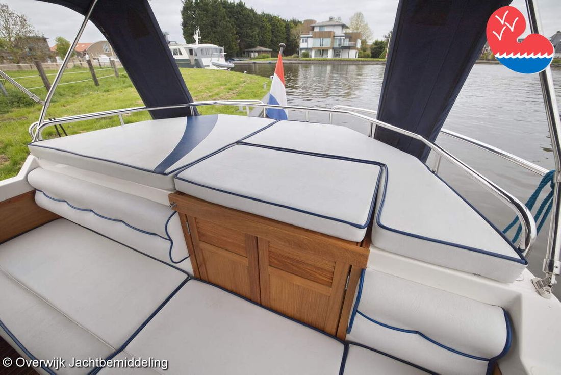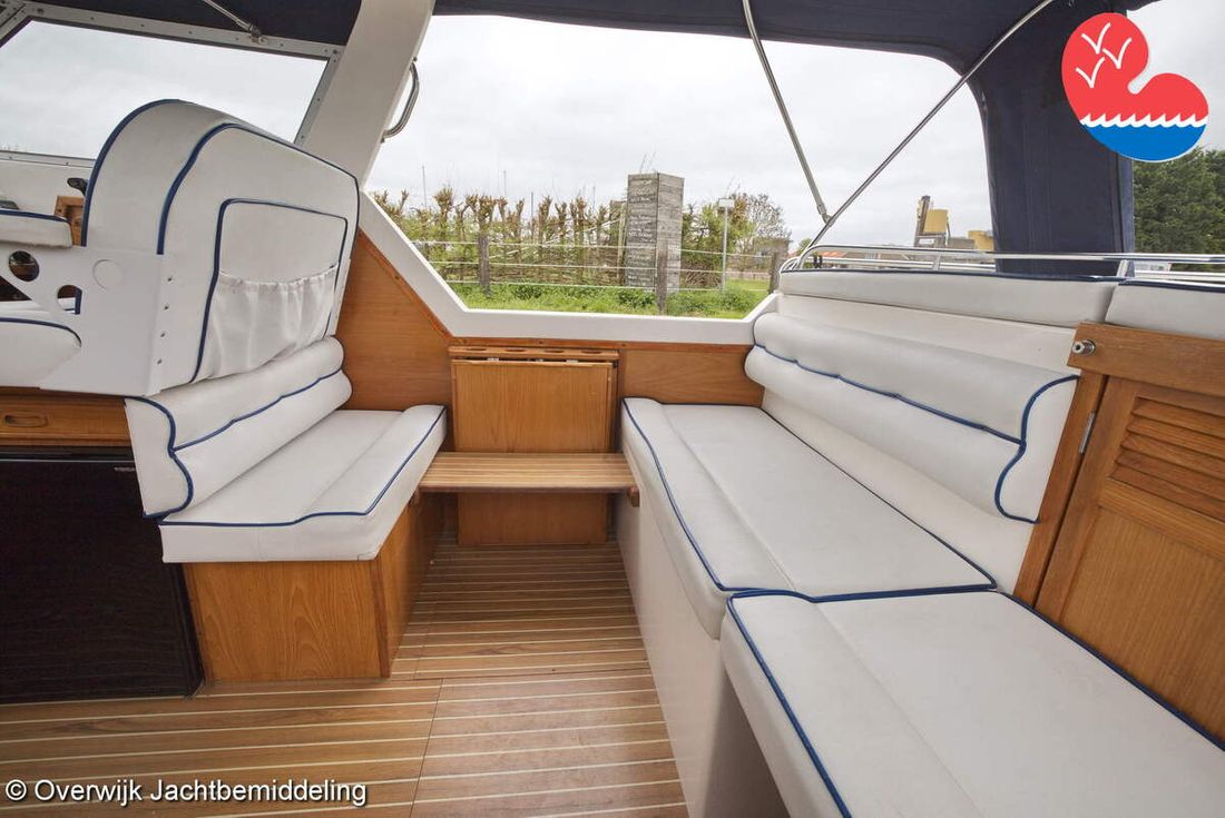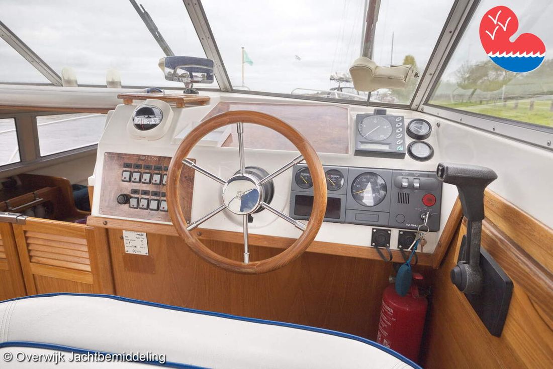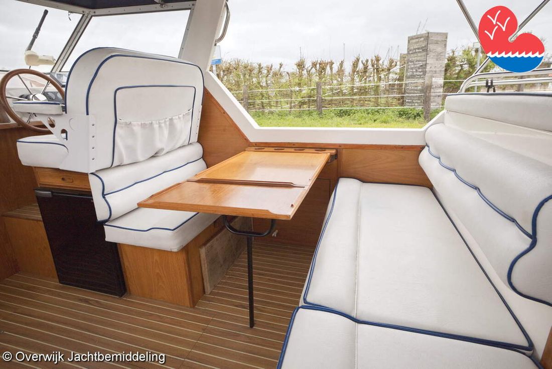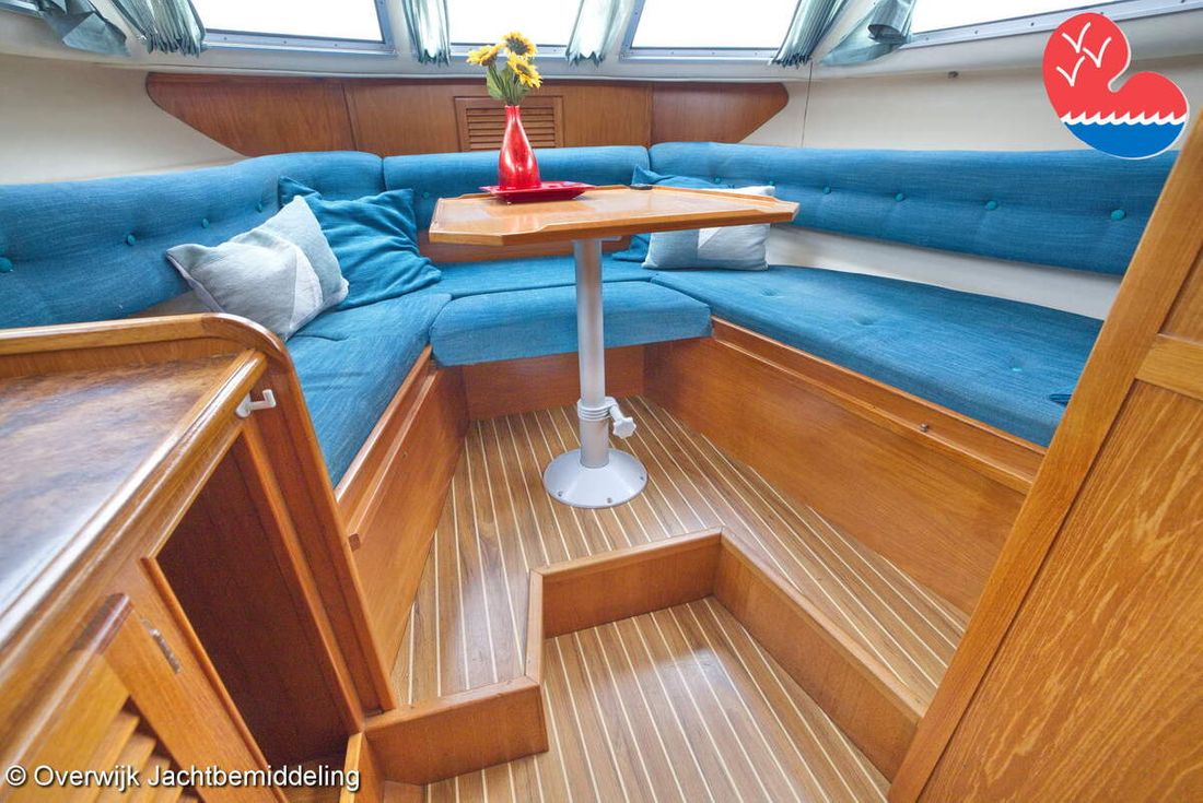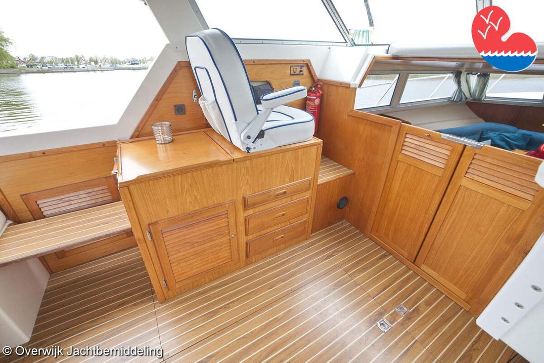 Spaces Comments Headroom Wheelhouse 192 cm - Toilet room 172 cm - Forward cabin 179 cm - Aft cabin 130 cm. Separate Dining area Cabins 1 Comments Berths Bed aft cabin 200 x 140 cm - bed forward cabin (dinette) 240 x 155 cm. Layout and spaces inside Open cockpit with various benches and folding table. On the starboard side the steering position and on the port side various cupboards and the co-pilot's place - Aft cabin with a double bed, bench and cupboards. - Forward cabin with kitchen on the port side. Opposite the toilet room with electric toilet and washbasin. - Forepeak with round seat that can also be used as a double bed. Decoration Type interior Classic, warm Color upholstery white Mattresses Cushions Curtains Water Water tank & material Capacity 200 litre Water tank material plastic Inhoud 70 litre Waste water tank material plastic Waste water tank Waste water tank drainpump Deck suction Water system pressure Plumbing Toilets 1 Comments Toilets Jabsco. Manual Entertainment Radio/CD player Comments Radio/CD player Kenwood. Kitchen Cooker & fuel Number 3 Cooking fuel gas Fridge & power source Comments Fridge & power source Compressor refrigerator (new 2024) Capacity 90 litre Power source electric Freezer Comments Freezer In refrigerator. Capacity 10 litre Climate control Heating Webasto Airtop 3500 Diesel. hot air -