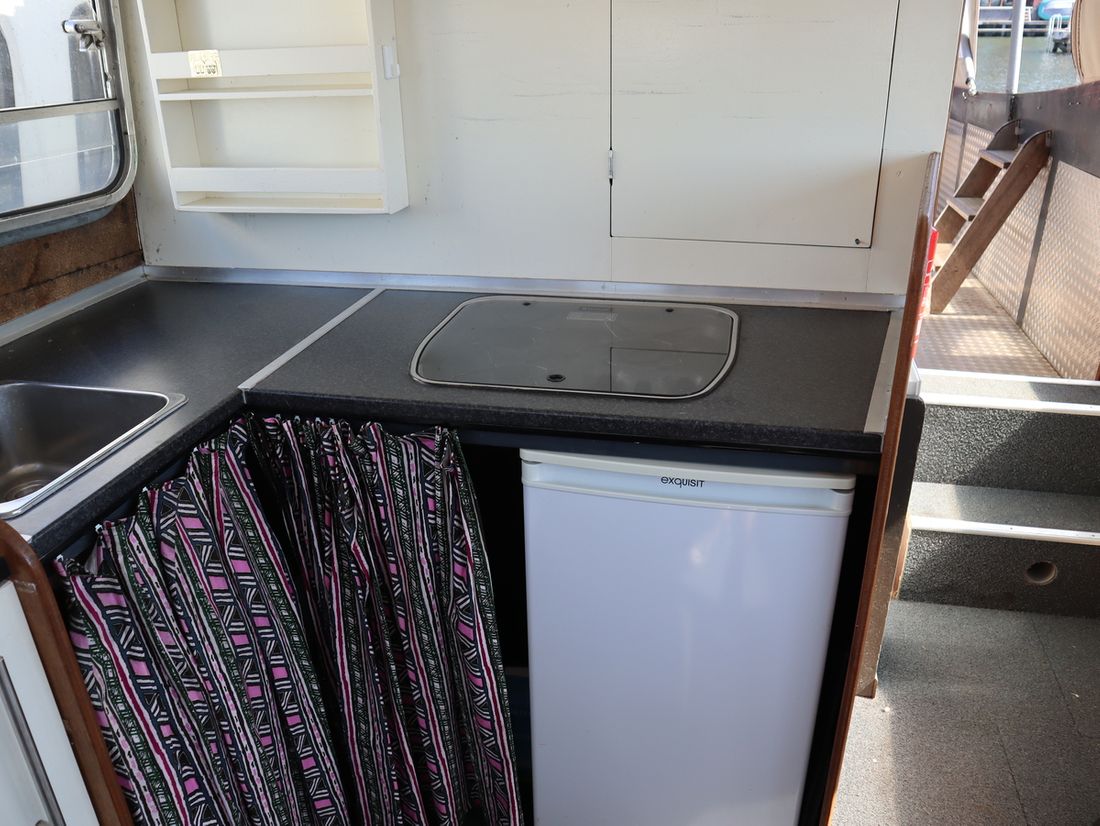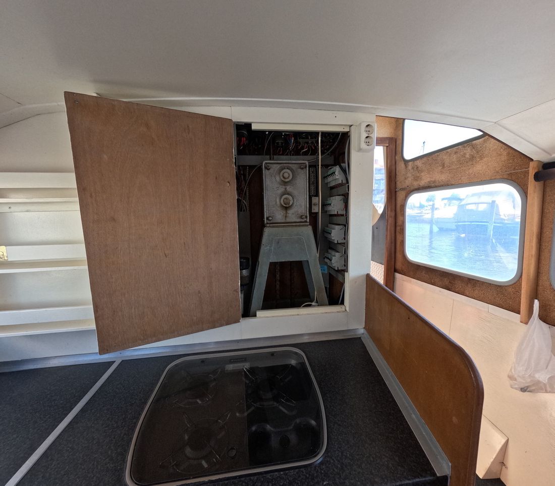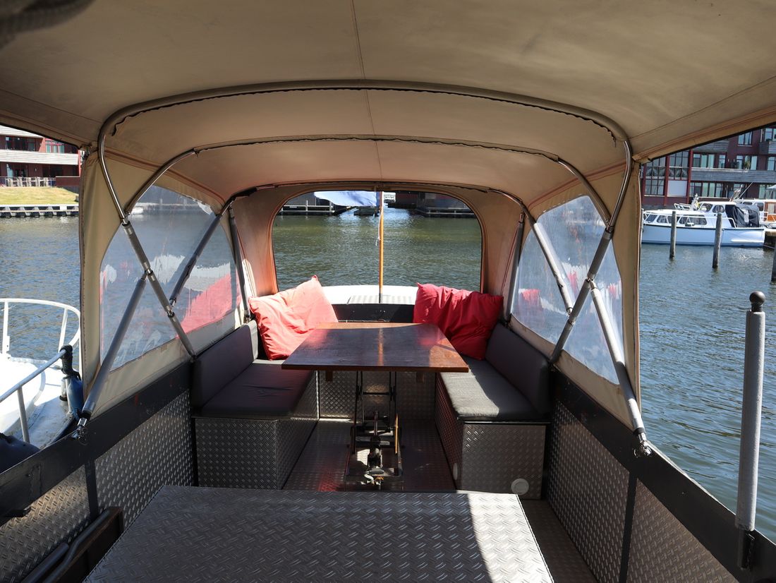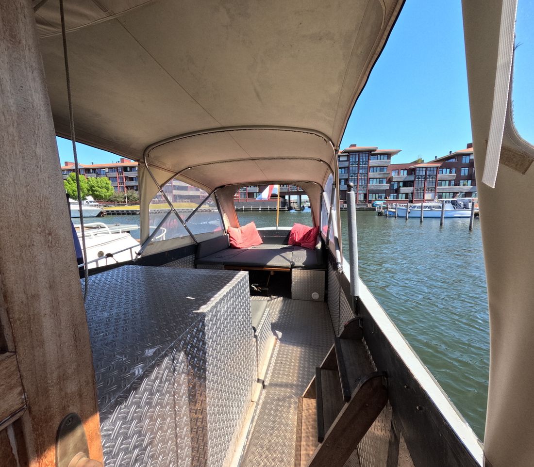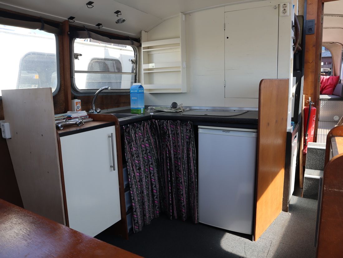 Engines Number of identical engines 1 Starting type electric Main engine Type inboard Brand MWM Model TD20 Year 1984 Number of cylinders 6 Power 120 hp Fuel diesel Fuel consumption 3 litre/hour Brand gearbox Reintjes Drive Transmission shaft Propulsion propellor Tank Fuel tanks Number 2 Total fuel tank(s) capacity 400 litre Fuel tank material polyethyleen Performance Max speed 19 km/h Cruising speed 12 km/h Measuring instruments Tachometer Oil pressure gauge Temperature gauge Electricity Battery Number 8 Battery charger Alternator Inverter Capacity 3000 Voltmeter Shore power Shore power cable Solar panel Capacity 740 Consumption monitor 24V 220V -