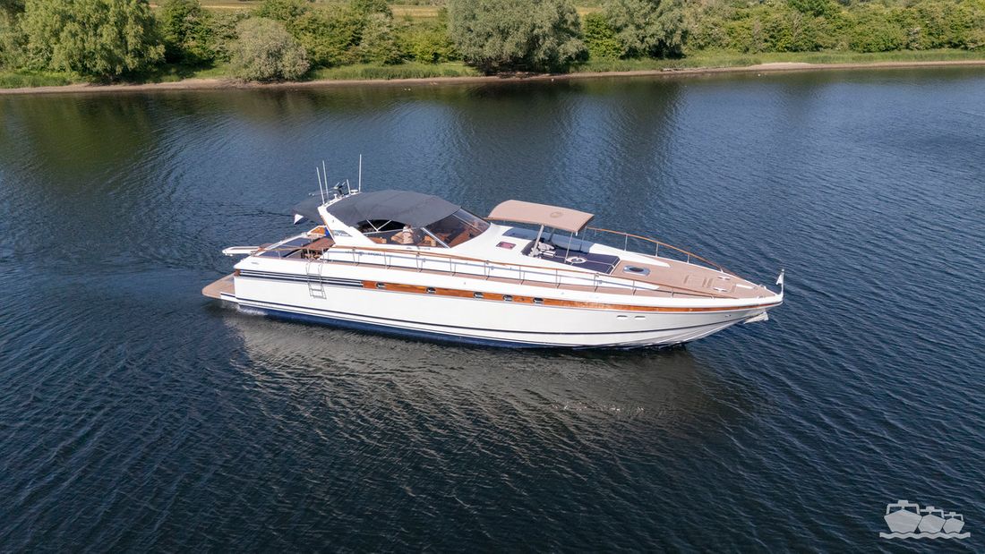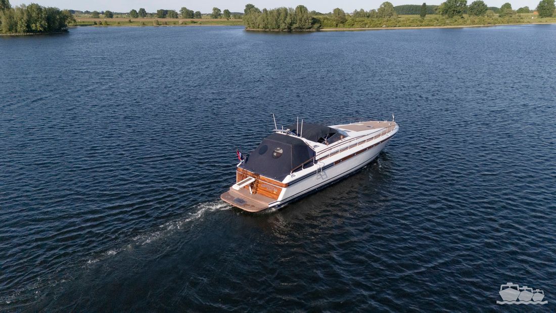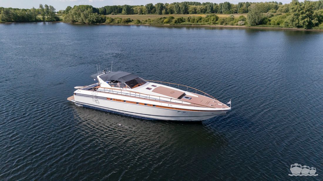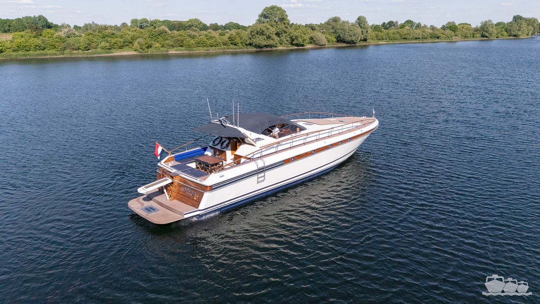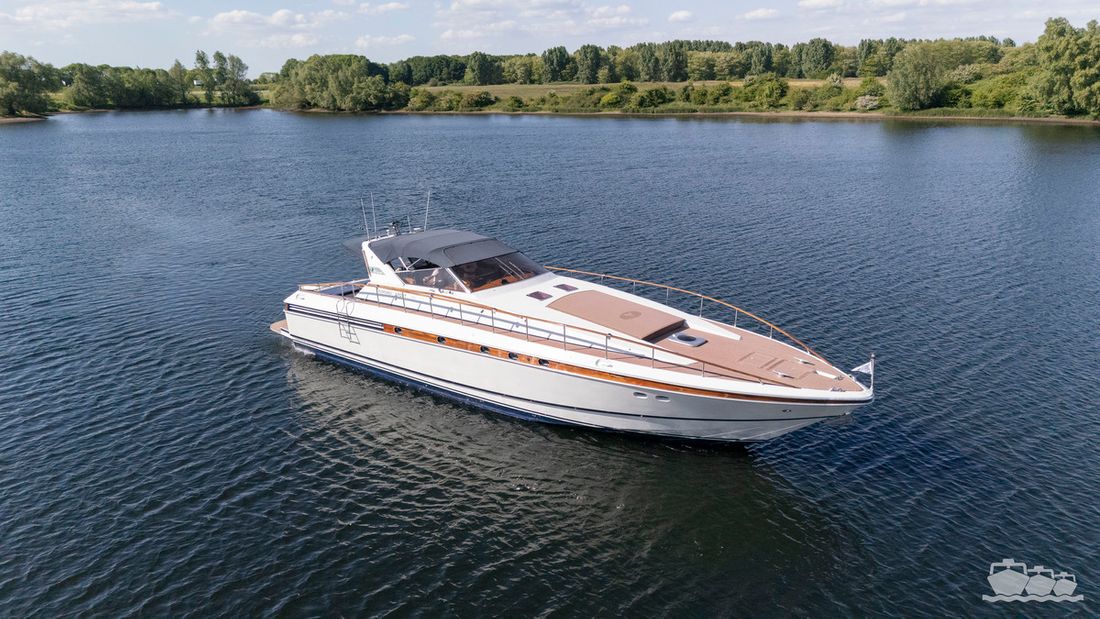 Delivered new Designer Paolo Caliari Shipyard Cantieri Navale Arno S.R.L CE-category exempt Inspection certificate Hull deck superstructure Hull shape v-bottom Comments Hull shape Complete underwater hull stripped + new antifouling applied (April 2025) Hull colour white Deck colour white Deck construction grp (polyester) Comments Deck construction covered in flexiteak in 2008, new shell in 2016 Open cockpit Windows single safety glass in aluminum window profiles Dimensions and weights Displacement 35 tonnes Steering and Drift Limitation Steering system wheel Position steering system outside control Rudder double Trimflaps Comments Trimflaps fixed -