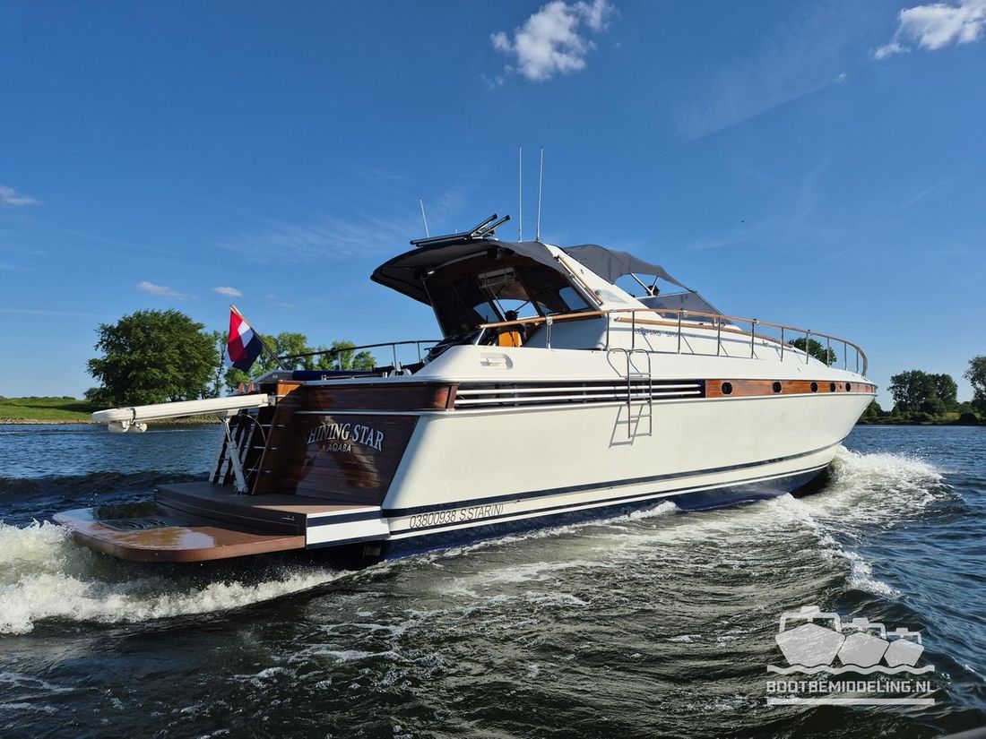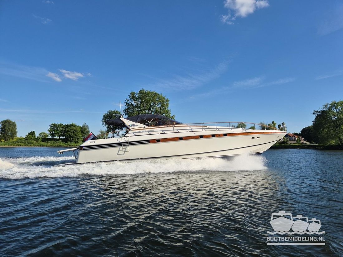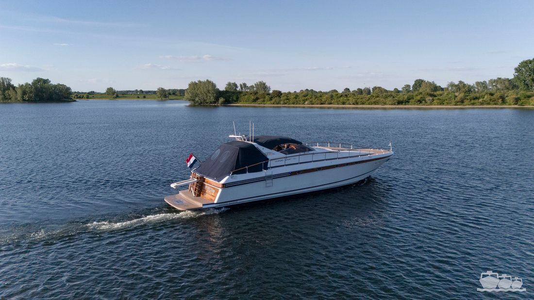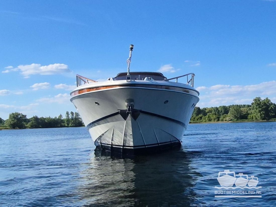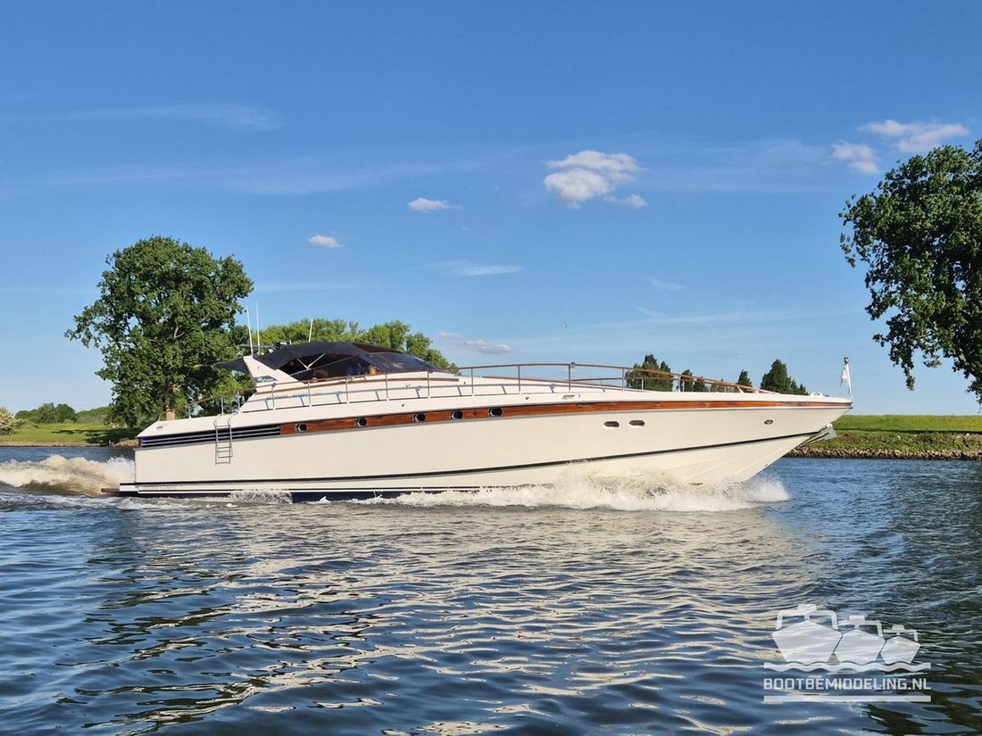 Delivered new Designer Paolo Caliari Shipyard Cantieri Navale Arno S.R.L CE-category exempt Inspection certificate Hull deck superstructure Hull shape v-bottom Comments Hull shape Complete underwater hull stripped + new antifouling applied (April 2025) Hull colour white Deck colour white Deck construction grp (polyester) Comments Deck construction covered in flexiteak in 2008, new shell in 2016 Open cockpit Windows single safety glass in aluminum window profiles Dimensions and weights Displacement 35 tonnes Steering and Drift Limitation Steering system wheel Position steering system outside control Rudder double Trimflaps Comments Trimflaps fixed -