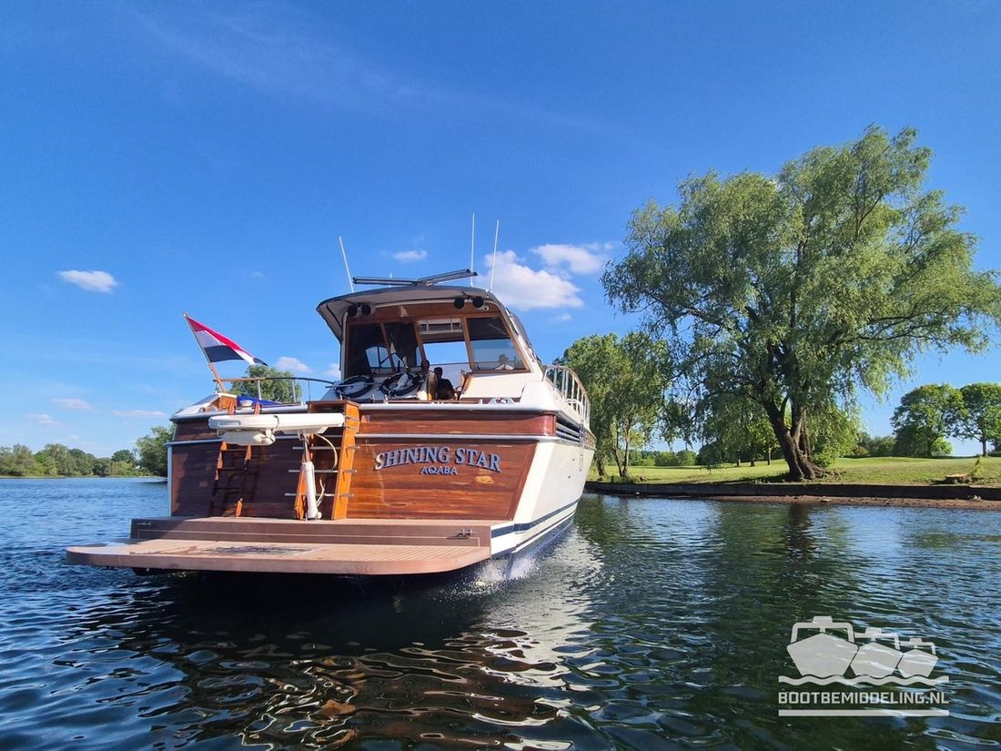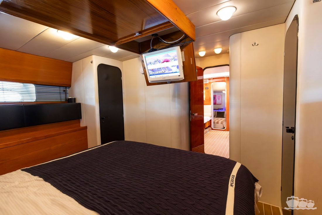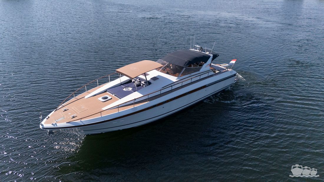 Spaces Saloon Comments Headroom steering position: 200 cm, saloon: 200 cm, master bedroom: 200 cm, guest cabin: 230 cm, both showers and toilets: 200 cm, crew cabin and shower: 190 cm, engine room: 200 cm Separate Dining area Engine room Cabins 3 Berths 6 Decoration Type interior Classic, warm Comments Type interior teak and walnut, leather upholstery Color upholstery white Mattresses Cushions Curtains Water Water tank & material Capacity 1000 litre Water tank gauge Inhoud 180 litre Waste water tank Waste water tank gauge Water system pressure Hot water Comments Hot water boiler Deck wash pump Deck Shower Plumbing Number of showers 3 Toilets 3 Electric Entertainment Television Comments Television with elevator Radio/CD player Comments Radio/CD player Bose sound system DVD player Kitchen Cooker & fuel Comments Cooker & fuel ceramic Number 4 Cooking fuel electric Oven Comments Oven combi oven/magnetron Amount 1 Microwave Comments Microwave combi oven/magnetron Amount 1 Fridge & power source Capacity 160 litre Power source electric Freezer Capacity 50 litre Climate control hot air Comments Heating Webasto + Eberspächer Air conditioning -