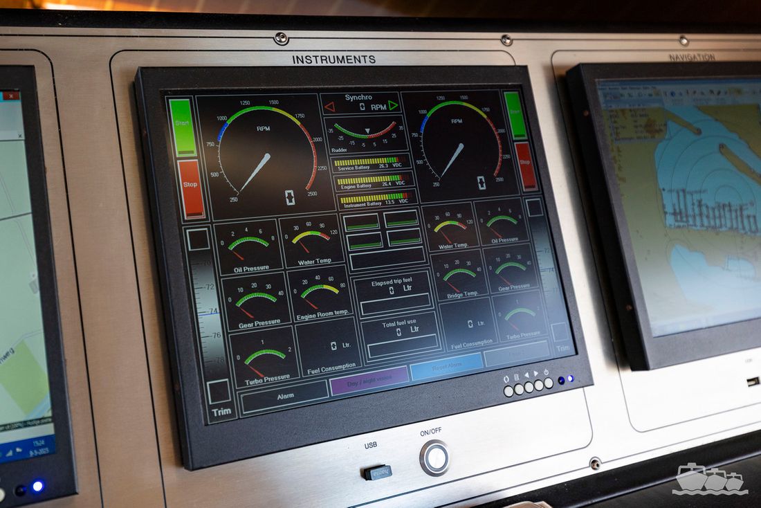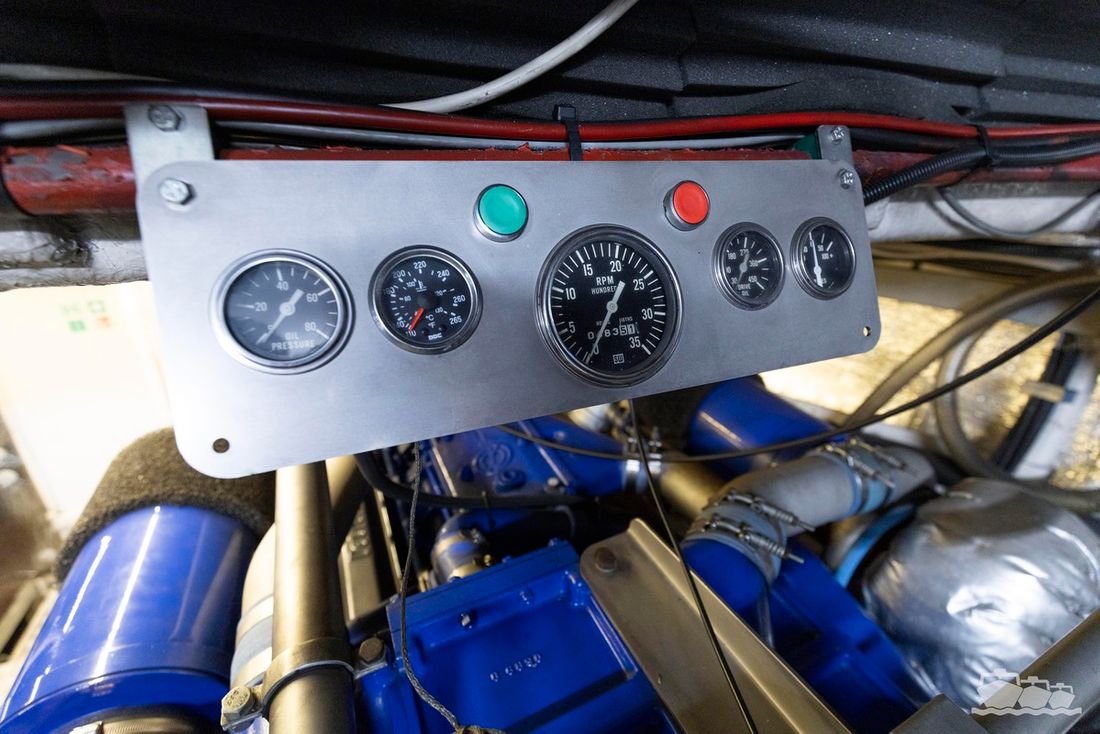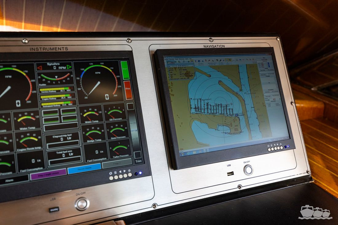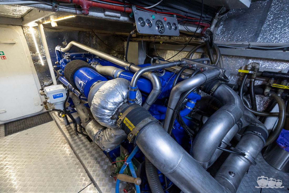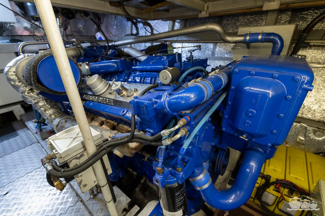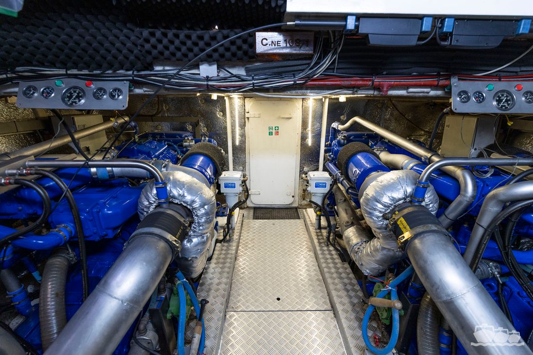 The two V12 diesel engines, each with 970 hp, have been completely overhauled and have only run for 485 hours since the overhaul. The standard engine control has been replaced by a fully electronic ?fly-by-wire? control system from Hydronautica. This system allows you to easily control the two bow thrusters, the stern thruster and both engines via a joystick on the dashboard or a wireless remote control, for example from the gangway or any other place on the ship.
