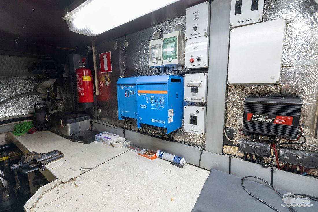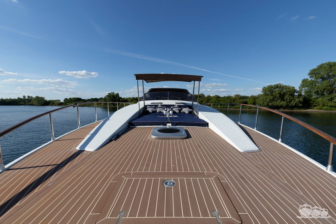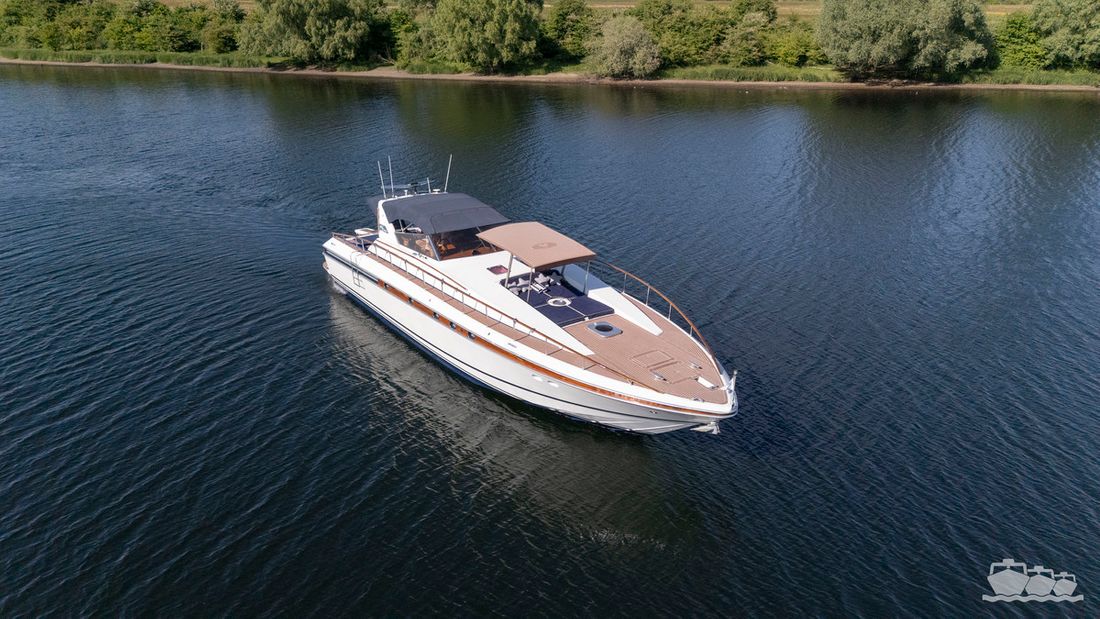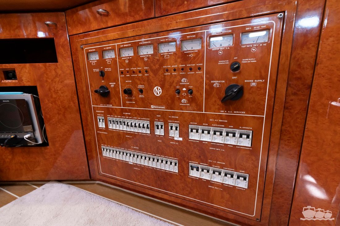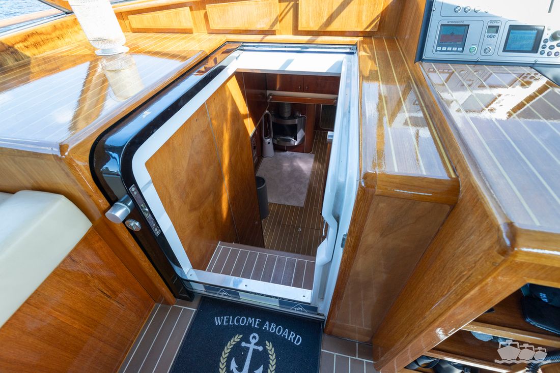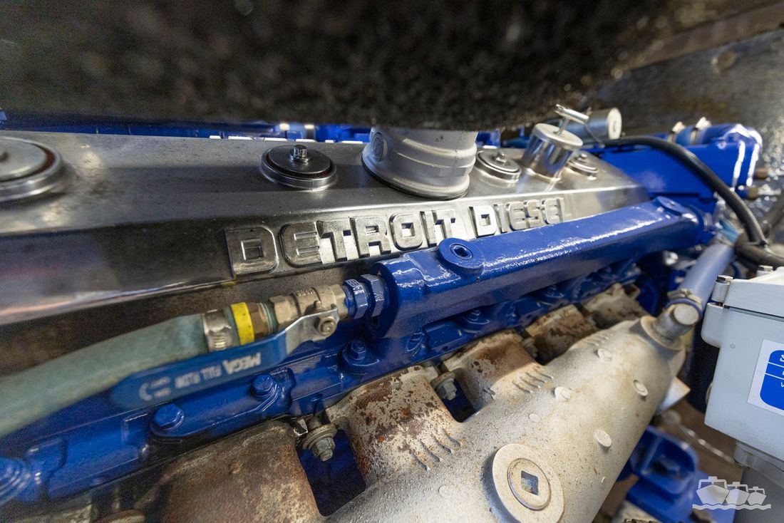 The two V12 diesel engines, each with 970 hp, have been completely overhauled and have only run for 485 hours since the overhaul. The standard engine control has been replaced by a fully electronic ?fly-by-wire? control system from Hydronautica. This system allows you to easily control the two bow thrusters, the stern thruster and both engines via a joystick on the dashboard or a wireless remote control, for example from the gangway or any other place on the ship.