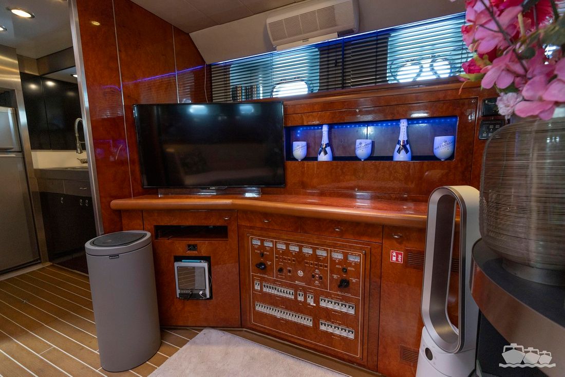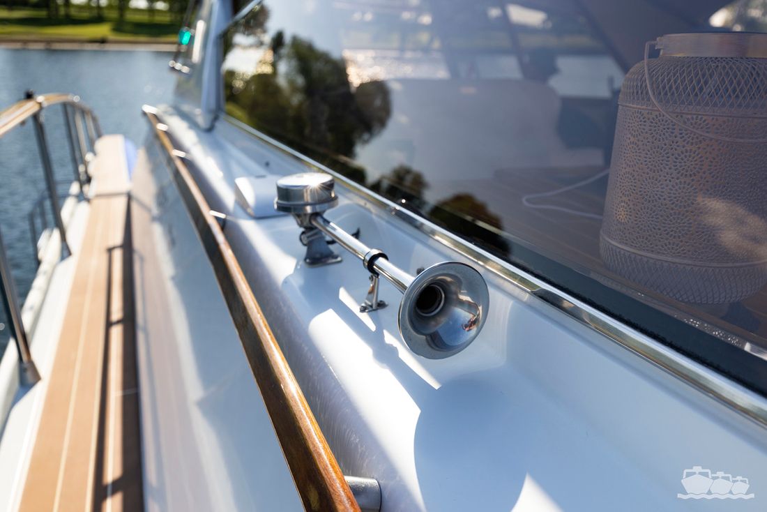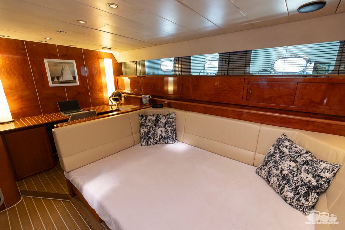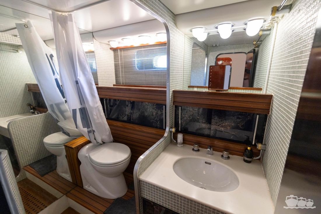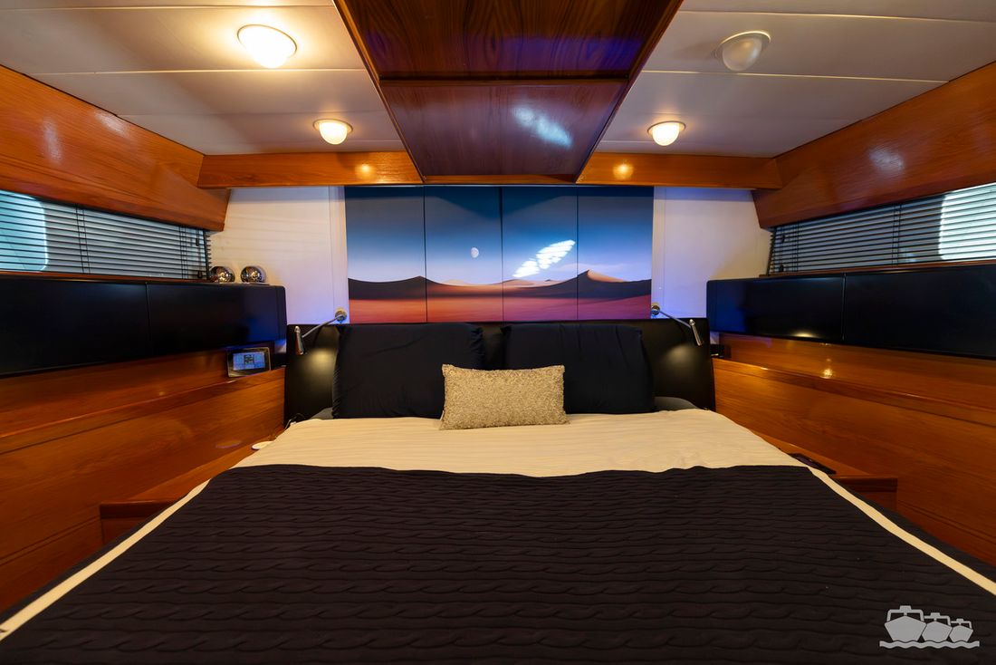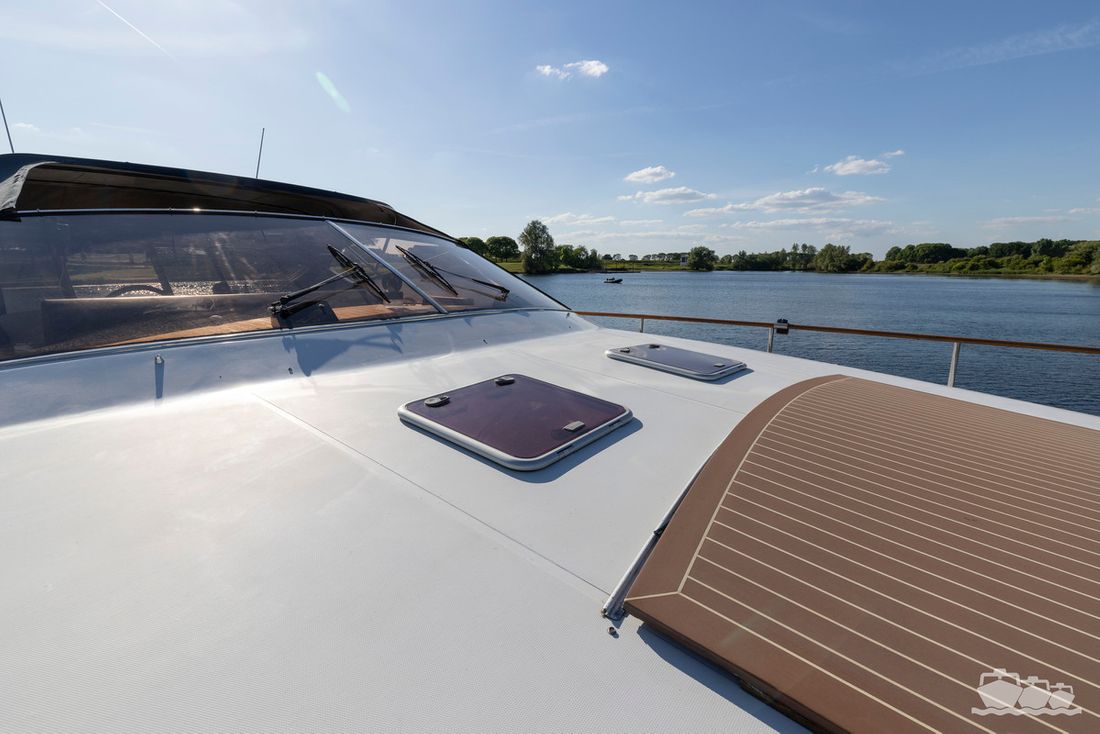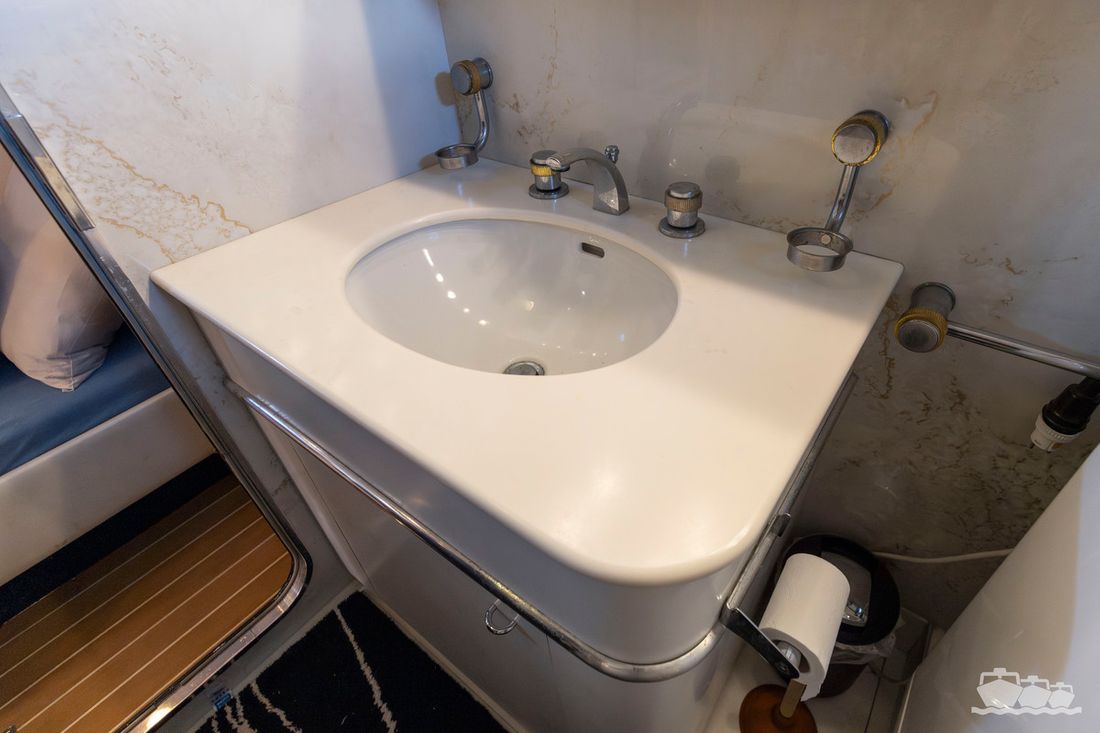 The two V12 diesel engines, each with 970 hp, have been completely overhauled and have only run for 485 hours since the overhaul. The standard engine control has been replaced by a fully electronic ?fly-by-wire? control system from Hydronautica. This system allows you to easily control the two bow thrusters, the stern thruster and both engines via a joystick on the dashboard or a wireless remote control, for example from the gangway or any other place on the ship.