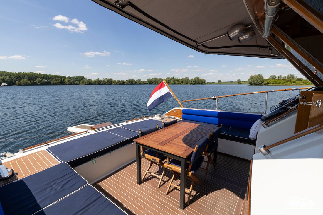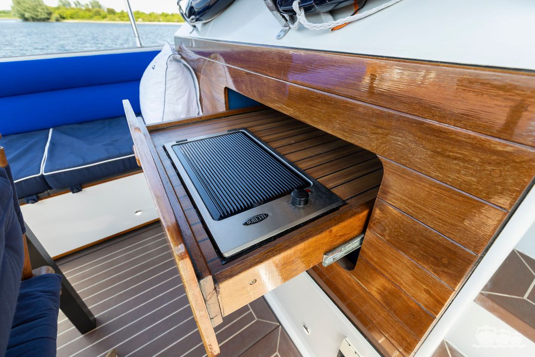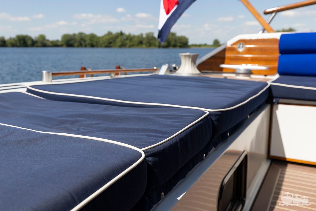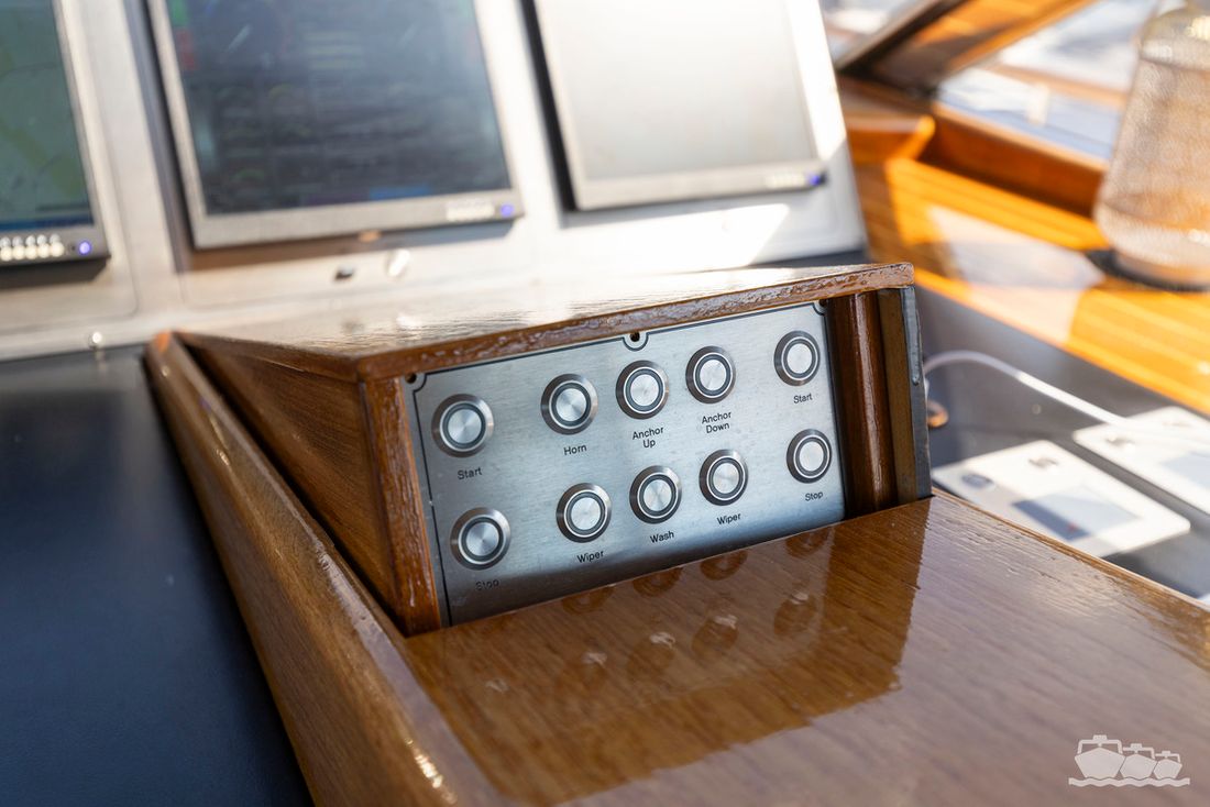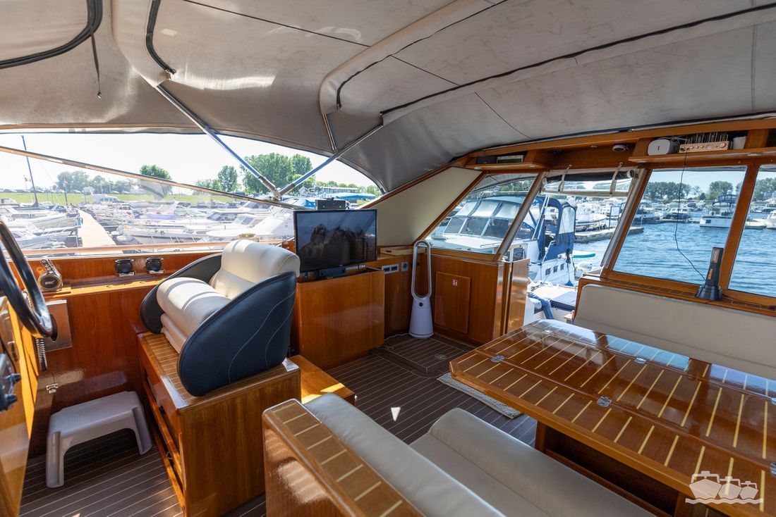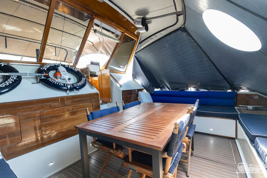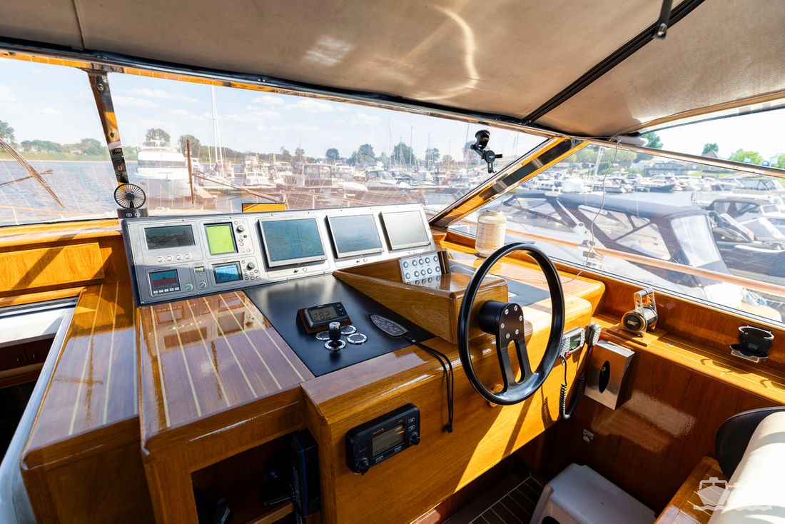 The entire dashboard has been renewed, with the old-fashioned dials replaced by digital screens and the switches replaced by modern push buttons. The list of innovations is not limited to technology, as the interior and exterior have also been completely refurbished. Among other things, all decks have been fitted with Flexiteek, the sprayhood has been renewed, a complete winter tent has been made and this spring the entire underwater hull has been stripped and fitted with new antifouling.
