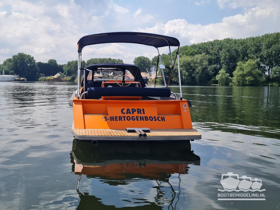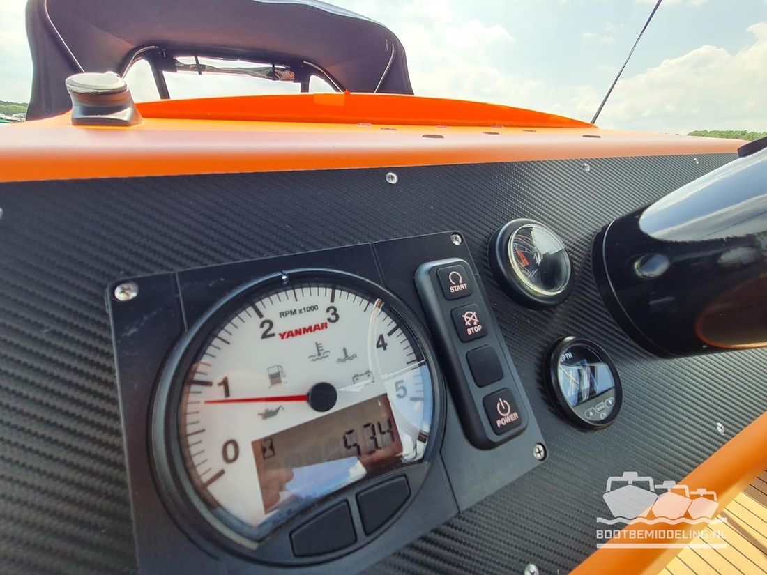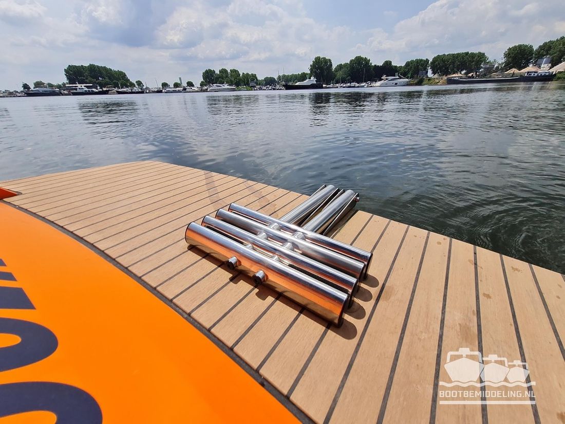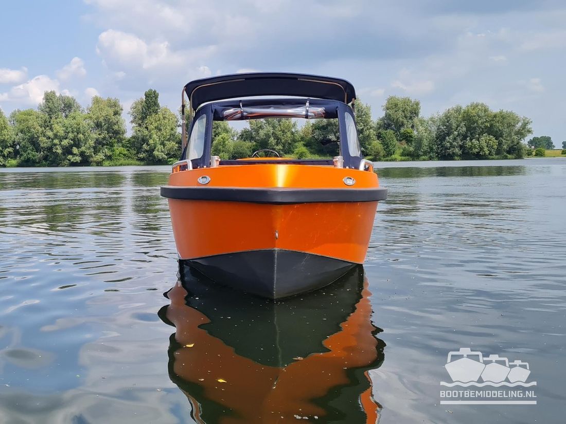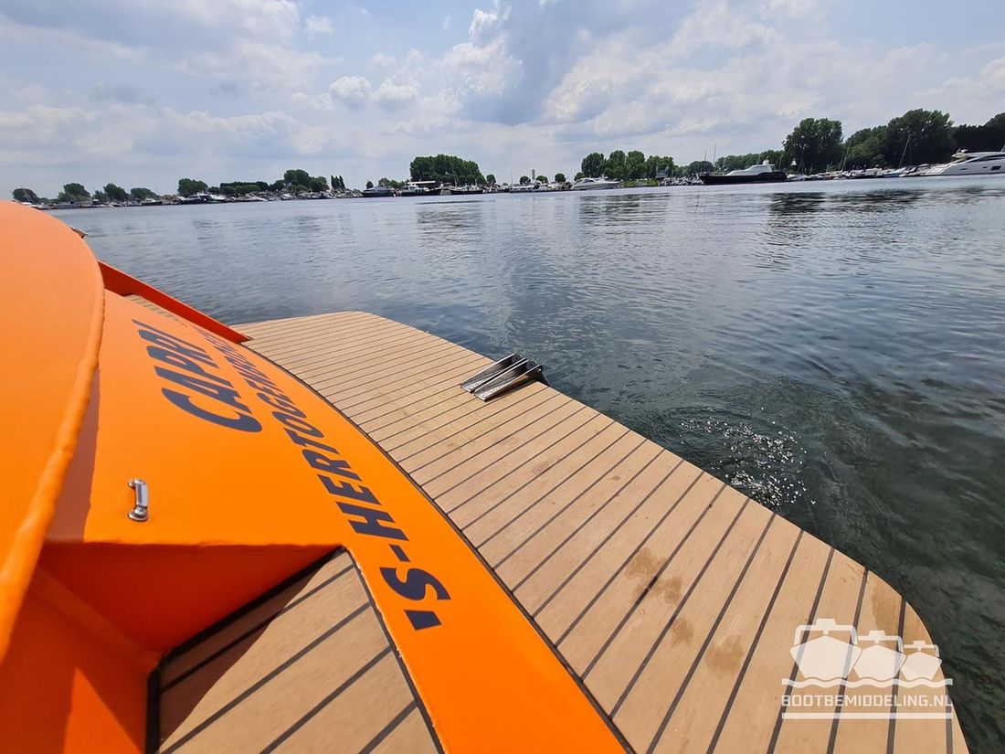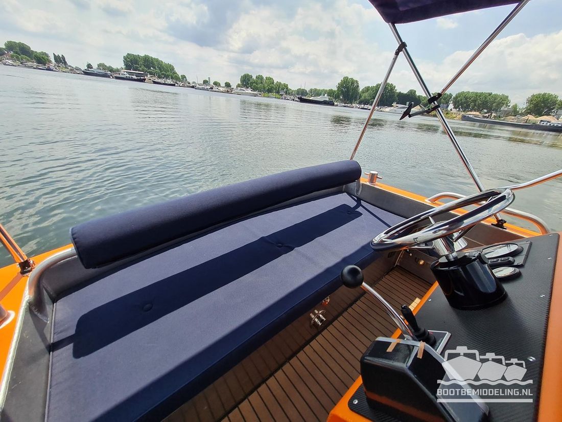 Delivered new Shipyard Alumax Boats, Meppel CE-category C CE max weight 665 kg Passenger capacity 8 Hull deck superstructure Hull shape v-bottom Comments Hull shape with spray rail Hull colour orange Deck colour orange Deck construction aluminium Comments Deck construction plastic teak deck in boat and on swimming platform Dimensions and weights Comments Vertical clearance without hood Steering and Drift Limitation Steering system wheel Comments Steering system hydraulic Position steering system outside control Rudder single -