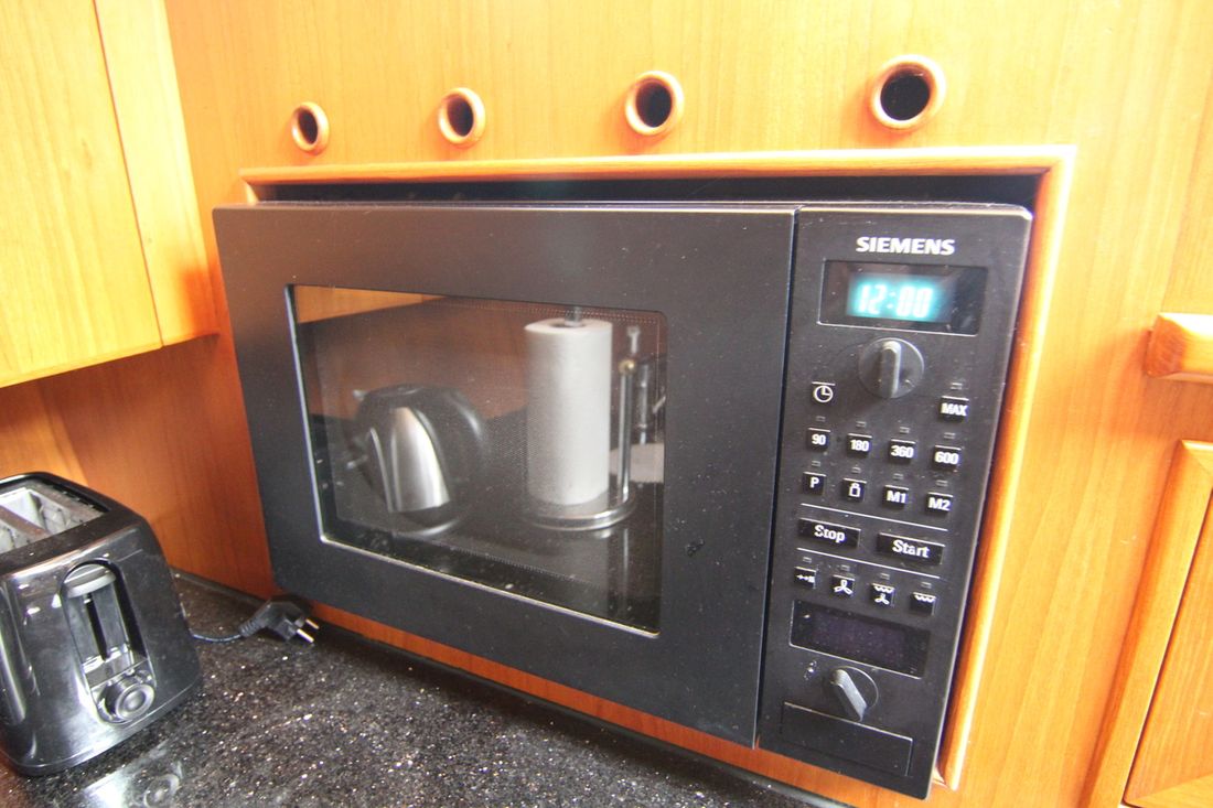The spacious saloon invites you to convivial moments and offers comfortable seating for relaxing after a day on the water. The galley is fully equipped, with four electric cooktops, an oven, and a refrigerator, so you can prepare delicious meals during your boating adventure.