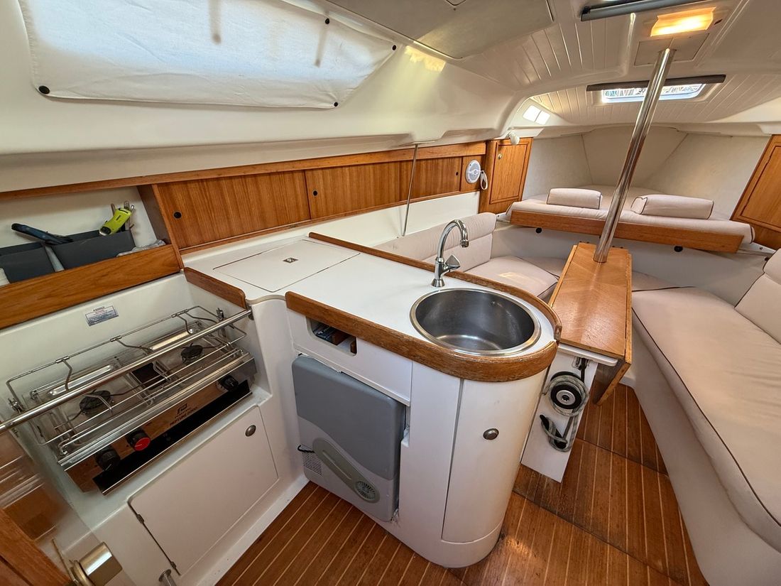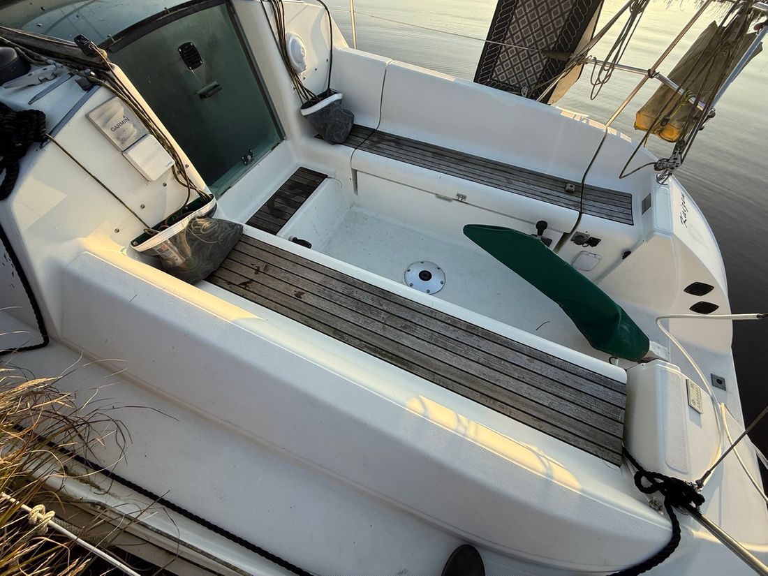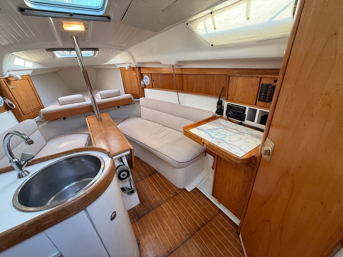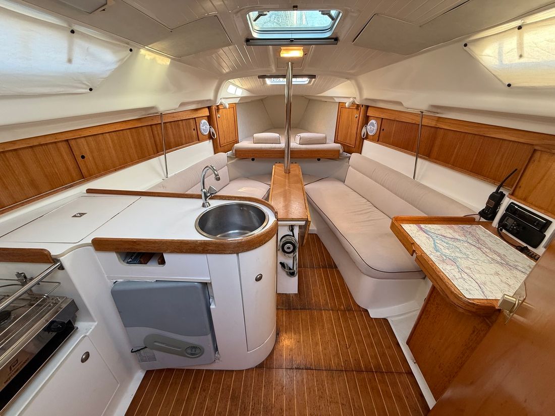 Delivered new Designer Philippe Briand Shipyard Jeanneau (Les Herbiers, Frankrijk) Hull deck superstructure Hull shape roundbilge Hull colour white Deck colour white Deck construction grp (polyester) Cockpit aft cockpit Steering and Drift Limitation Steering system helm Rudder single Keel/Lee board keel/centerboard Drift restriction controls manual -