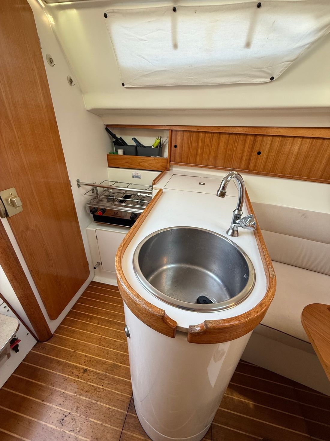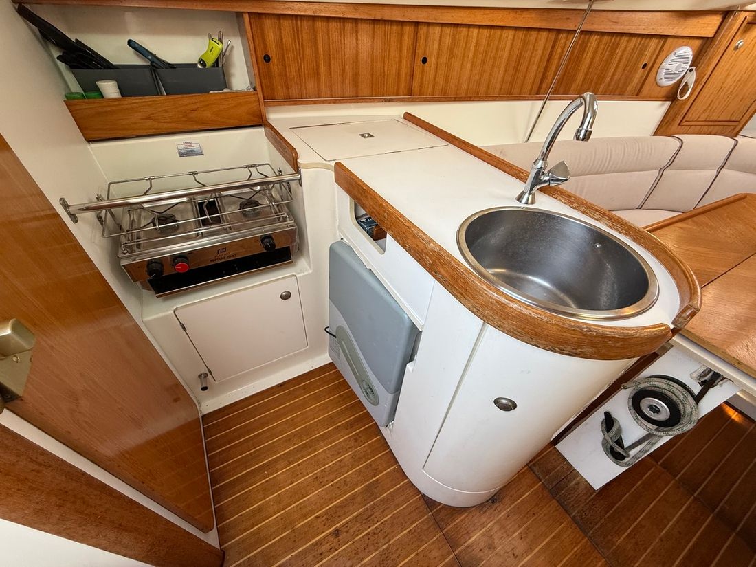 Spaces Saloon Separate Dining area Cabins 1 Saloon Decoration Type interior Modern, wood look Color upholstery beige Mattresses Cushions Curtains Water Water tank & material Capacity 100 litre Inhoud 80 litre Waste water tank material plastic Waste water tank Water system pressure Plumbing Toilets 1 Manual Entertainment Radio/CD player Kitchen Cooker & fuel Number 2 Fridge & power source Climate control hot air -