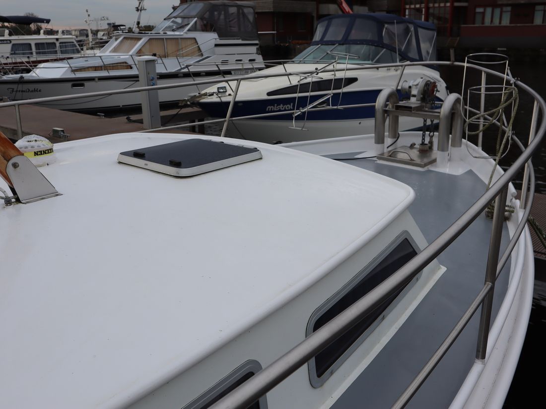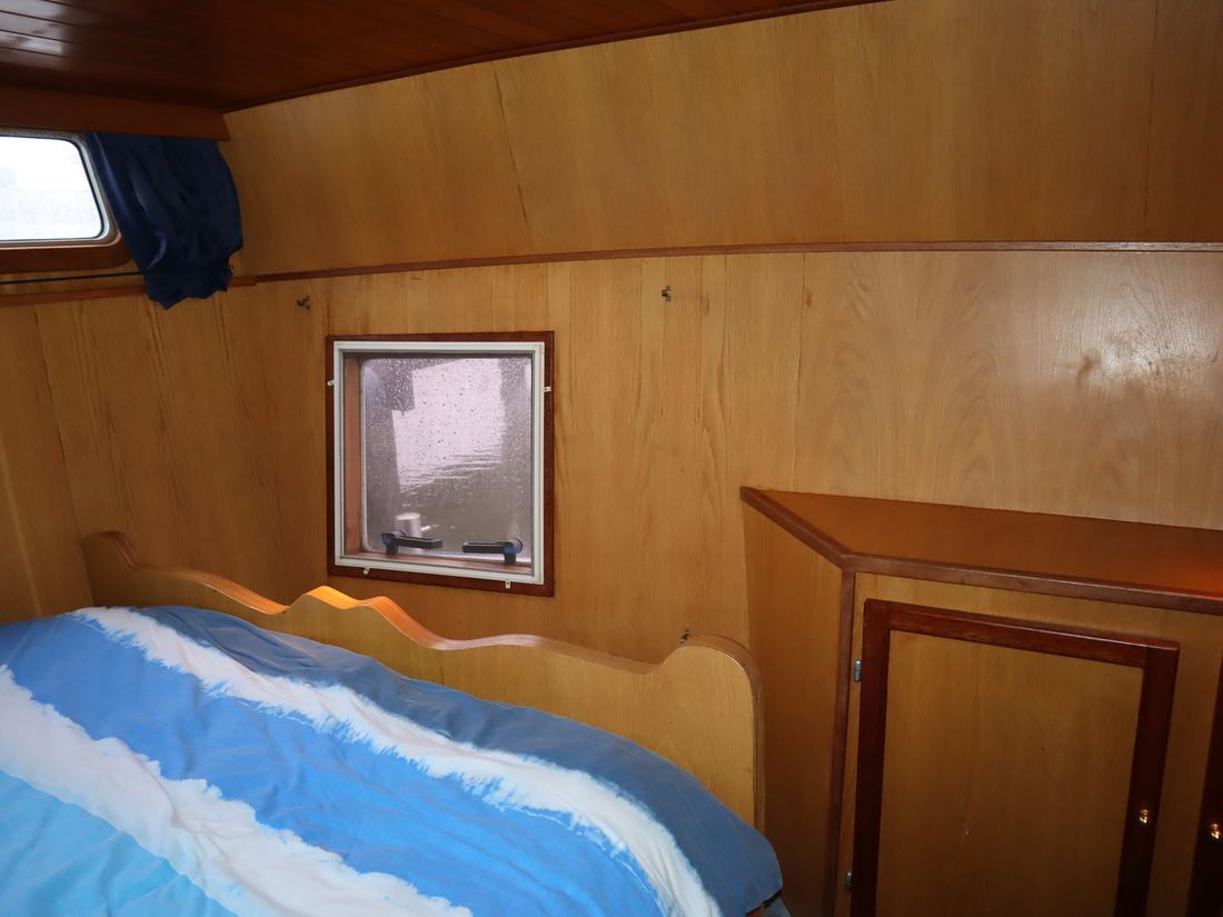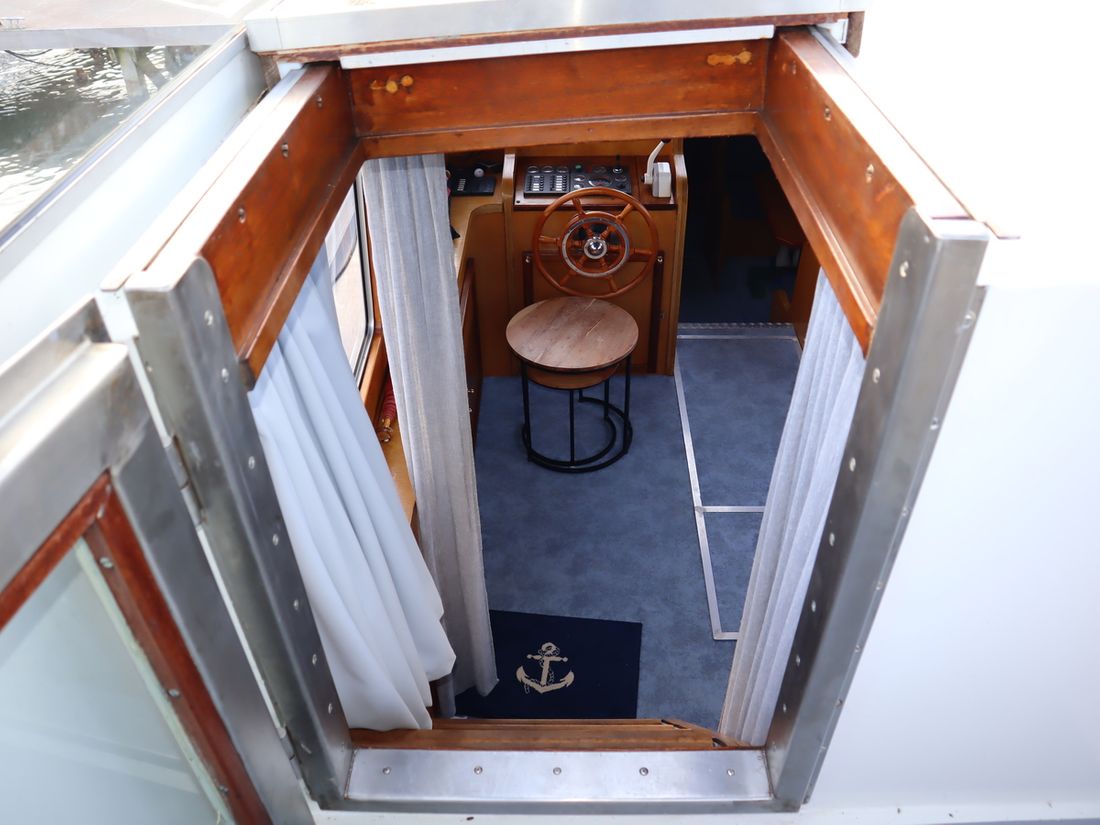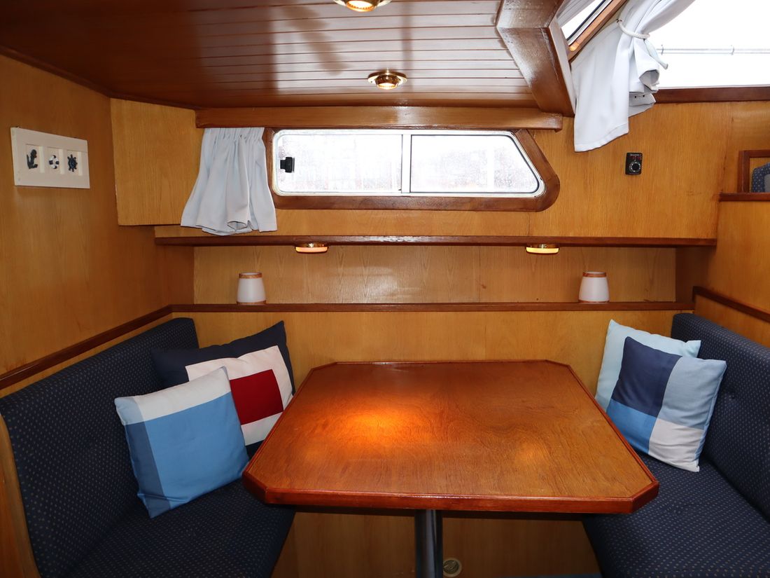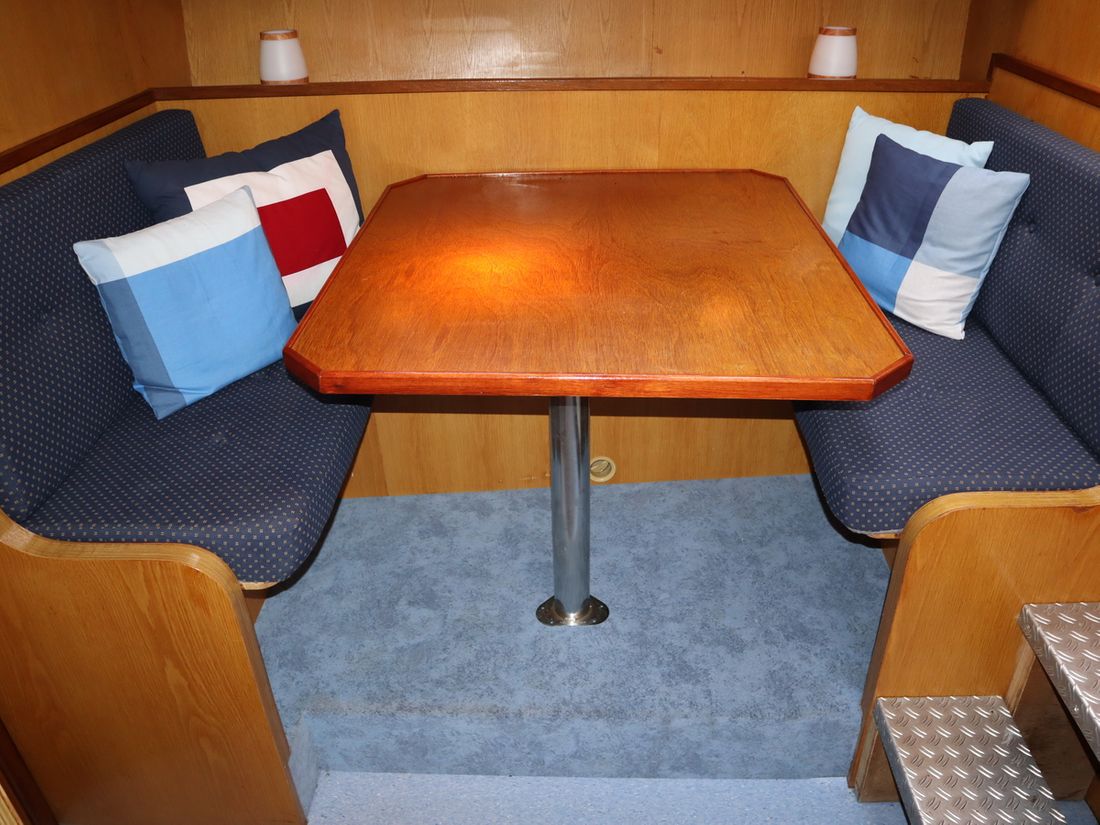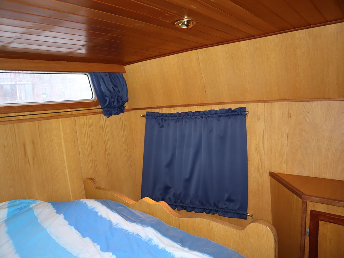 This robustly built steel cruiser is ideal for those looking for a sturdy yet charming boat. The boat's solid construction is immediately noticeable upon stepping aboard. The headroom is 1.90m almost everywhere, with the exception of the aft cabin, which is 1.80m. This boat is perfect for wonderful weekend getaways. Living aboard is also an option. The boat's amenities include four berths, a galley, saloon, shower, toilet, heating, a mechanical anchor, and a bow thruster.