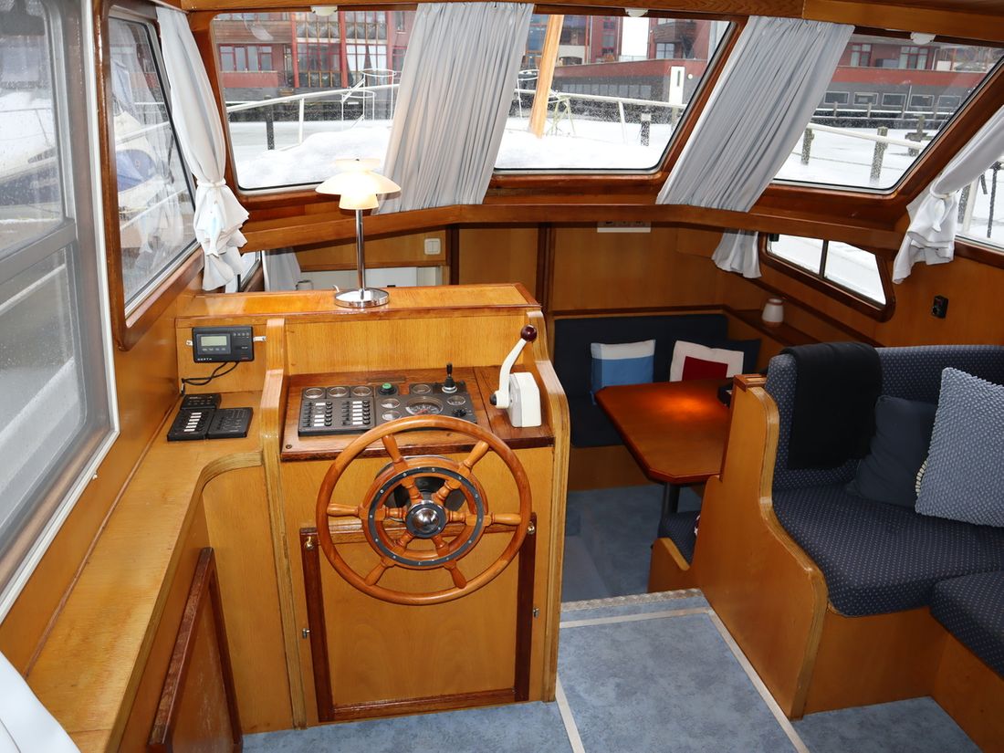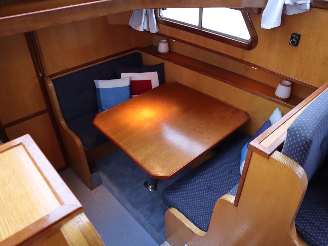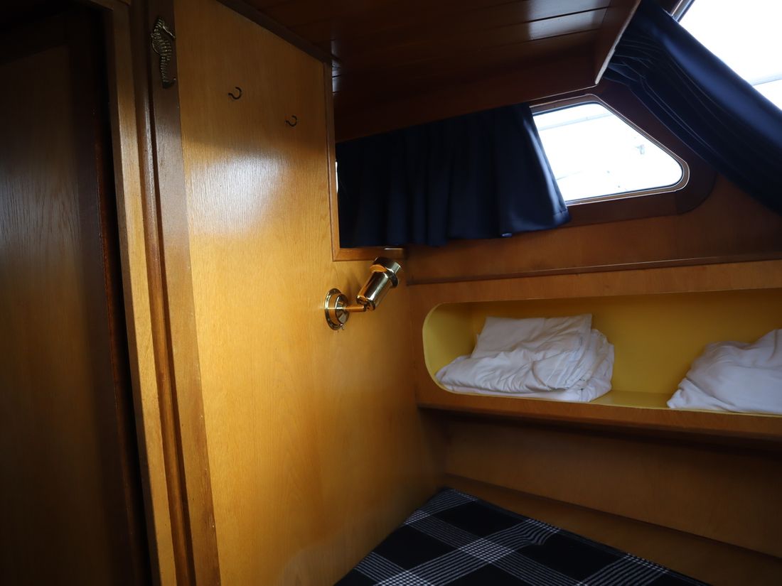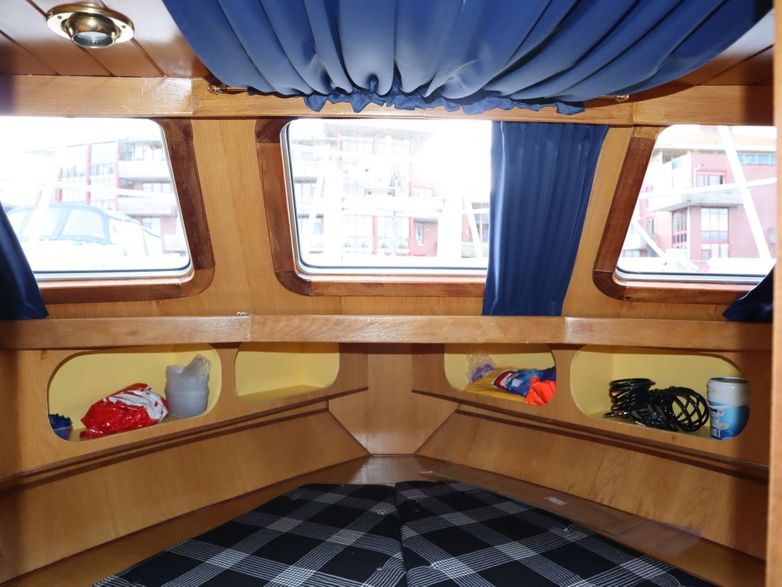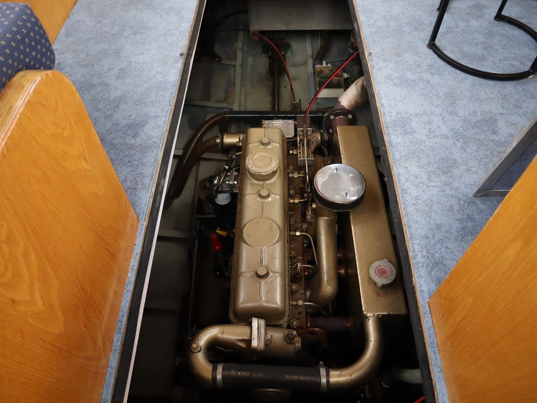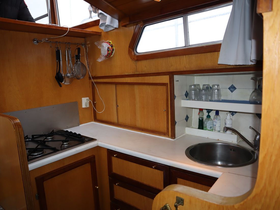 This robustly built steel cruiser is ideal for those looking for a sturdy yet charming boat. The boat's solid construction is immediately noticeable upon stepping aboard. The headroom is 1.90m almost everywhere, with the exception of the aft cabin, which is 1.80m. This boat is perfect for wonderful weekend getaways. Living aboard is also an option. The boat's amenities include four berths, a galley, saloon, shower, toilet, heating, a mechanical anchor, and a bow thruster.