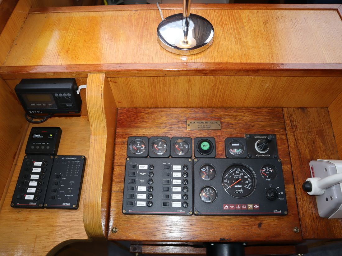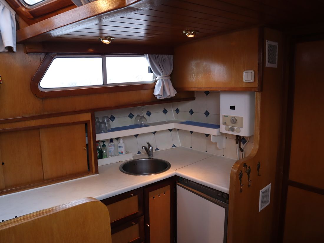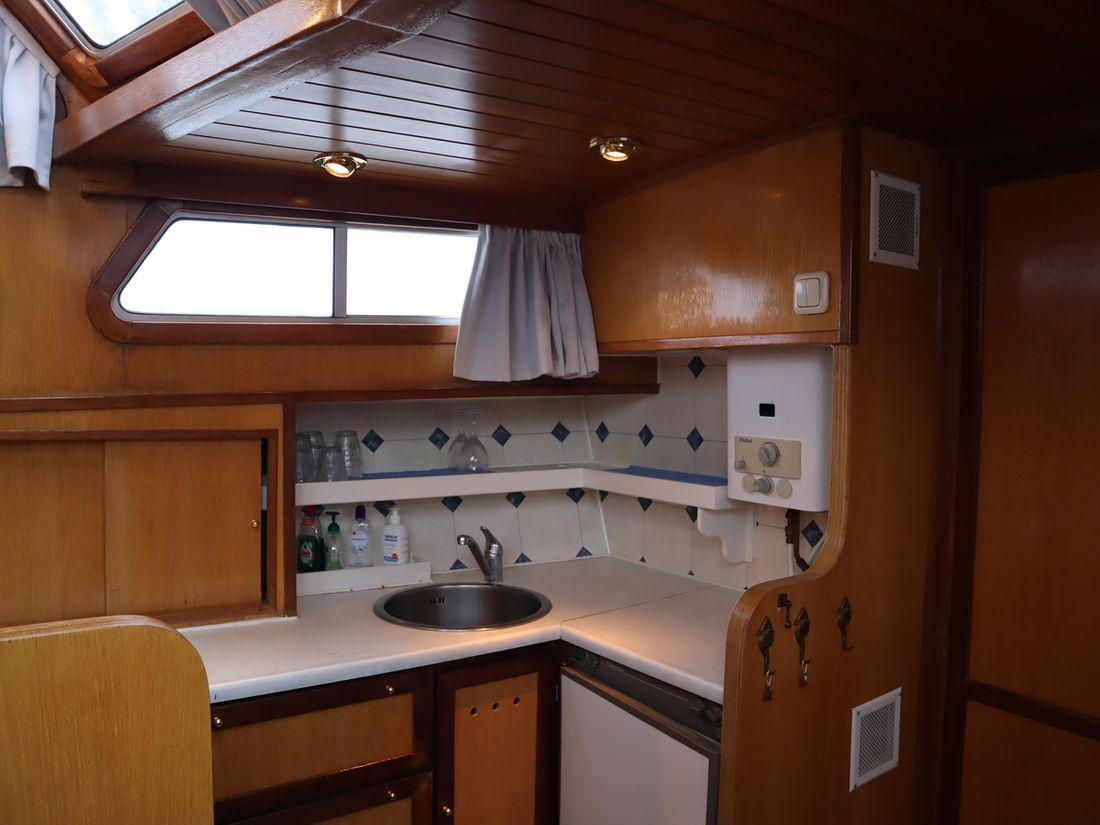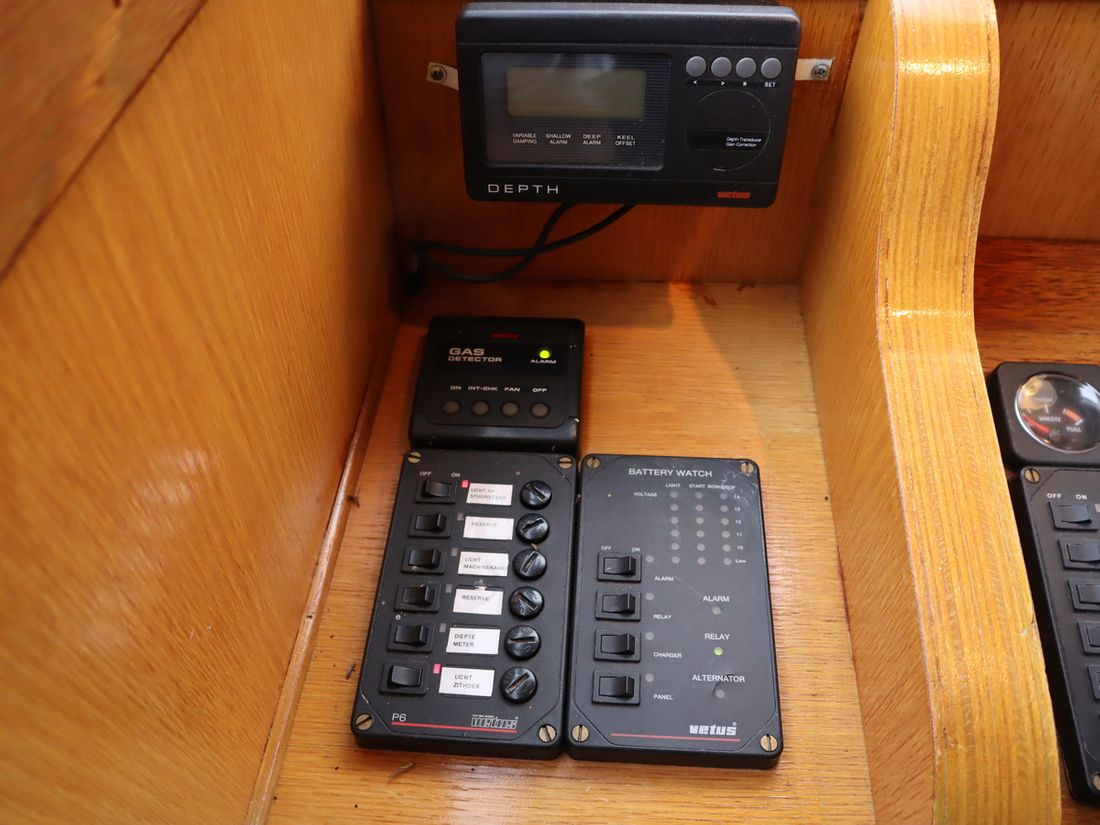 Spaces Saloon Separate Dining area Cabins 2 Saloon Decoration Type interior Classic, warm Color upholstery blue Mattresses Curtains Water Water tank & material Capacity 600 litre Water tank material stainless steel Water tank gauge Inhoud 100 litre Waste water tank Waste water tank gauge Waste water tank drainpump Water system pressure Hot water Comments Hot water Geyser Deck Shower Plumbing Number of showers 1 Comments Number of showers Out of order Toilets 1 Electric Kitchen Cooker & fuel Number 4 Cooking fuel gas Fridge & power source Power source gas + electric Climate control Comments Heating Gas / electric -