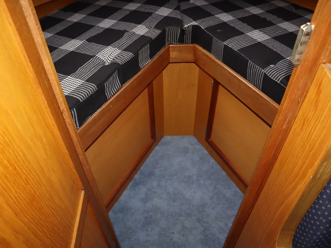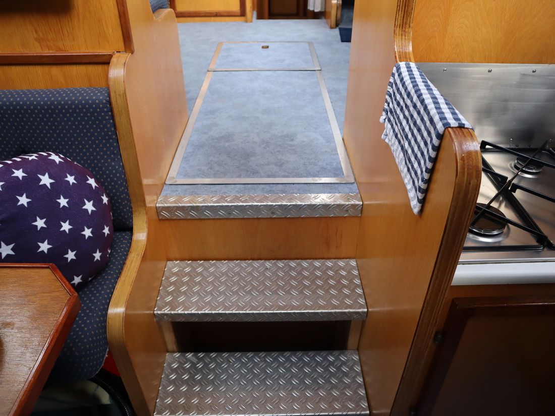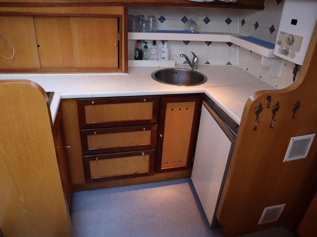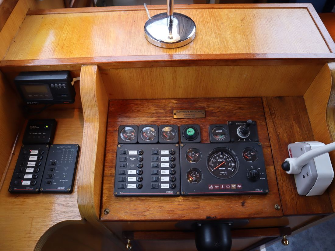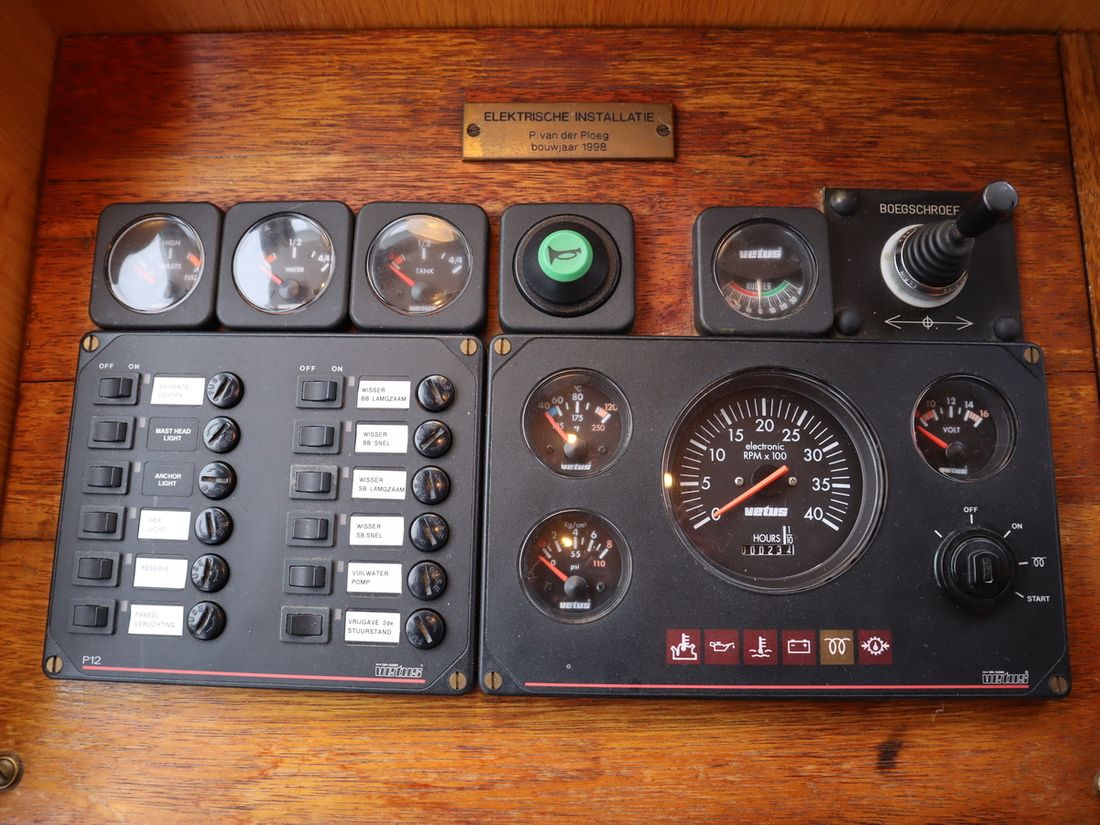 Spaces Saloon Separate Dining area Cabins 2 Saloon Decoration Type interior Classic, warm Color upholstery blue Mattresses Curtains Water Water tank & material Capacity 600 litre Water tank material stainless steel Water tank gauge Inhoud 100 litre Waste water tank Waste water tank gauge Waste water tank drainpump Water system pressure Hot water Comments Hot water Geyser Deck Shower Plumbing Number of showers 1 Comments Number of showers Out of order Toilets 1 Electric Kitchen Cooker & fuel Number 4 Cooking fuel gas Fridge & power source Power source gas + electric Climate control Comments Heating Gas / electric -
