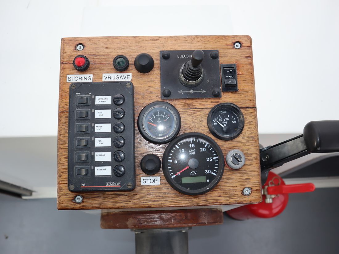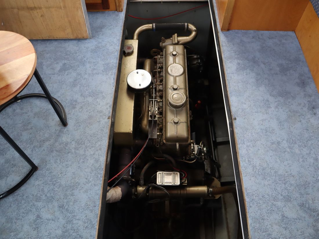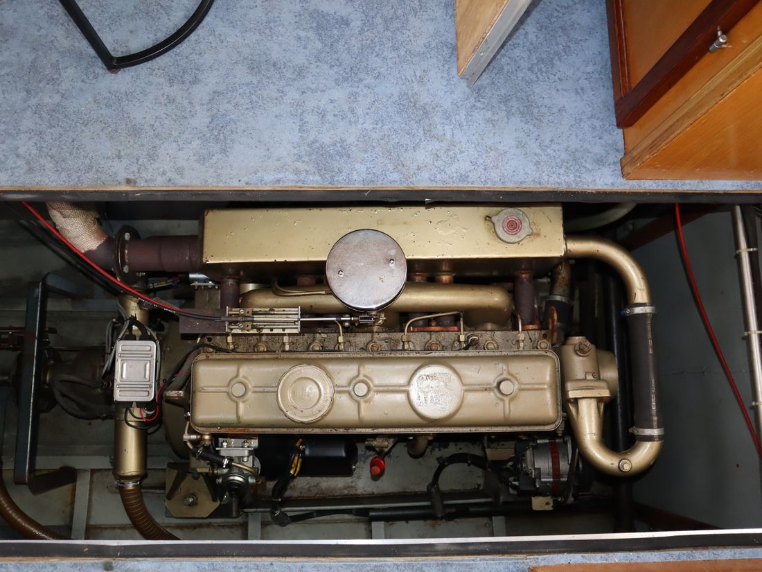 Engines Number of identical engines 1 Starting type electric Main engine Type inboard Brand DAF 575 Model 575 Comments Year Unknown Number of cylinders 6 Power 120 hp Hours counter Comments Engine hours unknown Fuel diesel Fuel consumption 6 litre/hour Brand gearbox Velvet Drive Drive Transmission shaft Propulsion propellor Cooling system direct Tank Fuel tanks Total fuel tank(s) capacity 400 litre Fuel tank material steel Performance Max speed 15 km/h Cruising speed 11 km/h Measuring instruments Fuel tank gauge Tachometer Oil pressure gauge Temperature gauge Bow and stern thruster Bow thruster electric Electricity Battery Comments Battery 3 x 200 ah, 6 years old Number 3 xAh per battery 200 Battery charger Alternator Inverter Voltmeter Shore power Shore power cable Consumption monitor 12V 220V -