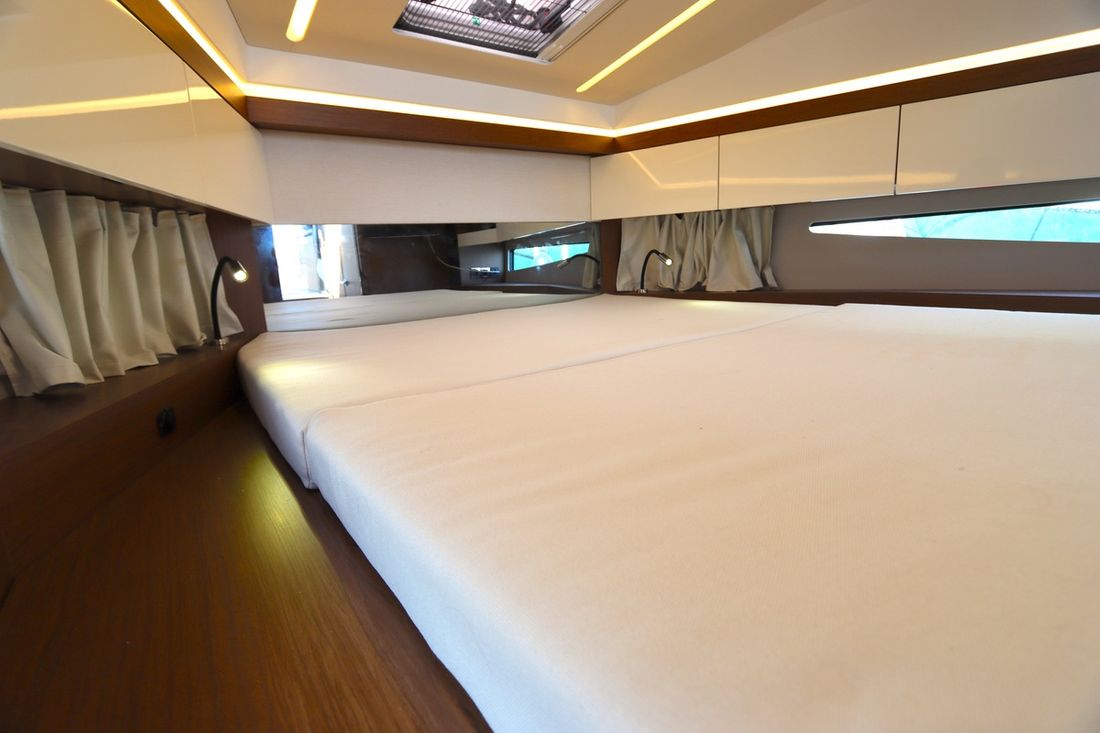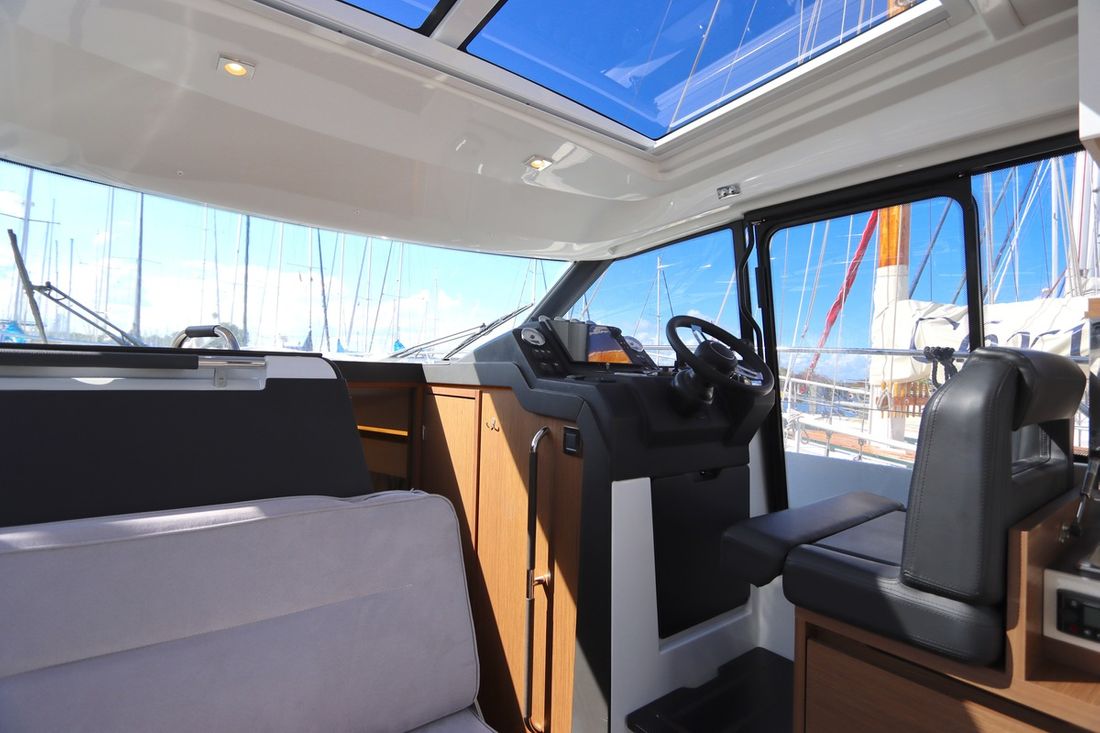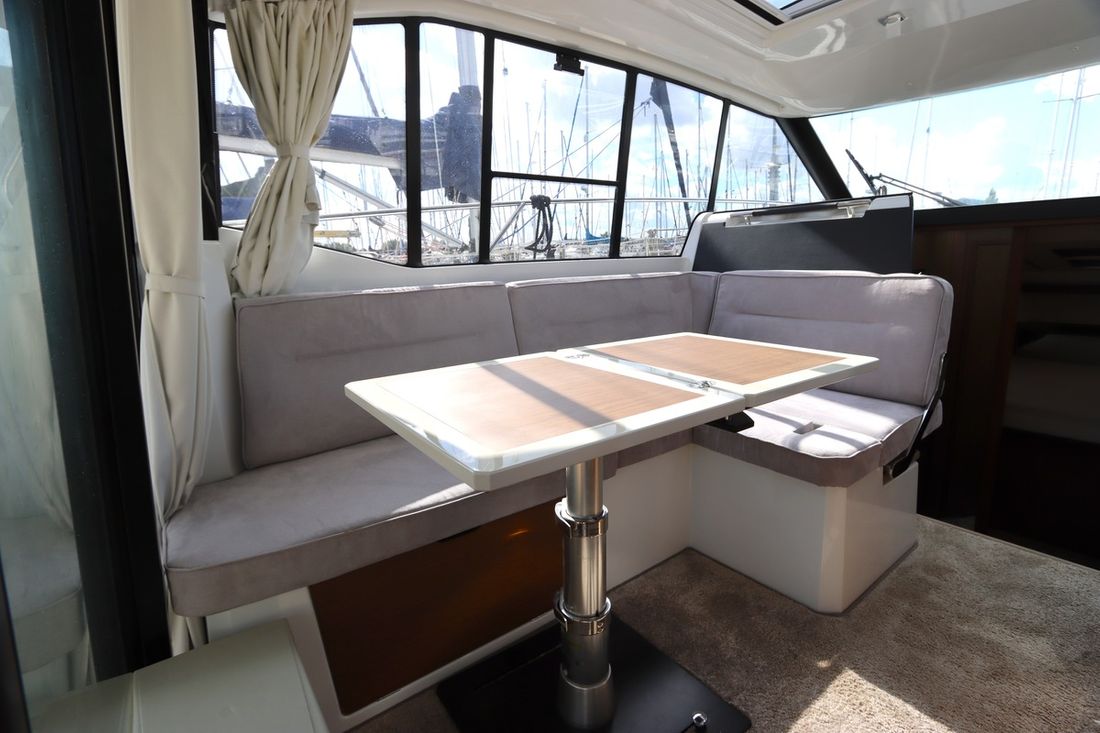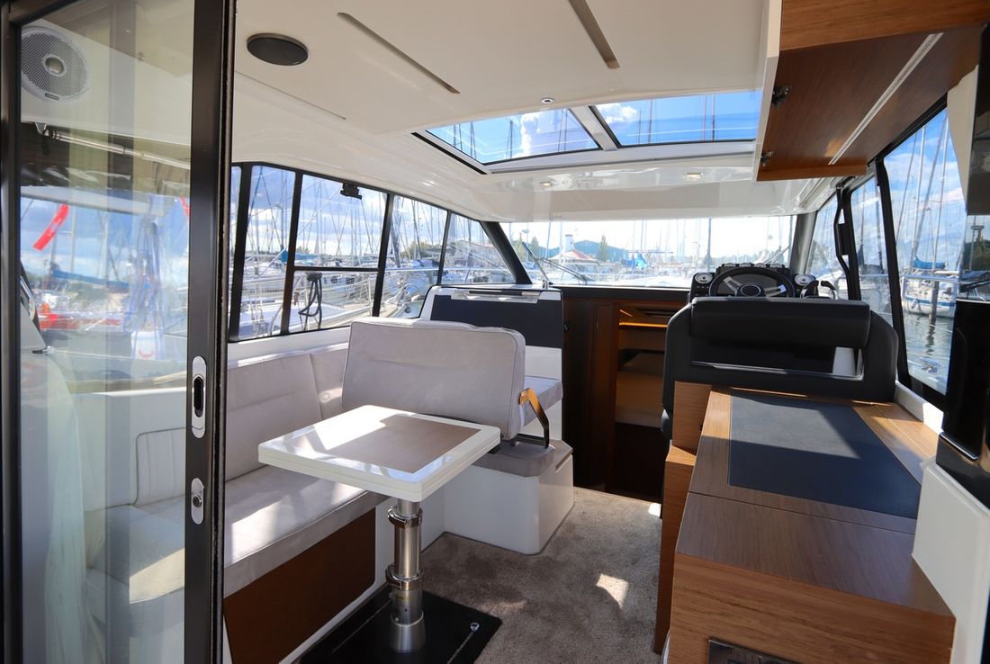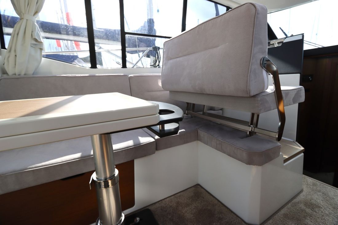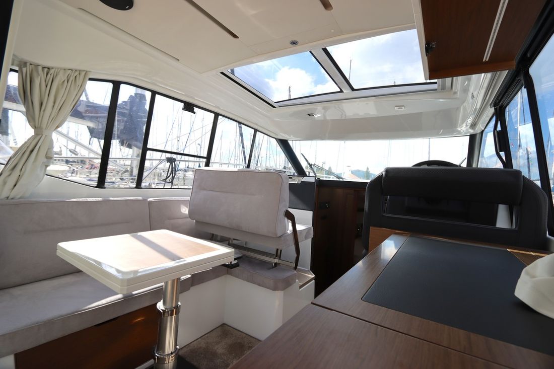 At 10.5 meters long, 3.27 meters wide, and with a draft of 0.96 meters, she offers ample comfort, both inside and out. On board are two powerful Volvo D3 engines, each developing 220 hp, with joystick controls, ensuring effortless maneuvering and excellent performance. Built by Jeanneau, the boat features a stable V-shaped polyester hull, ensuring smooth and safe sailing. The saloon is bright and modern, with Pearl Grey upholstery, an electric sliding roof, and a seating area that easily converts into a sunbed or additional berth.