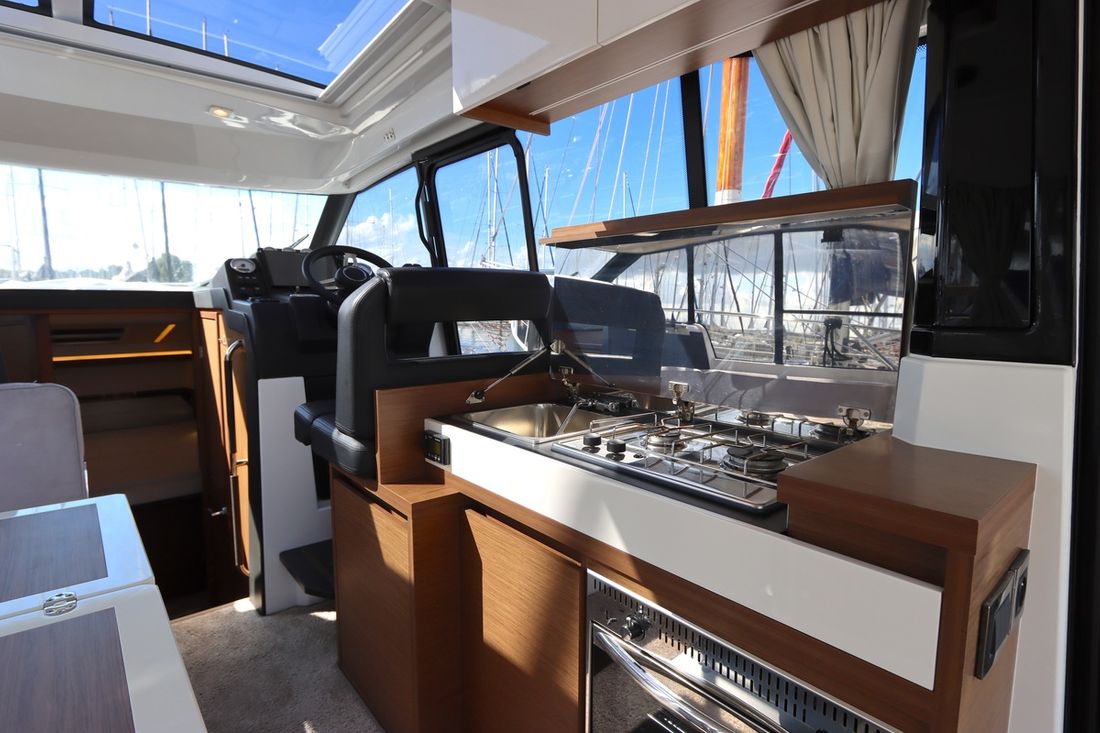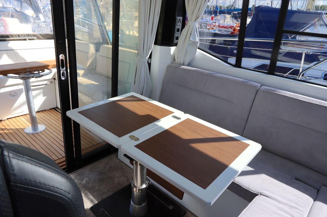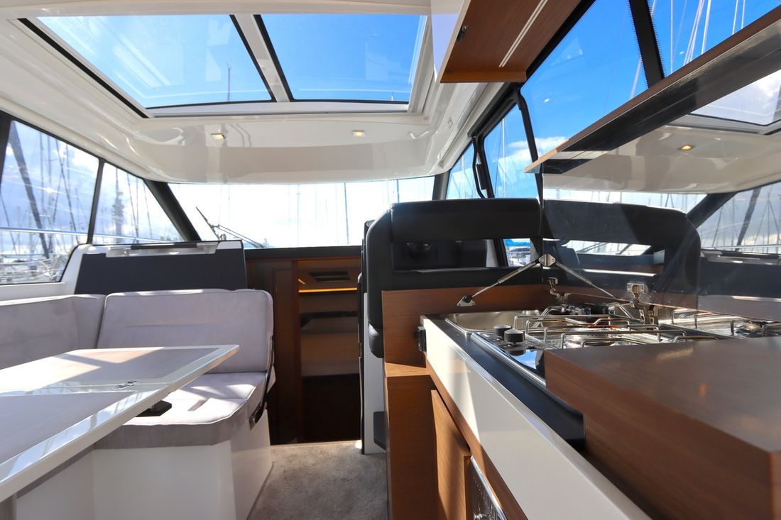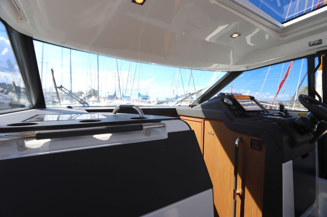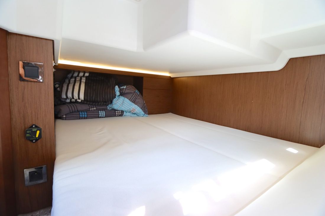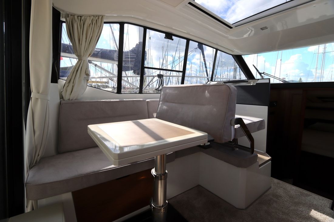 At 10.5 meters long, 3.27 meters wide, and with a draft of 0.96 meters, she offers ample comfort, both inside and out. On board are two powerful Volvo D3 engines, each developing 220 hp, with joystick controls, ensuring effortless maneuvering and excellent performance. Built by Jeanneau, the boat features a stable V-shaped polyester hull, ensuring smooth and safe sailing. The saloon is bright and modern, with Pearl Grey upholstery, an electric sliding roof, and a seating area that easily converts into a sunbed or additional berth.