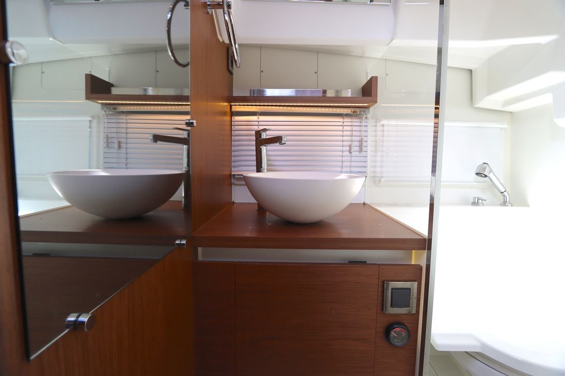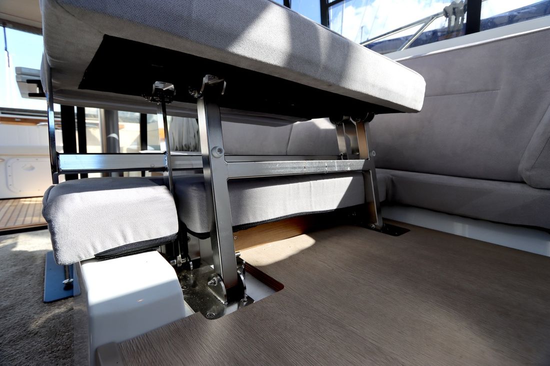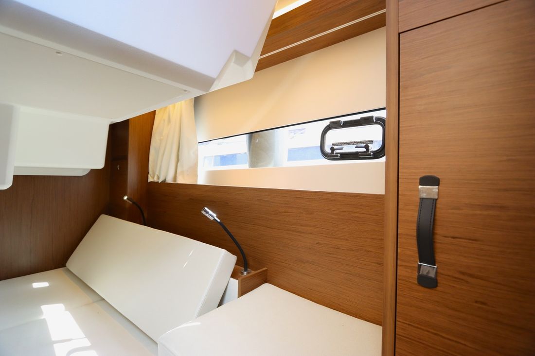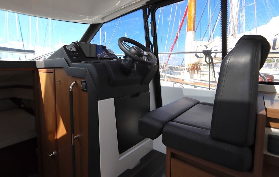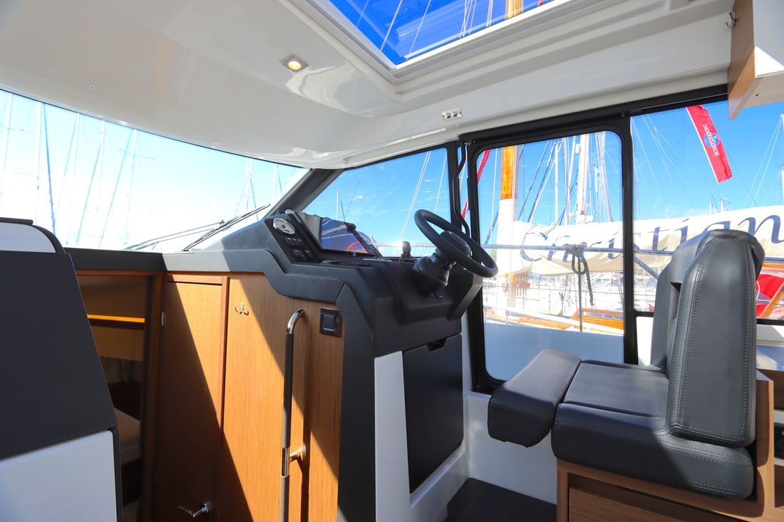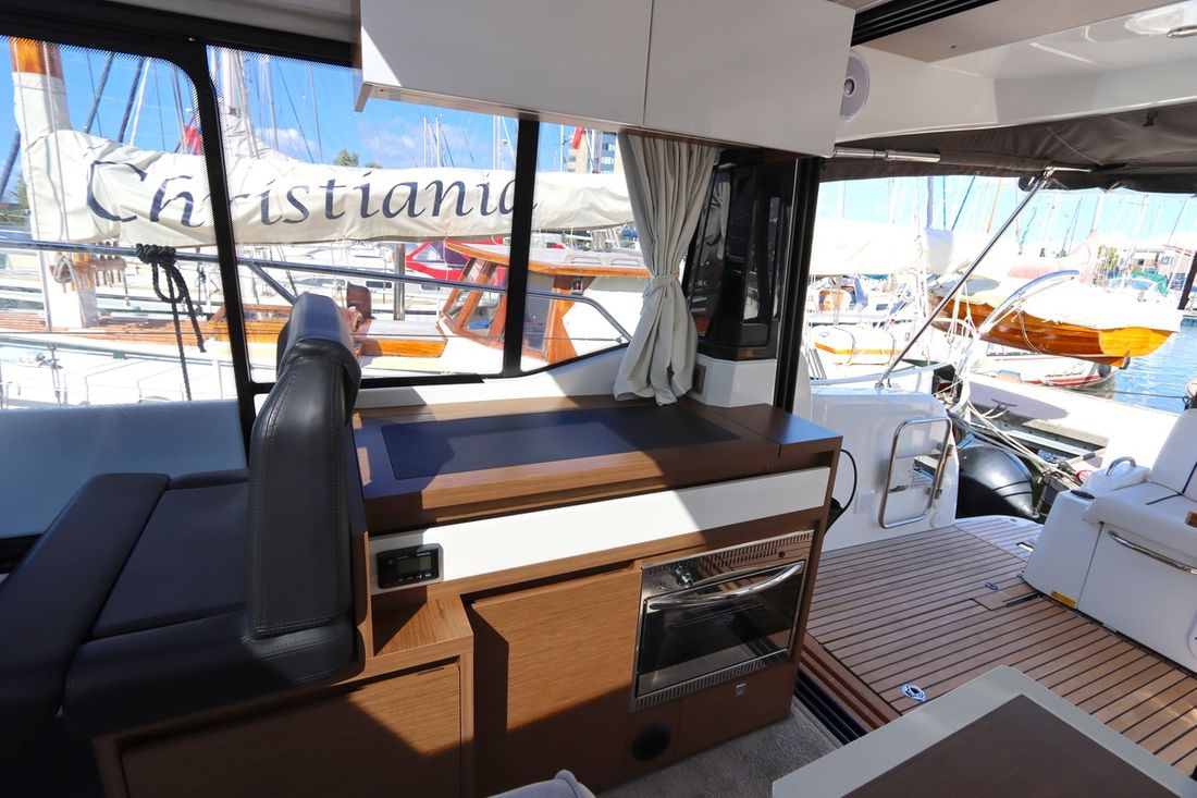 At 10.5 meters long, 3.27 meters wide, and with a draft of 0.96 meters, she offers ample comfort, both inside and out. On board are two powerful Volvo D3 engines, each developing 220 hp, with joystick controls, ensuring effortless maneuvering and excellent performance. Built by Jeanneau, the boat features a stable V-shaped polyester hull, ensuring smooth and safe sailing. The saloon is bright and modern, with Pearl Grey upholstery, an electric sliding roof, and a seating area that easily converts into a sunbed or additional berth.