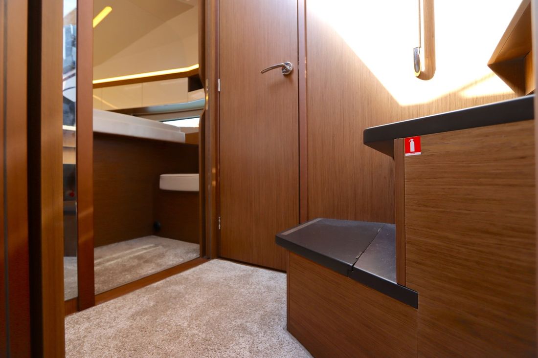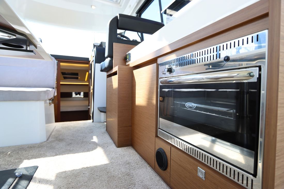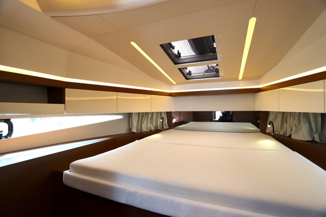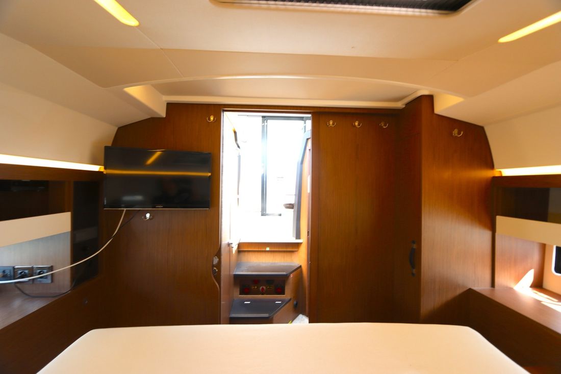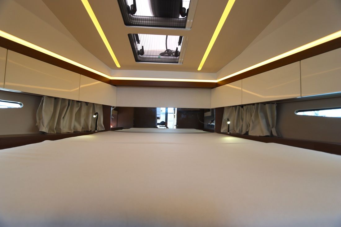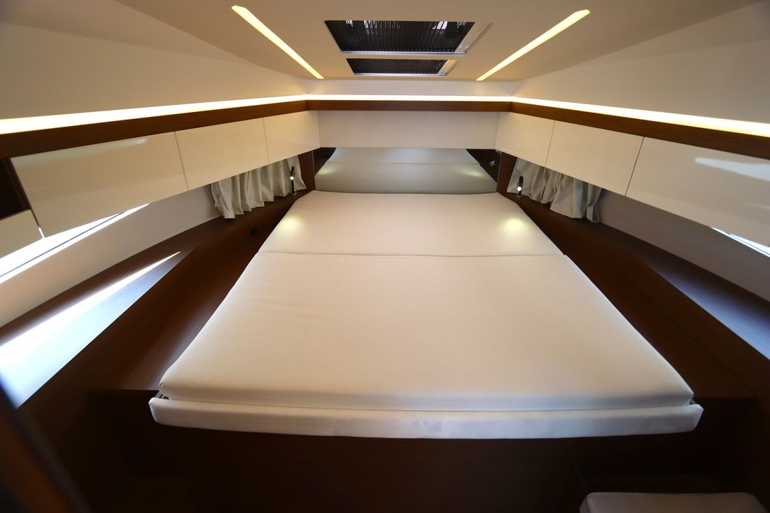 At 10.5 meters long, 3.27 meters wide, and with a draft of 0.96 meters, she offers ample comfort, both inside and out. On board are two powerful Volvo D3 engines, each developing 220 hp, with joystick controls, ensuring effortless maneuvering and excellent performance. Built by Jeanneau, the boat features a stable V-shaped polyester hull, ensuring smooth and safe sailing. The saloon is bright and modern, with Pearl Grey upholstery, an electric sliding roof, and a seating area that easily converts into a sunbed or additional berth.