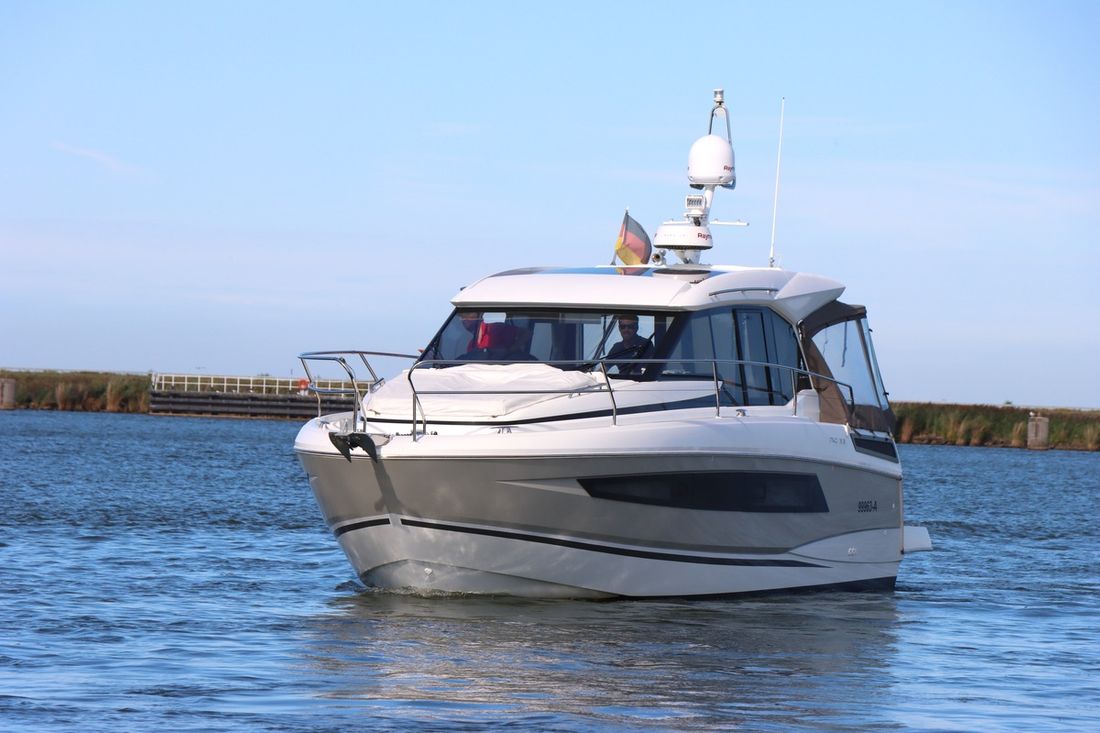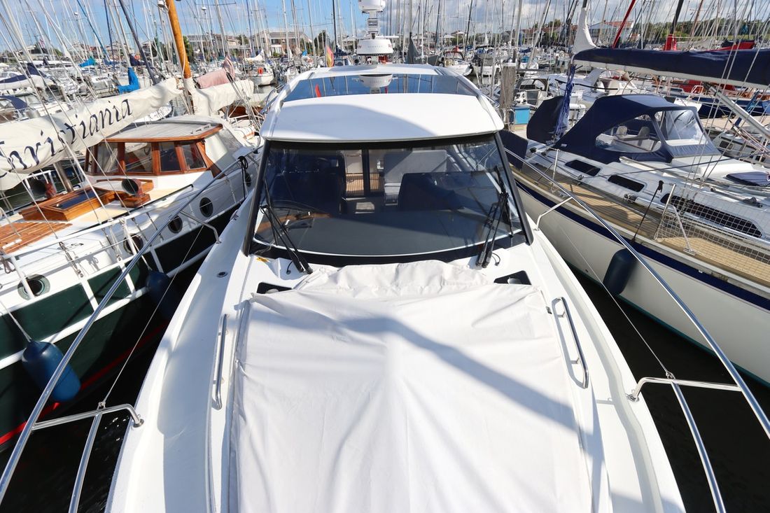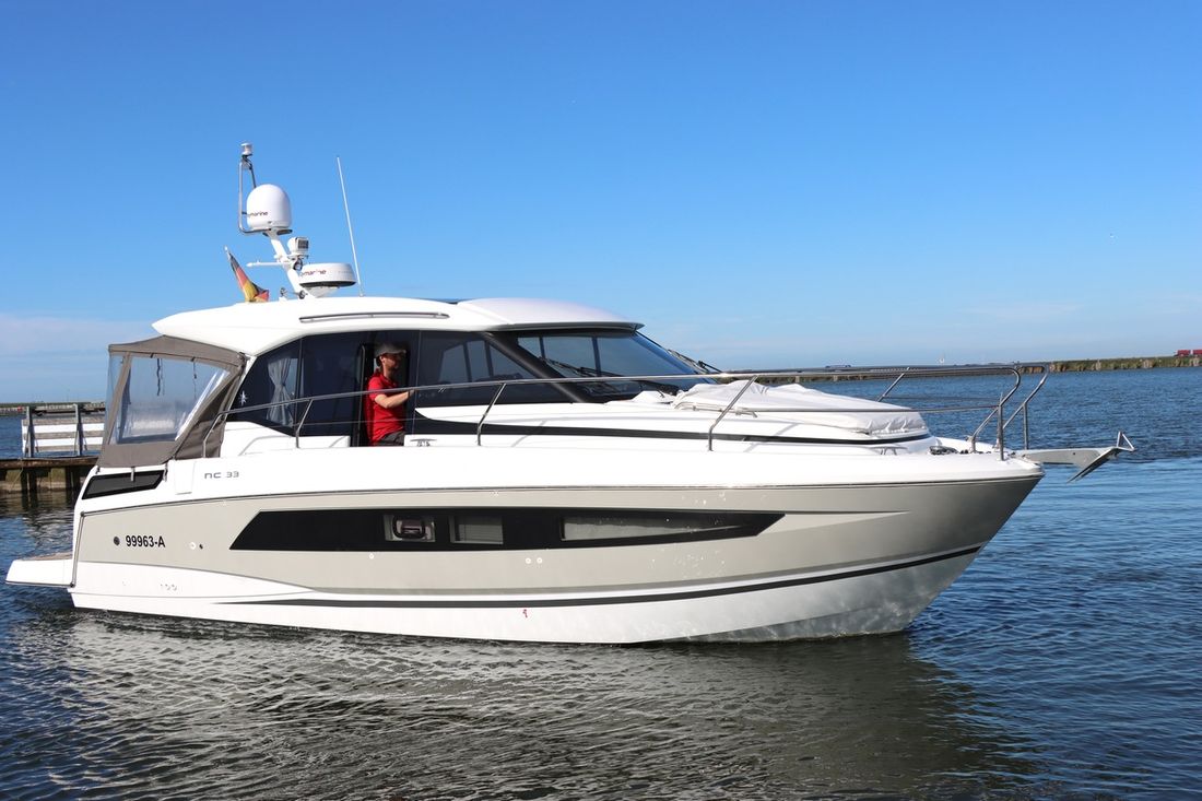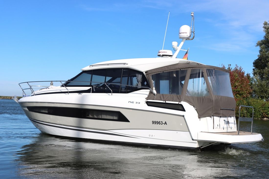 With an electric anchor winch, cockpit tent, swim platform and complete safety equipment, this Jeanneau NC 33 is completely ready to sail.