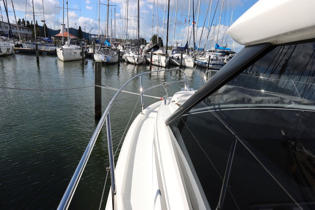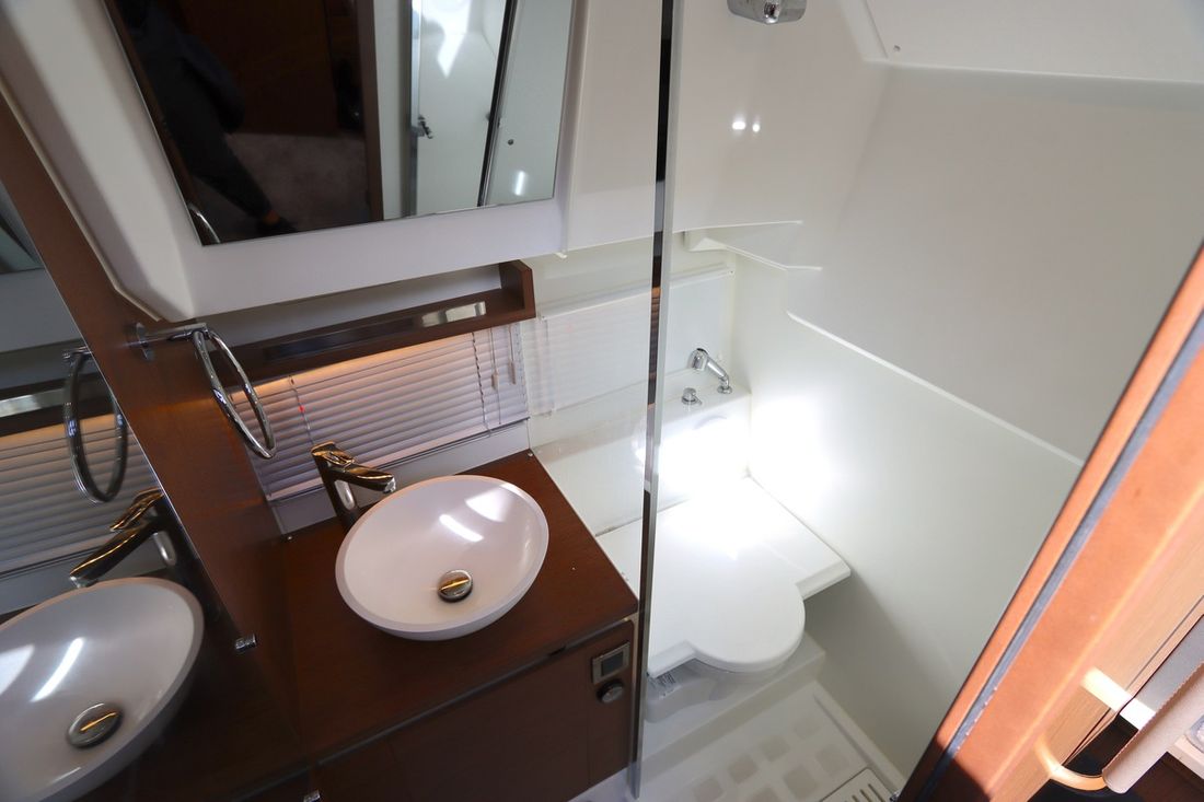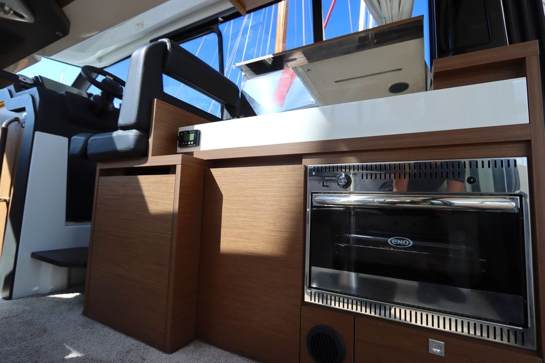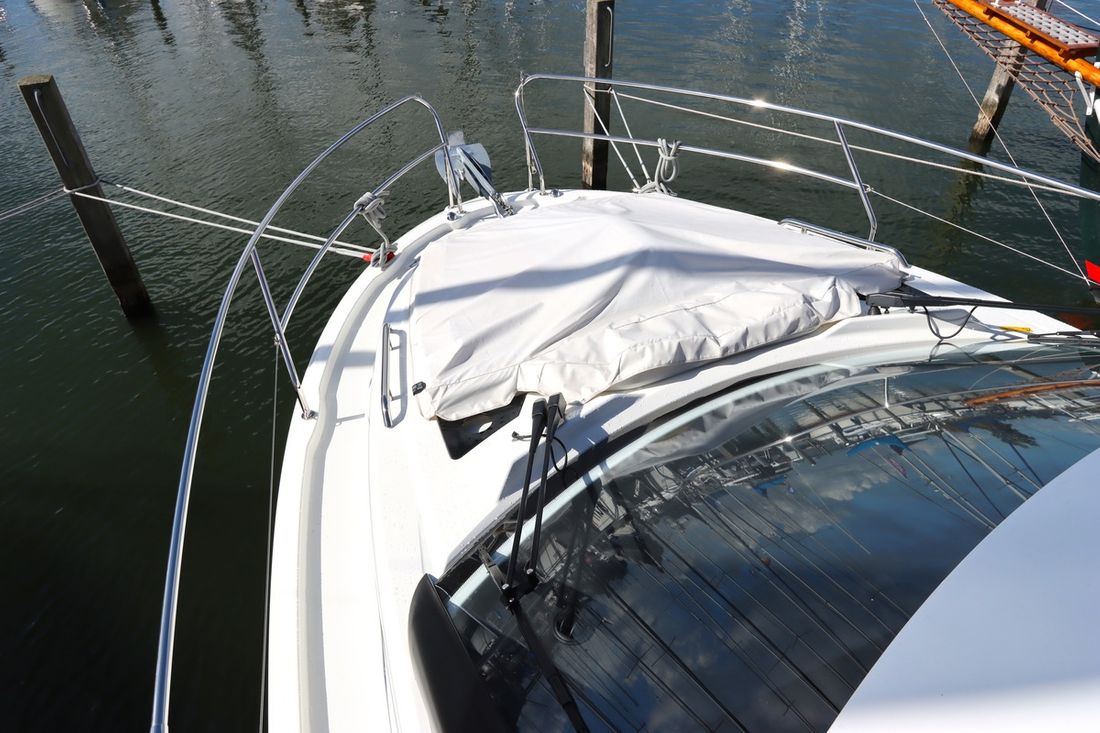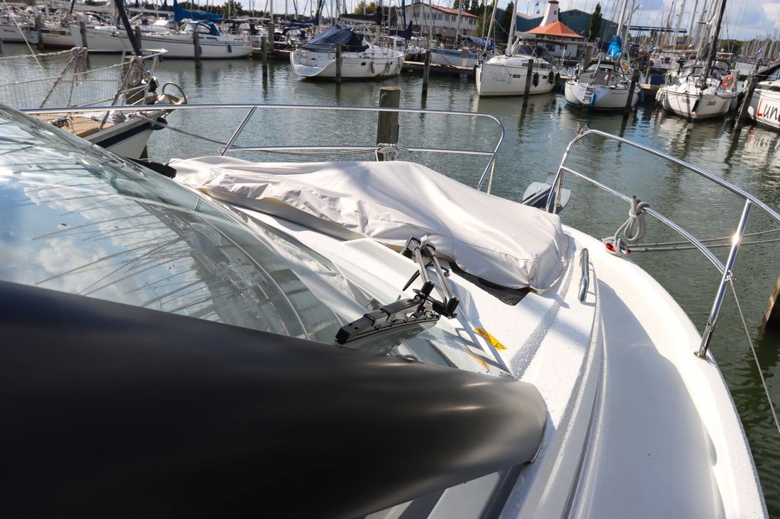 With an electric anchor winch, cockpit tent, swim platform and complete safety equipment, this Jeanneau NC 33 is completely ready to sail.