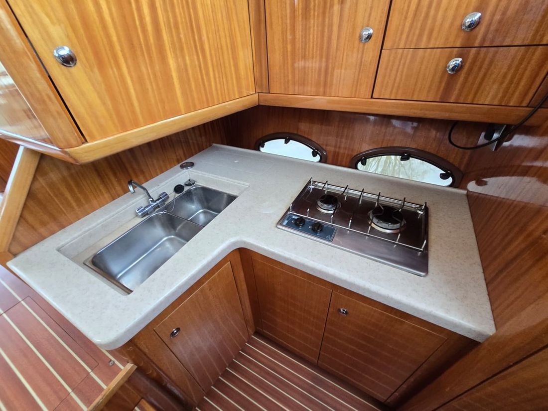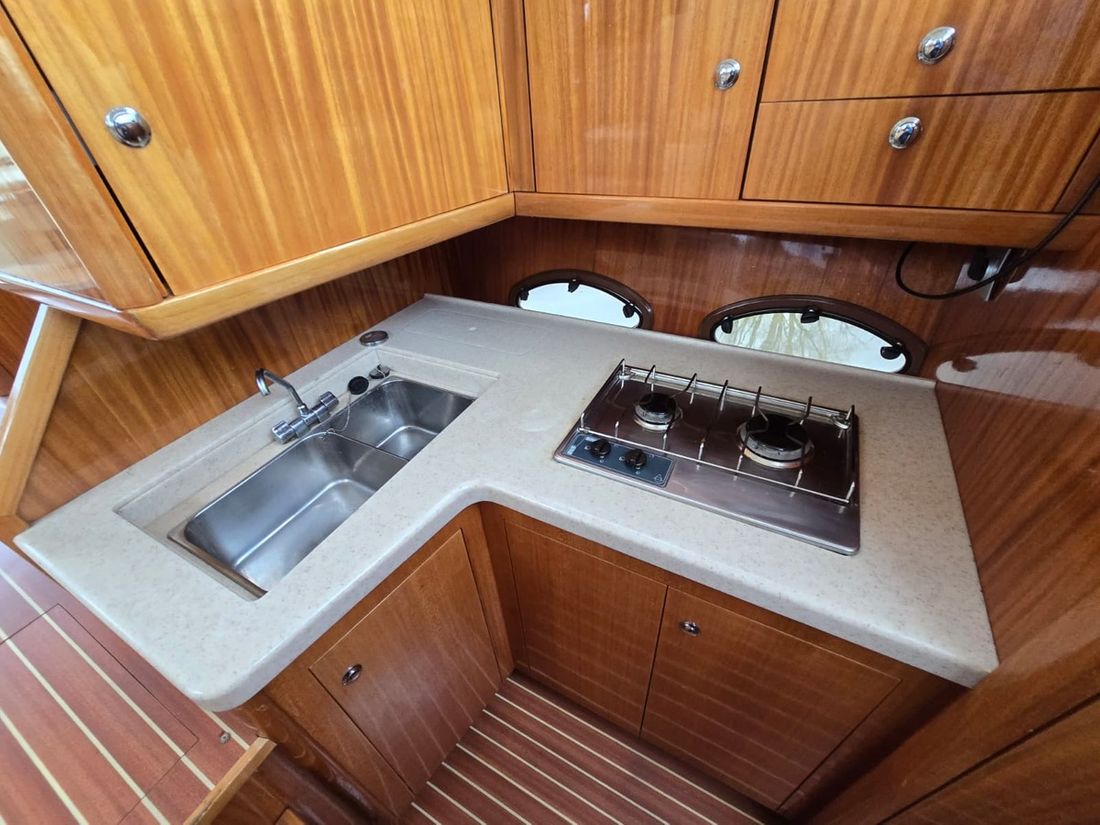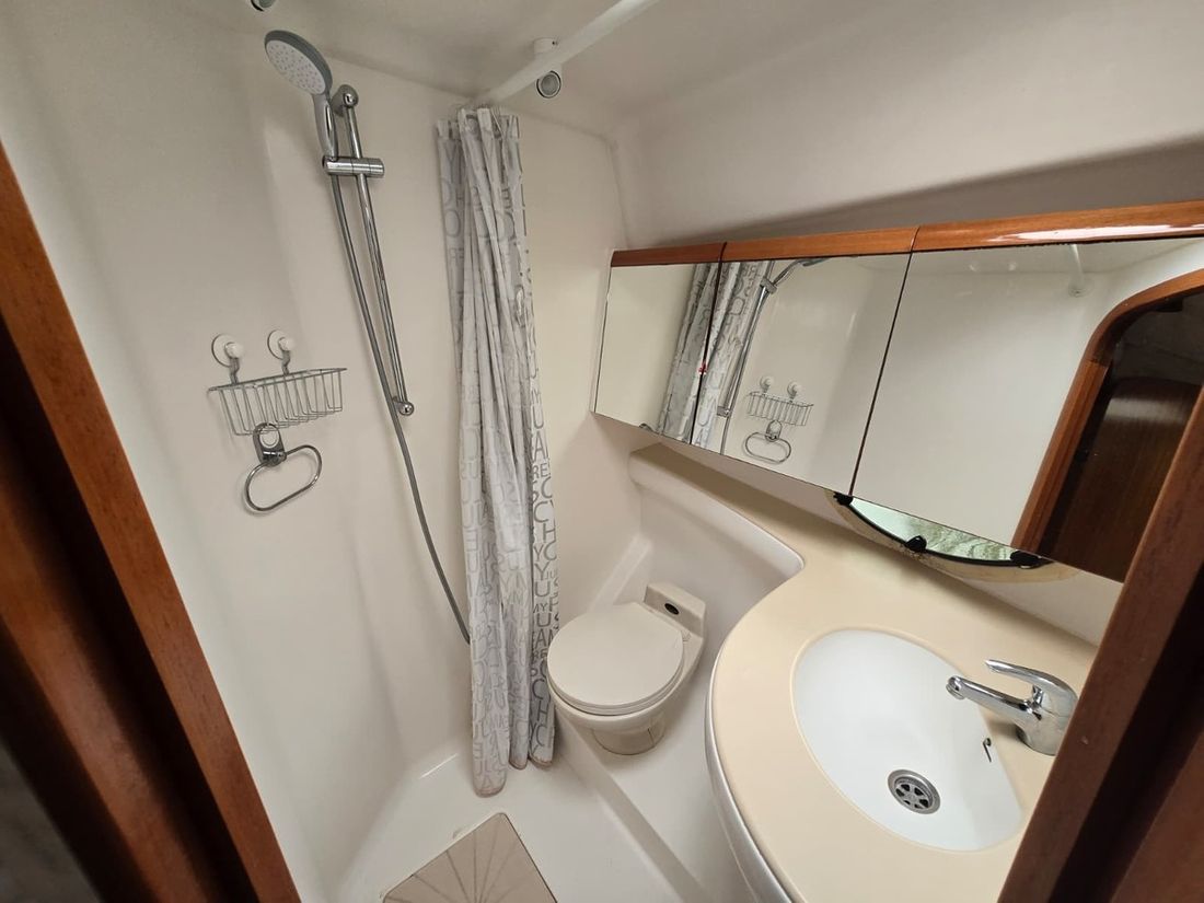 Spaces Saloon Cabins 2 Decoration Type interior Modern, light Mattresses Cushions Curtains Water Water tank & material Capacity 800 litre Water tank material plastic Water tank gauge Inhoud 40 litre Waste water tank Waste water tank drainpump Deck suction Water system pressure Hot water Deck wash pump Deck Shower Plumbing Number of showers 2 Toilets 2 Manual Electric Entertainment Television Radio/CD player Kitchen Cooker & fuel Number 2 Cooking fuel gas Microwave Fridge & power source Freezer Climate control Heating 1 hot air -