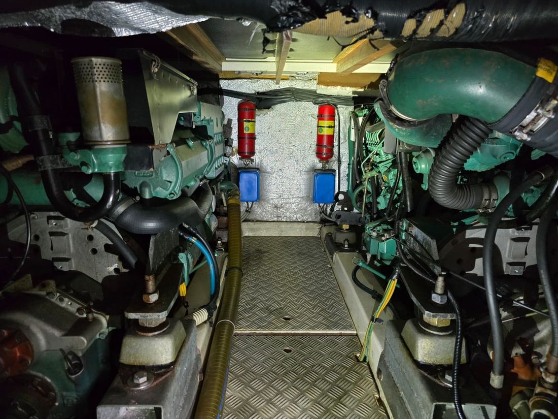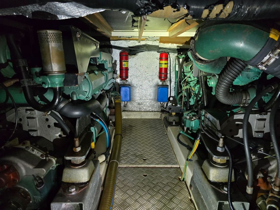 Engines Number of identical engines 2 Starting type electric Main engine Type inboard Brand Volvo Penta Model TAMD 63P-A Number of cylinders 6 Power 370 hp Hours counter Engine hours 1200 Fuel diesel Fuel consumption 8 litre/hour Drive Transmission shaft Propulsion propellor Cooling system indirect Tank Fuel tanks Number 2 Total fuel tank(s) capacity 1600 litre/hour Fuel tank material stainless steel Performance Max speed 65 km/h Cruising speed 12 km/h Measuring instruments Fuel tank gauge Bow and stern thruster Bow thruster electric Electricity Battery Battery charger Alternator Generator Brand generator Kohler Shore power Shore power cable 12V -