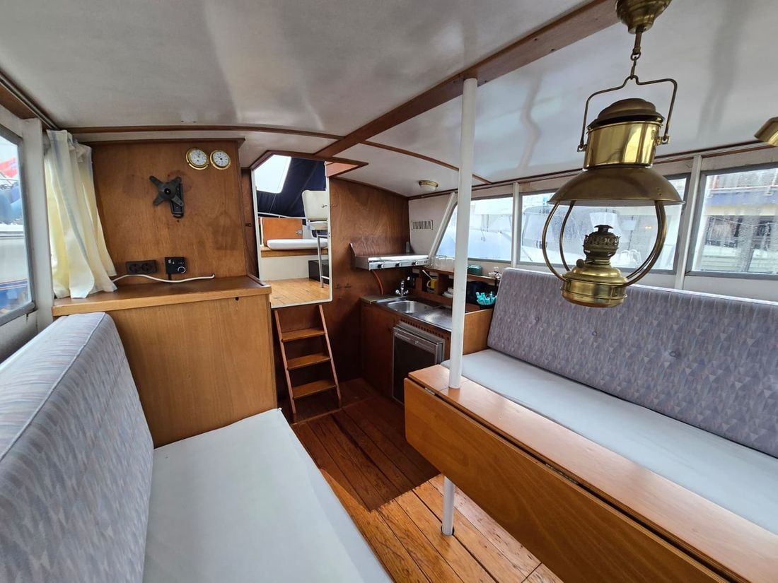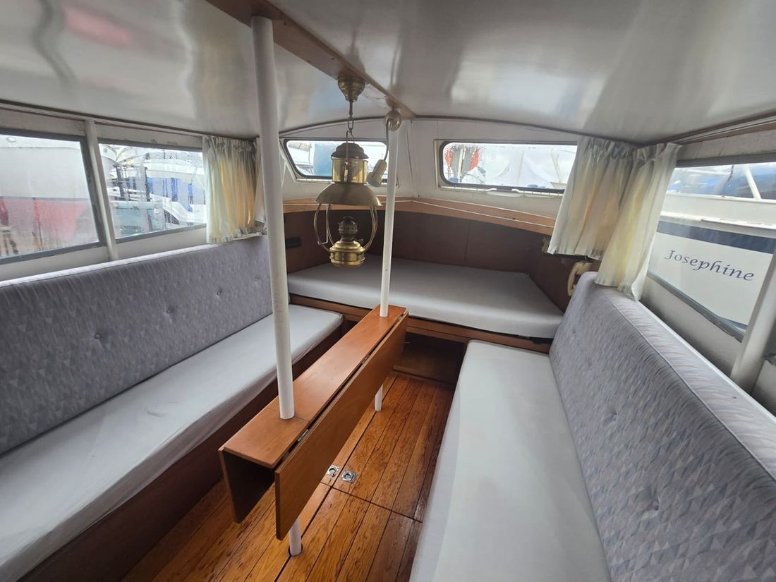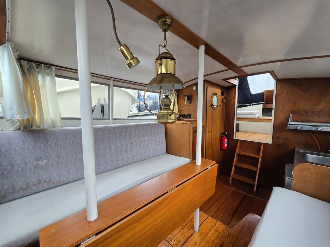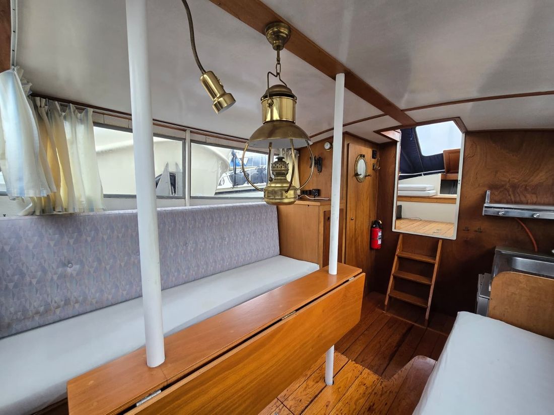 Spaces Saloon Separate Dining area Engine room Cabins 1 Saloon Decoration Type interior Classic, warm Color upholstery grey Mattresses Cushions Curtains Water Water tank & material Water system pressure Plumbing Toilets 1 Manual Entertainment Radio/CD player Kitchen Cooker & fuel Number 2 Cooking fuel gas Fridge & power source -