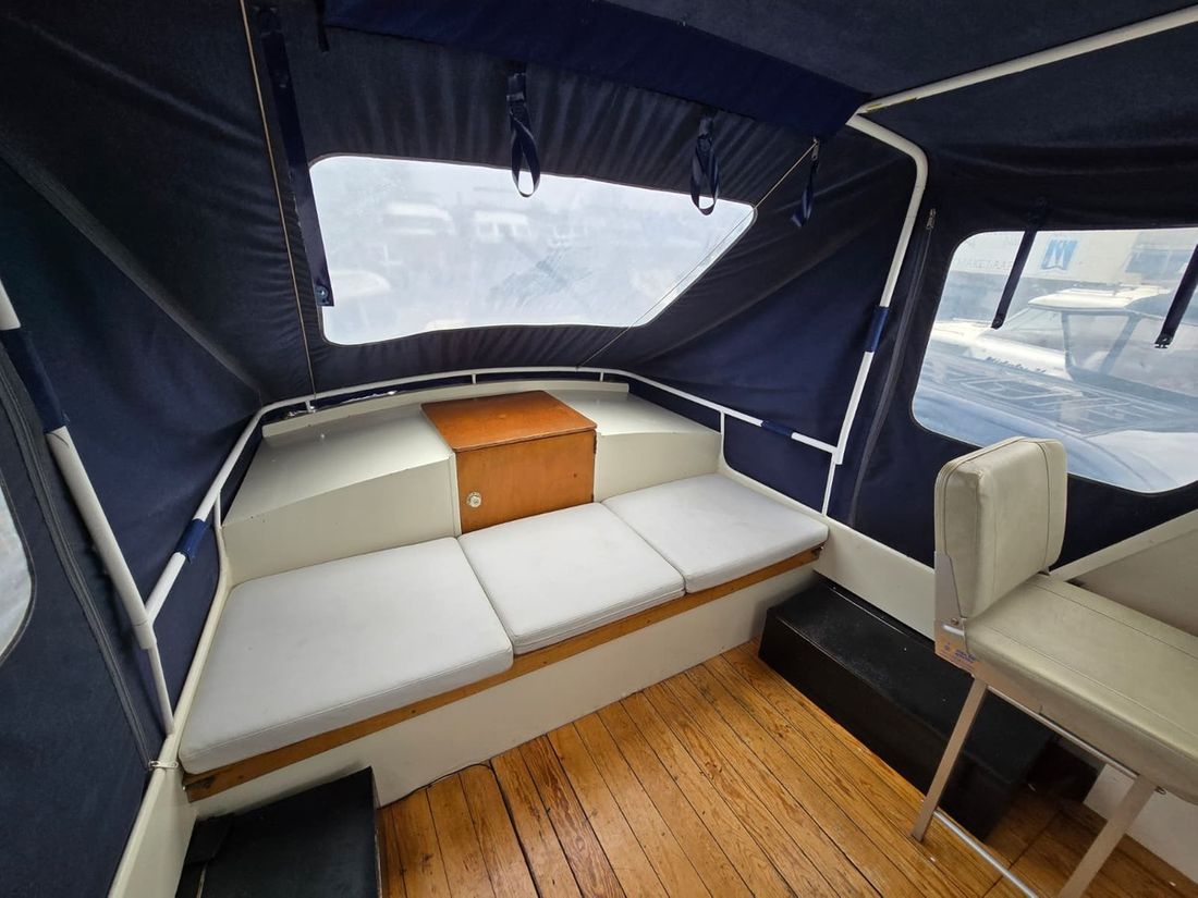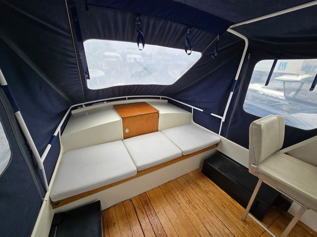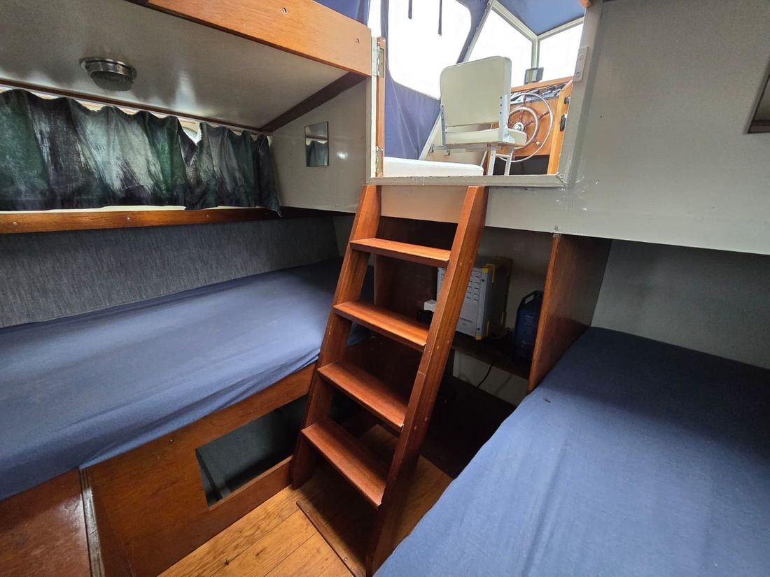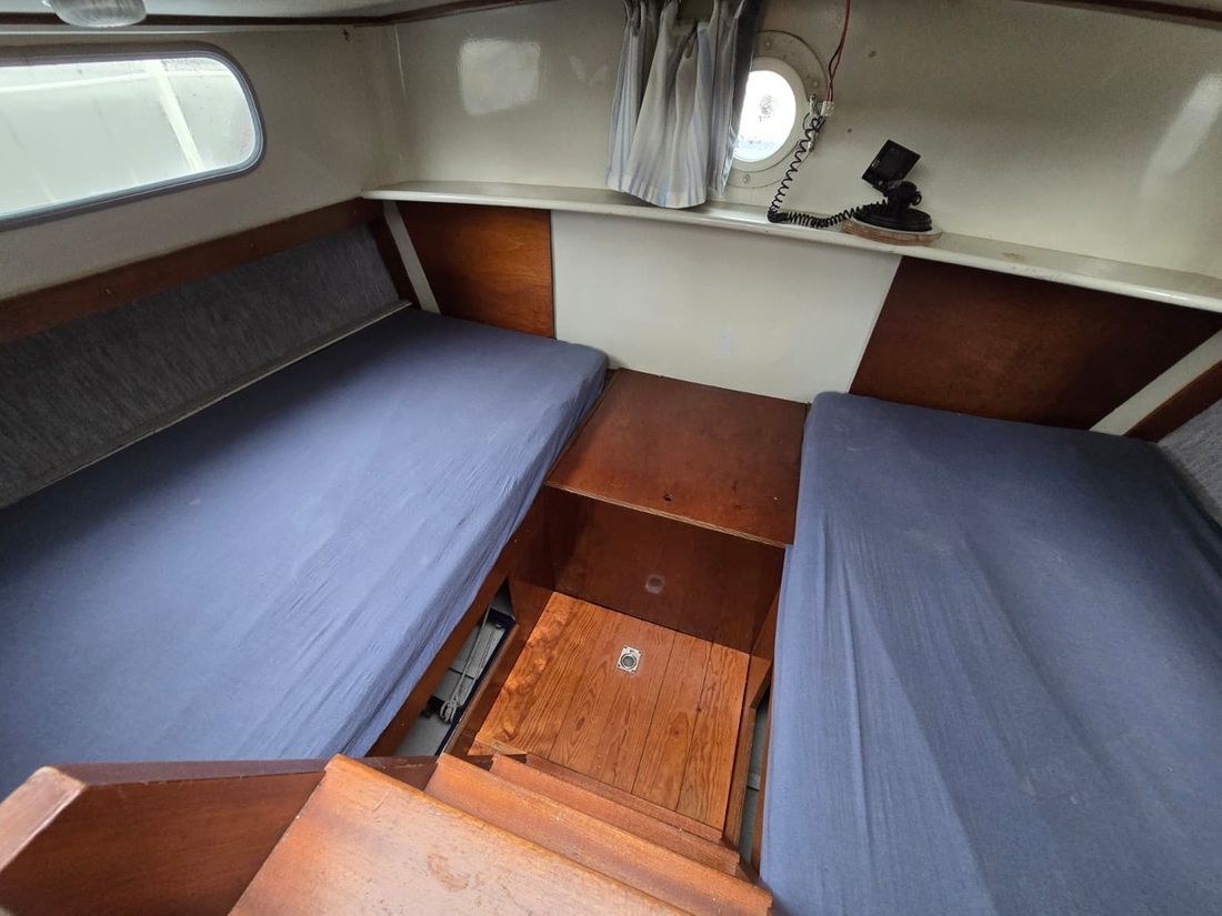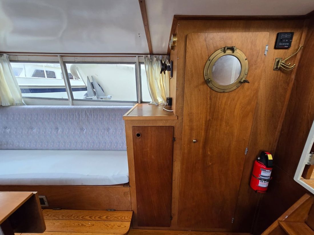 Spaces Saloon Separate Dining area Engine room Cabins 1 Saloon Decoration Type interior Classic, warm Color upholstery grey Mattresses Cushions Curtains Water Water tank & material Water system pressure Plumbing Toilets 1 Manual Entertainment Radio/CD player Kitchen Cooker & fuel Number 2 Cooking fuel gas Fridge & power source -