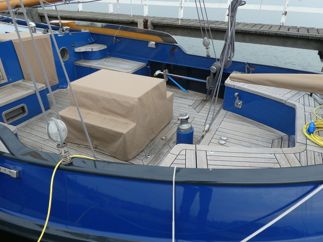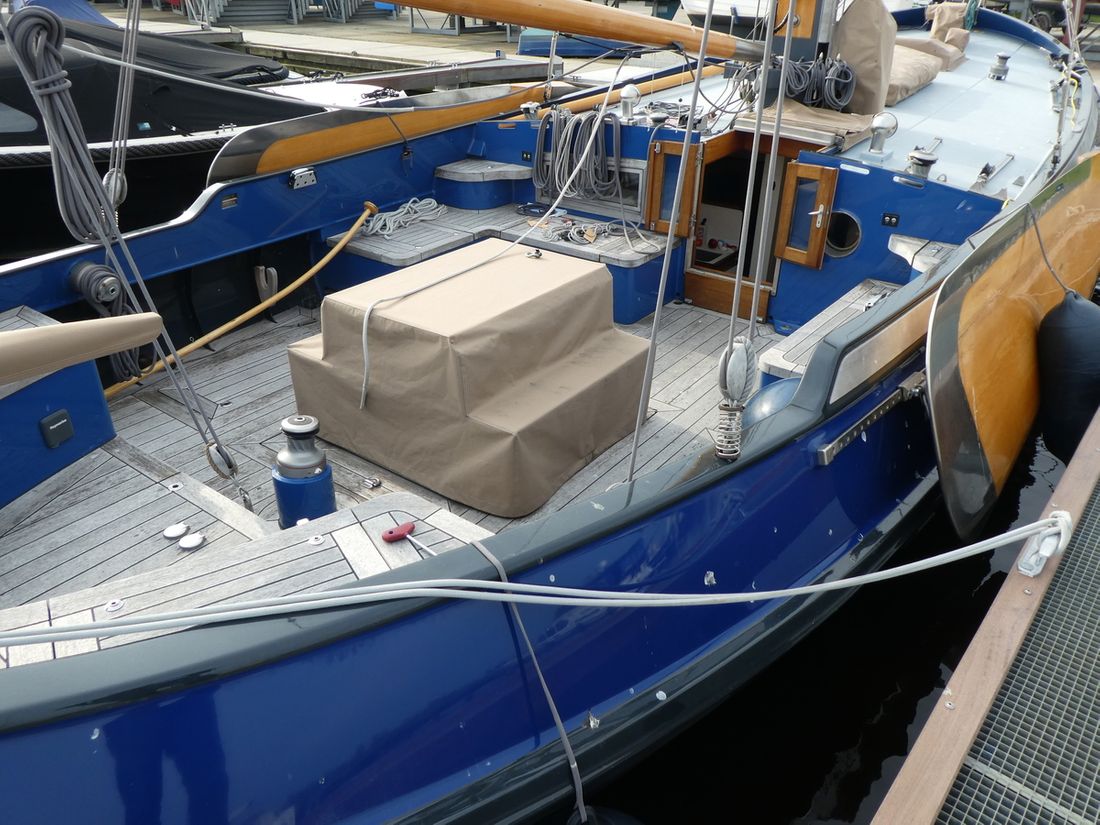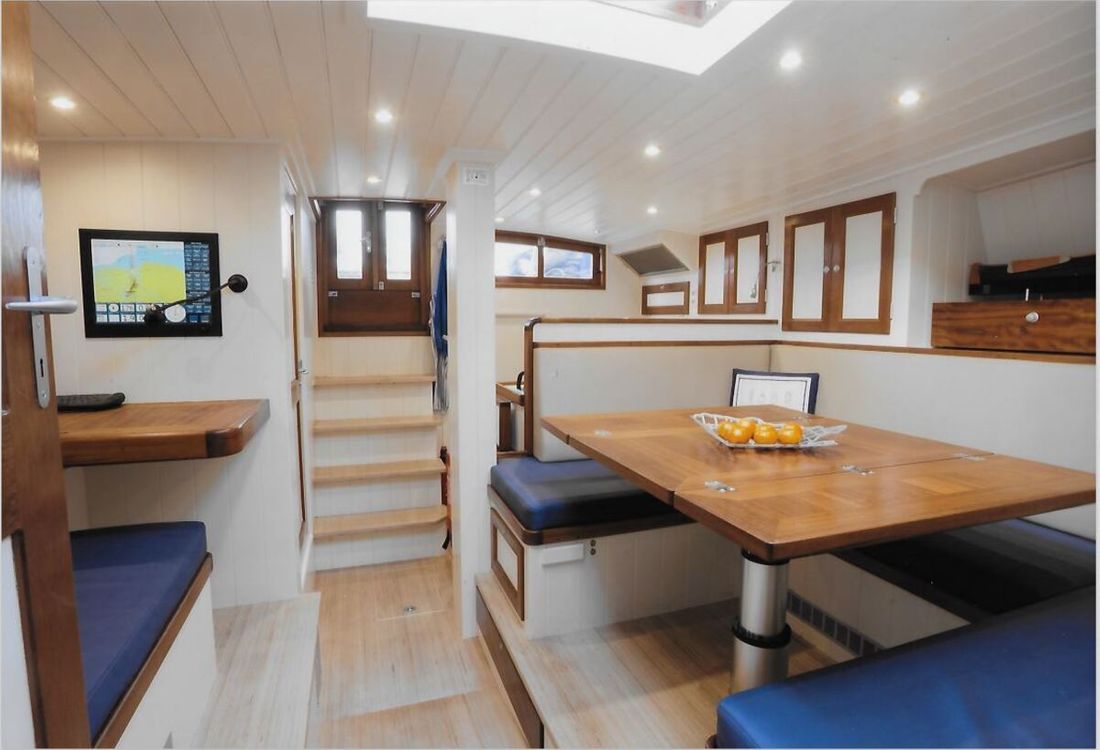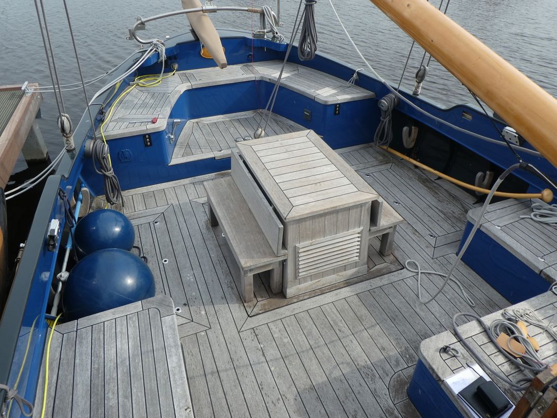 General Sailplan type gaff Number of masts 1 Spars material wood Comments Spars material all spars from Brasker/Ventis from Enkhuizen Standing rig steel wire Number of sails 9 Manufacturer de Boer zeilmakers Main and stern sails Main sail Comments Main sail 48 m2 Headsails Furling foresail Comments Furling foresail Facnor for jib Winches Winches Harken 3x rewind, rigging winch and anchor winch hydraulic, 2x sword fall, 2x Harken for jib, 1x winch for reefing and 2x winch for backstays. Number 5 -