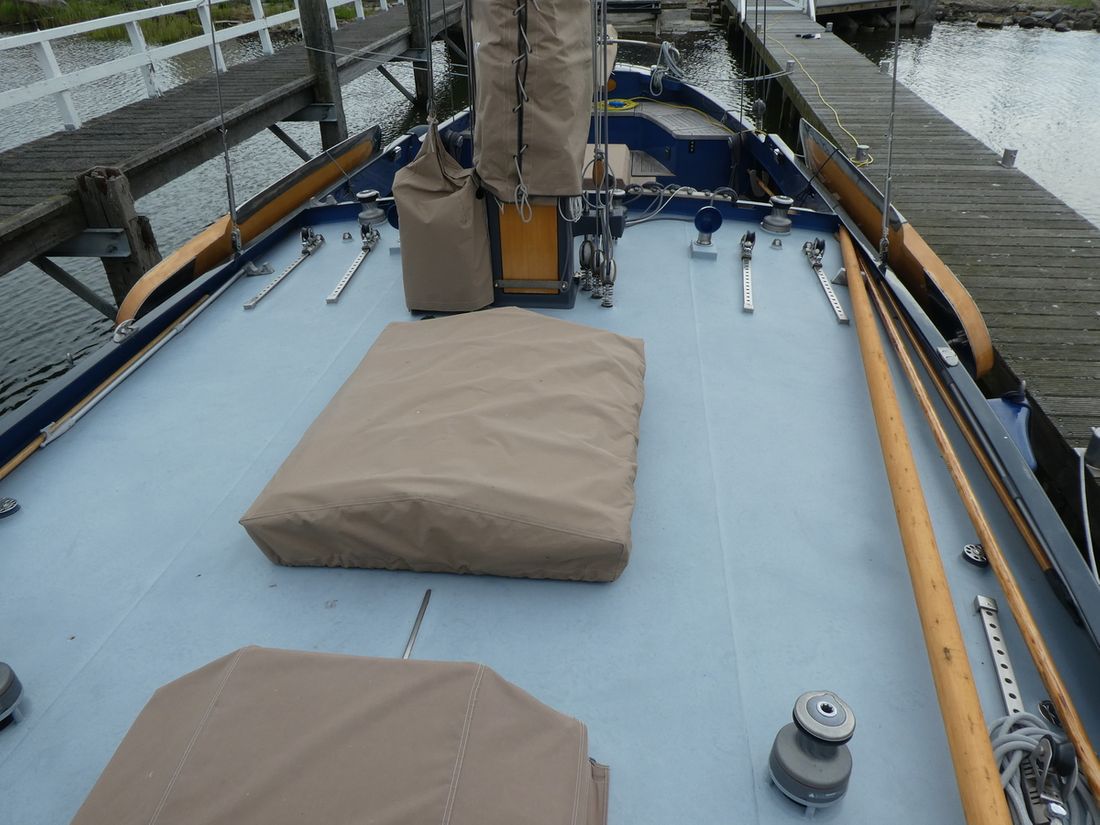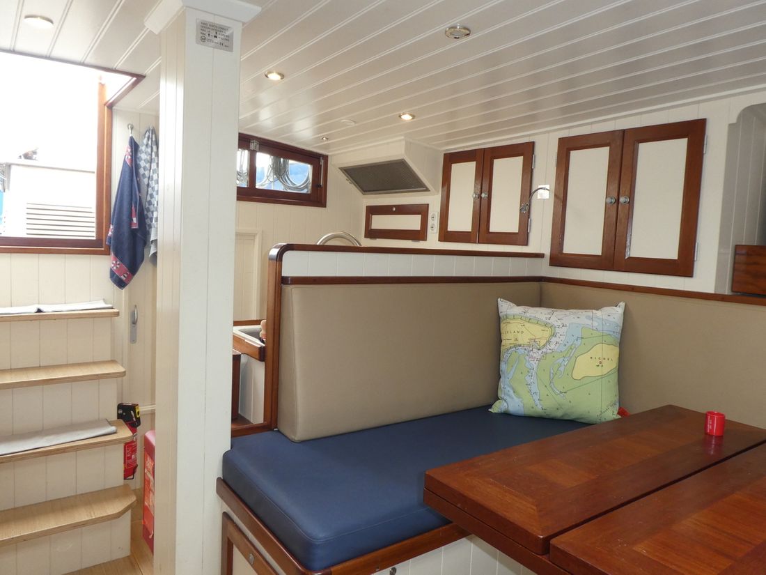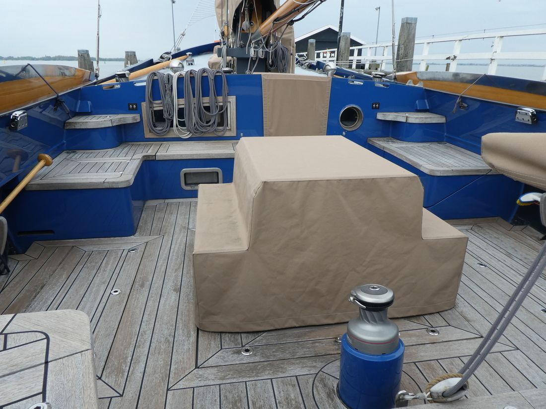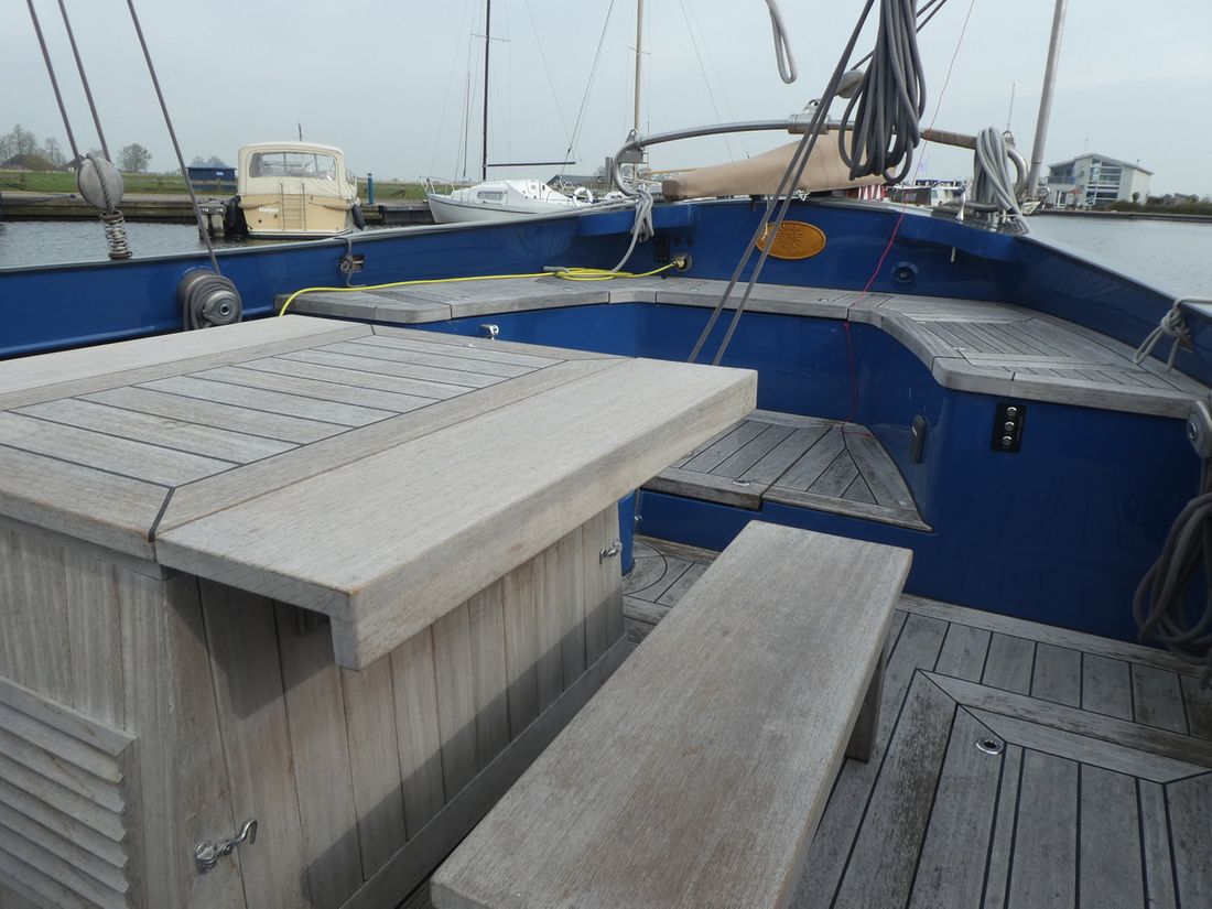 General Sailplan type gaff Number of masts 1 Spars material wood Comments Spars material all spars from Brasker/Ventis from Enkhuizen Standing rig steel wire Number of sails 9 Manufacturer de Boer zeilmakers Main and stern sails Main sail Comments Main sail 48 m2 Headsails Furling foresail Comments Furling foresail Facnor for jib Winches Winches Harken 3x rewind, rigging winch and anchor winch hydraulic, 2x sword fall, 2x Harken for jib, 1x winch for reefing and 2x winch for backstays. Number 5 -