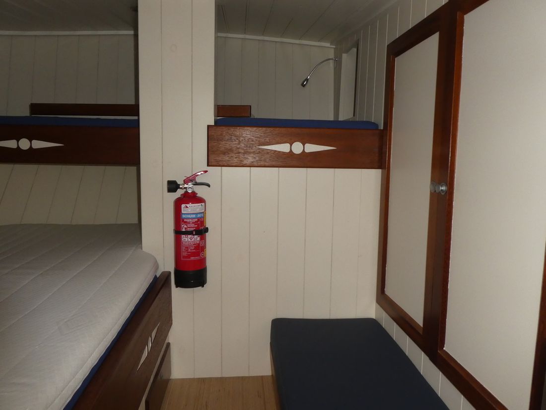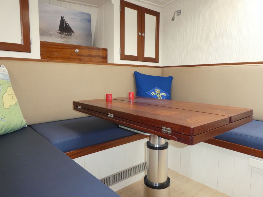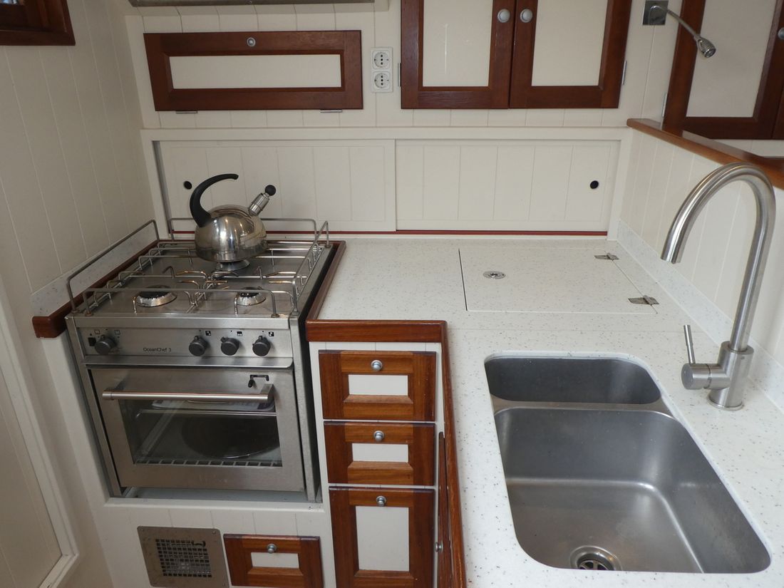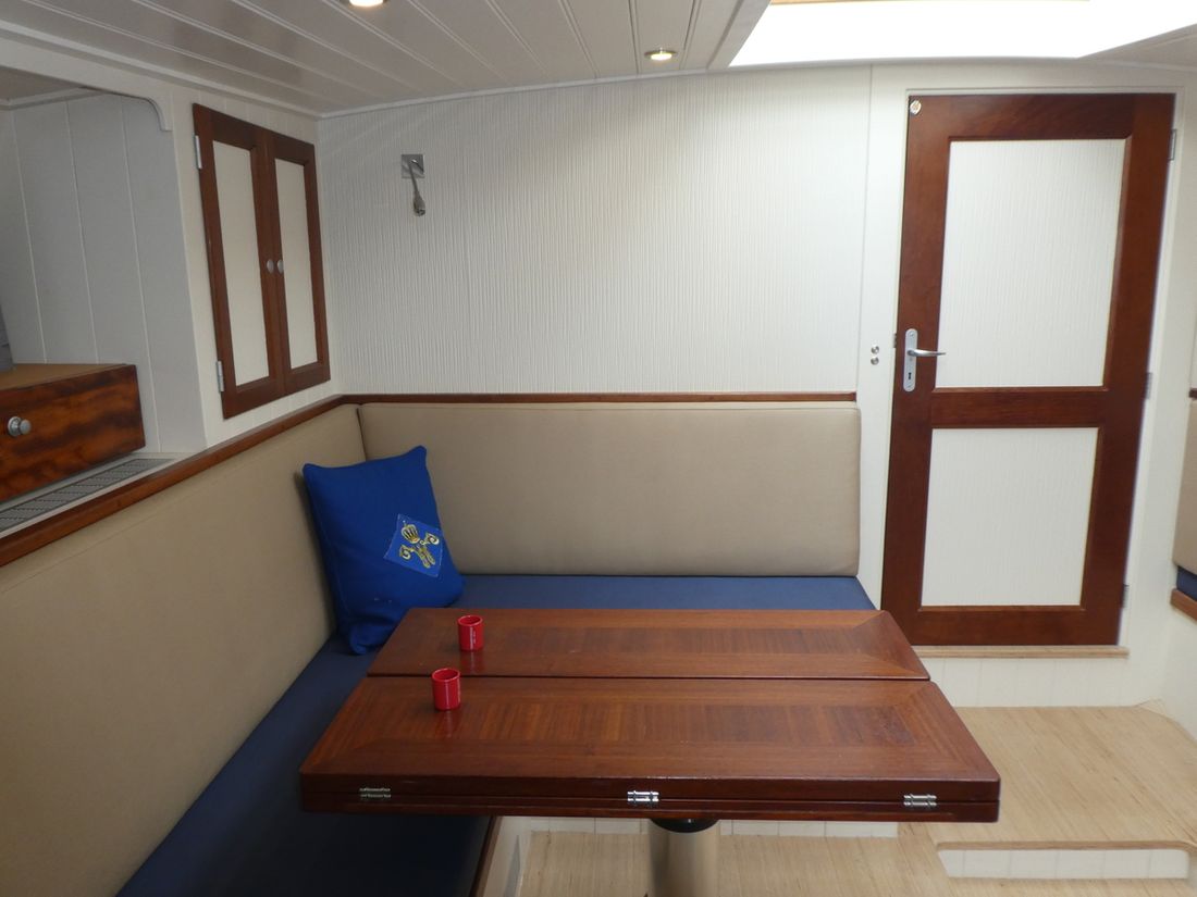 Spaces Comments Headroom No rafter frame but thickened surface allowing extra headroom Cabins 2 Comments Cabins cabin with double bed behind galley and spacious front cabin with double and single bed Saloon Decoration Type interior Modern, light Comments Type interior paneling with FSC approved wood in very light tones making interior remarkably light. Color upholstery blue Mattresses Cushions Curtains Water Water tank & material Comments Water tank & material 1x 160 l. and 1x 175 l. Capacity 335 litre Water tank material stainless steel Water tank gauge Inhoud 85 litre Waste water tank material stainless steel Waste water tank Water system Pressure system Hot water Comments Hot water boiler 80 L. Deck wash pump Deck Shower Plumbing Number of showers 2 Comments Number of showers 1x inside and 1x outside. (hot/cold) Toilets 1 Comments Toilets Planus Electric Entertainment Television Radio/CD player Comments Radio/CD player Blaupunkt Kitchen Cooker & fuel Comments Cooker & fuel Oceanchef Number 3 Cooking fuel gas Oven Fridge & power source Comments Fridge & power source Isotherm Power source electric Climate control hot air Comments Heating Webasto -