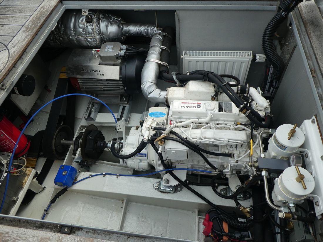 Engines Comments Number of identical engines 1x diesel 50 hp and 1x electric motor 15 hp 3 batteries total 31.5 KWh Starting type electric Main engine Type inboard Brand SCAM (Kubota) Model SD 450 Serial number BQ 1522/V2403 Year 2013 Number of cylinders 4 Power 50 hp Hours counter Engine hours 651 Fuel diesel Motor 2 Type 2nd engine inboard Brand of the 2nd engine Mastervolt/Bellmari Model of the 2nd engine Ultra 10 Serial number of the 2nd engine AM 243.0081/0000009 Year of the 2nd engine 2013 Power of the 2nd engine 15 hp Hours counter on the 2nd engine Fuel for the 2nd engine electric Starting type 2nd engine electric Drive Propulsion Folding propellor Comments Propulsion Autoprop 3 blade folding propeller Tank Fuel tanks Total fuel tank(s) capacity 150 litre Fuel tank material steel Measuring instruments Fuel tank gauge Tachometer Oil pressure gauge Temperature gauge Bow and stern thruster Comments Bow thruster Jet-thruster 90 kgf Electricity Battery Comments Battery 3x Floattech,(2020) 2x AMG and 1x starter battery Number 6 Battery charger Comments Battery charger Victron Alternator Battery monitor Inverter Voltmeter Shore power Comments Shore power cable and extension cord Shore power cable 12V 24V 48V -