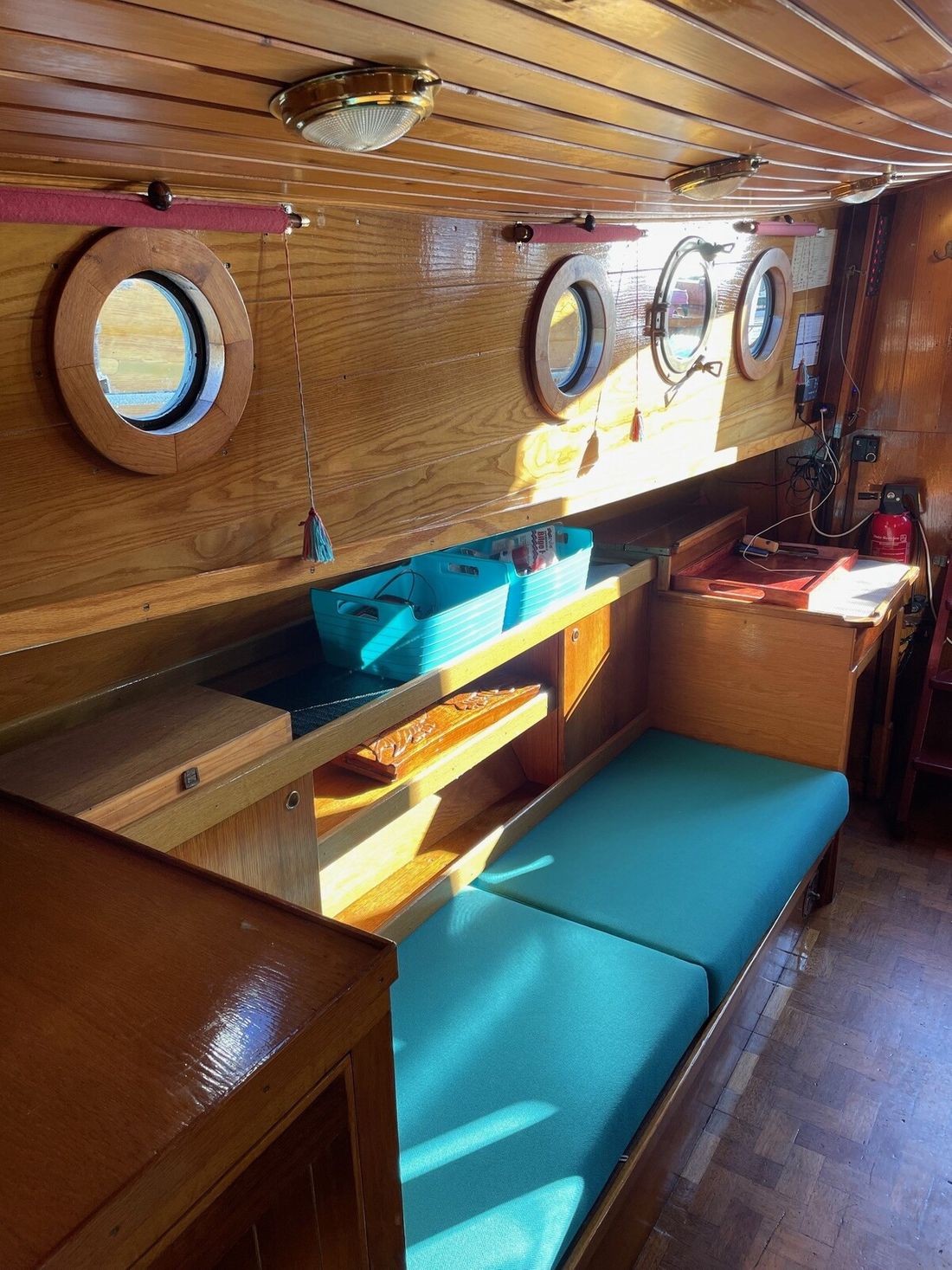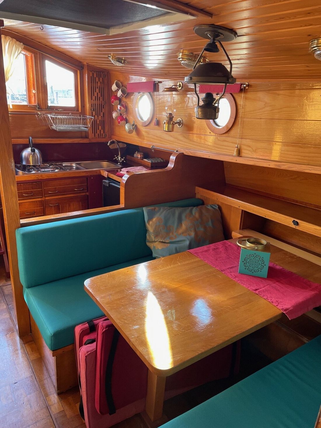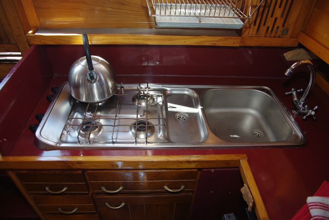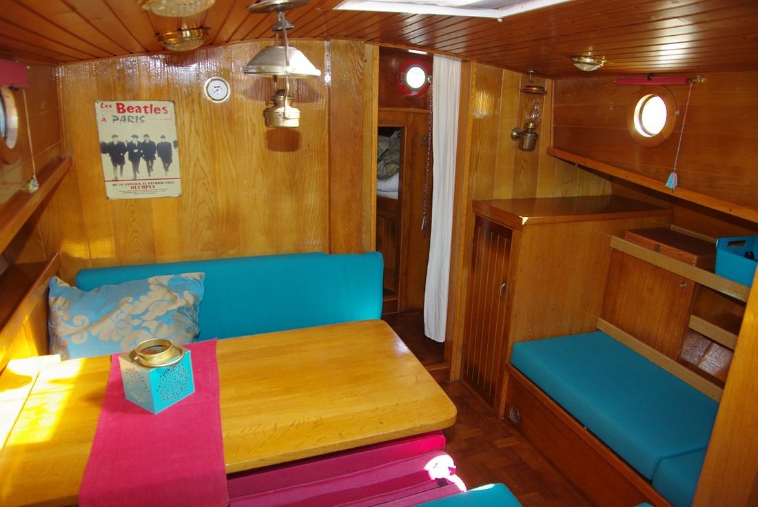 Spaces Saloon Separate Dining area Saloon Decoration Type interior Classic, warm Color upholstery blue Mattresses Cushions Curtains Water Water tank & material Water tank material stainless steel Hot water Kitchen Cooker & fuel Number 4 Cooking fuel gas Fridge & power source Power source electric -