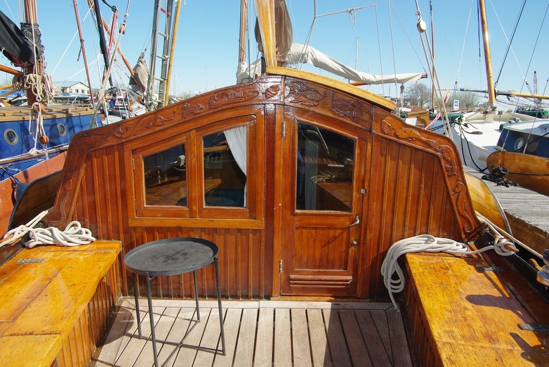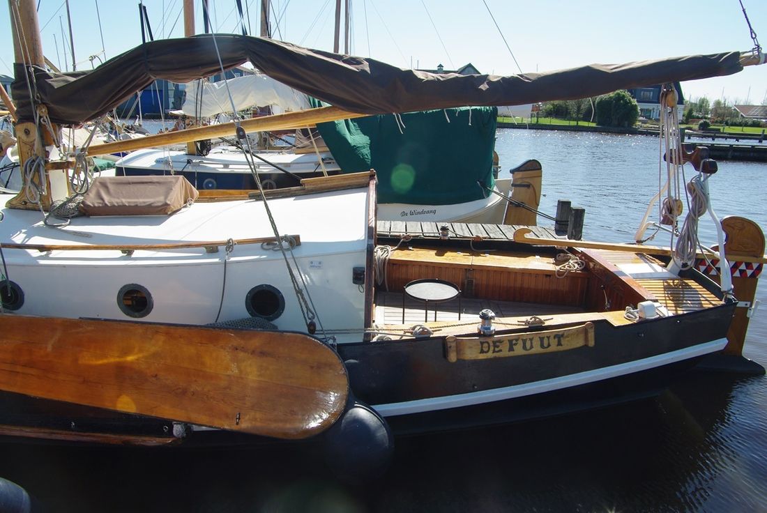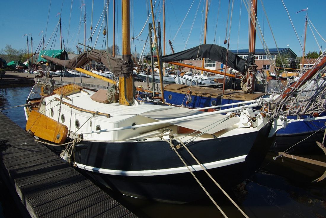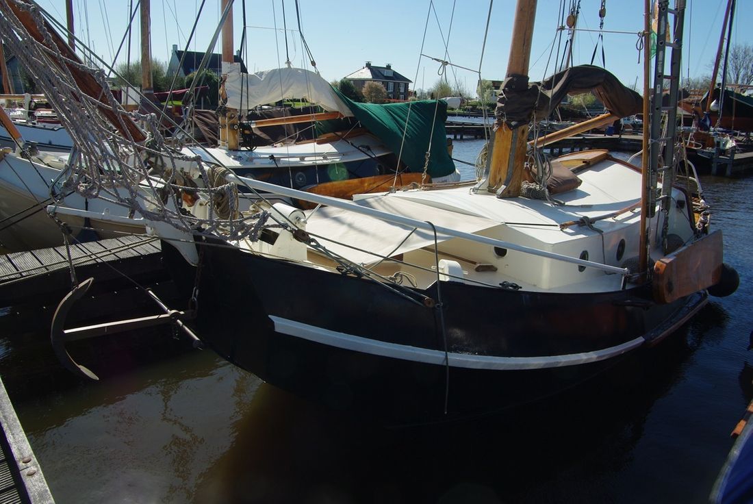 Delivered new Designer De Plaete Shipyard Ooltgensplaat Hull deck superstructure Hull shape flat bottom Hull colour black Deck colour beige Deck construction steel Cockpit aft cockpit Open cockpit Dimensions and weights Minimum height 240 cm Displacement 10000 kg Steering and Drift Limitation Steering system helm Position steering system outside control Rudder single Keel/Lee board leeboards -