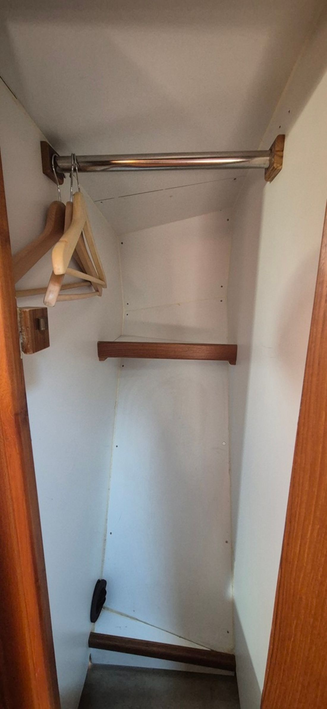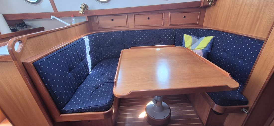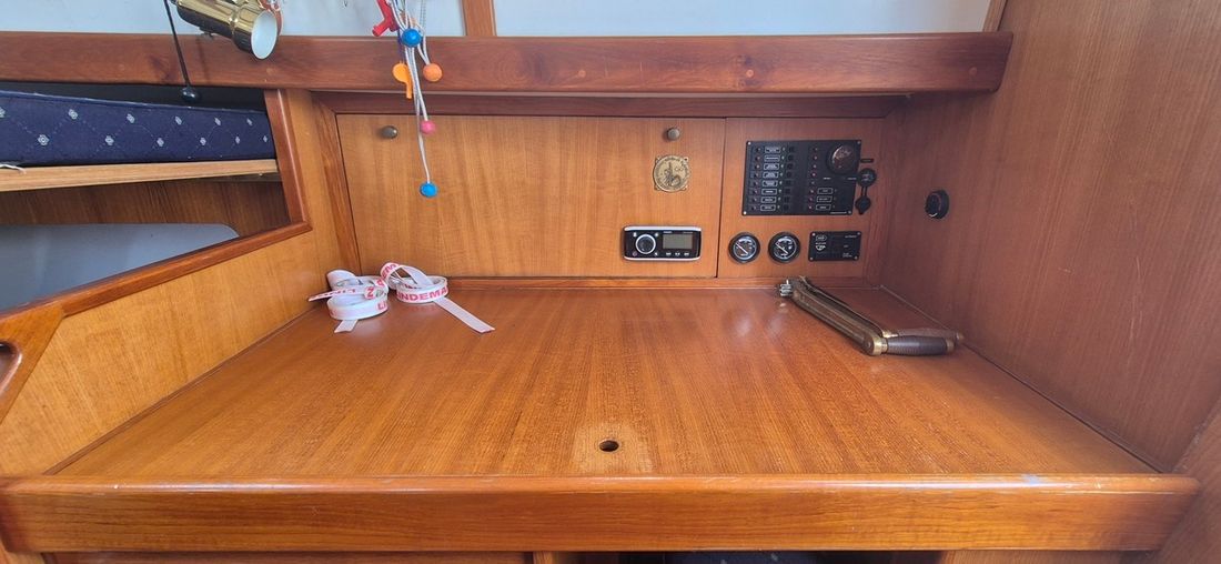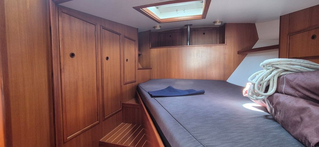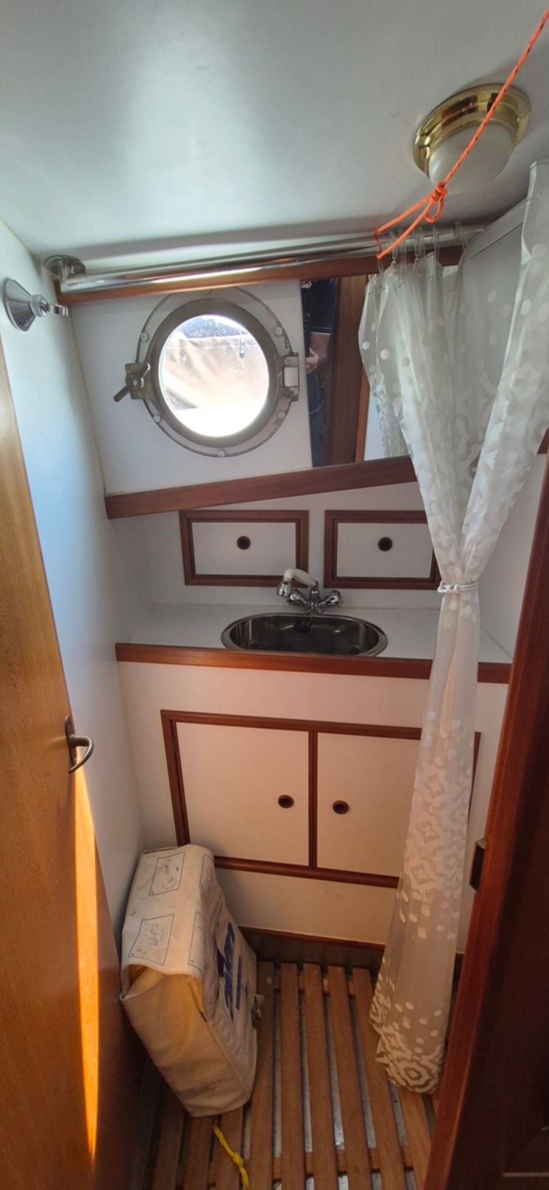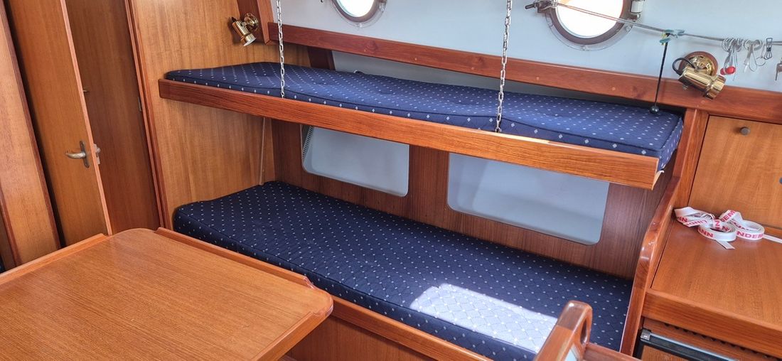 Spaces Saloon Comments Saloon Beautiful spacious and bright lounge with standing height of 1.90 meters. Comments Headroom Standing height forward 1.81 meters. Separate Dining area Engine room Cabins 1 Comments Cabins Forepeak with double bed and large wardrobe wall. Saloon Decoration Type interior Modern, light Comments Type interior Completely new interior in 2001 with teak finish. Color upholstery blue Mattresses Water Water tank & material Comments Water tank & material several water tanks available. Capacity 150 litre Water tank material stainless steel Water system pressure Hot water Comments Hot water boiler connected to the engine and 230 volts. Plumbing Number of showers 1 Toilets 1 Manual Entertainment Radio/CD player Kitchen Cooker & fuel Number 2 Fridge & power source Power source electric Climate control hot air Comments Heating Webasto hot air new 2001. -