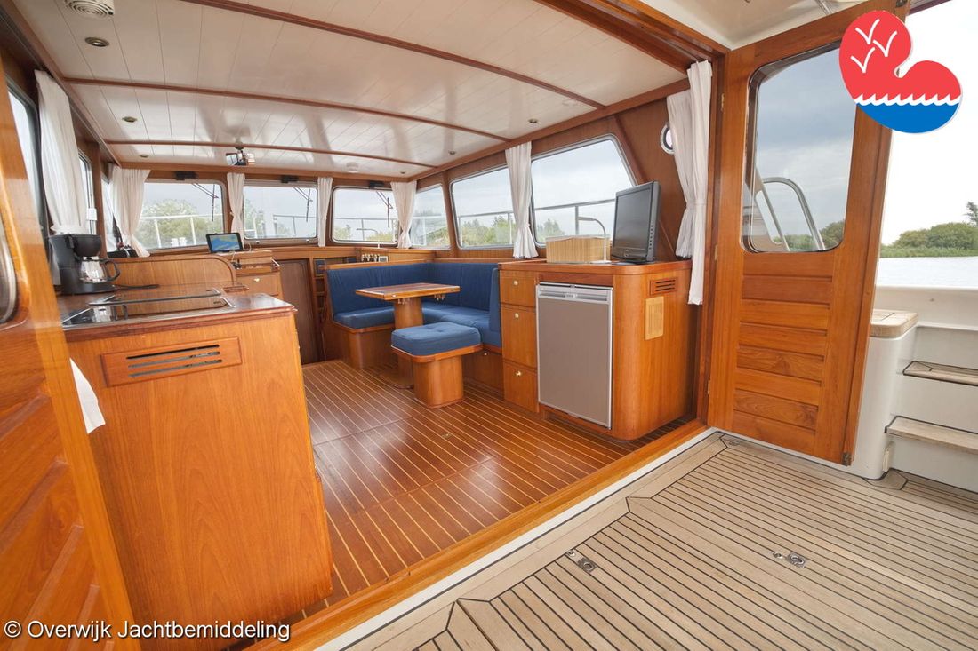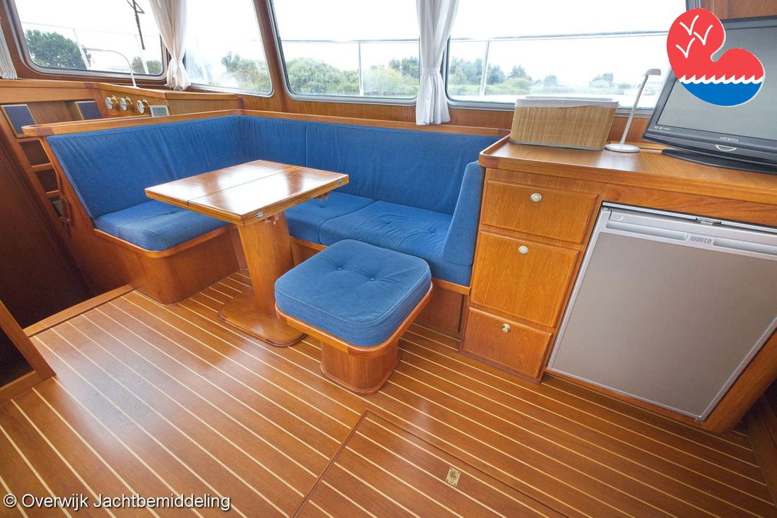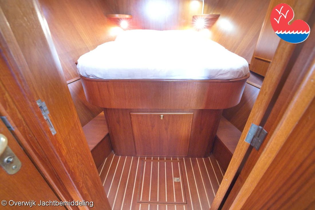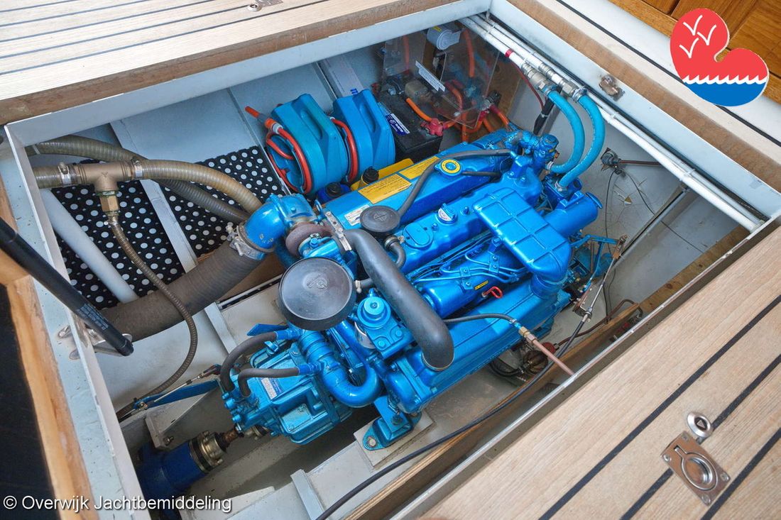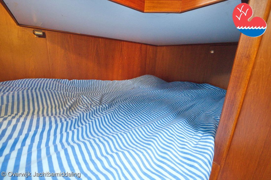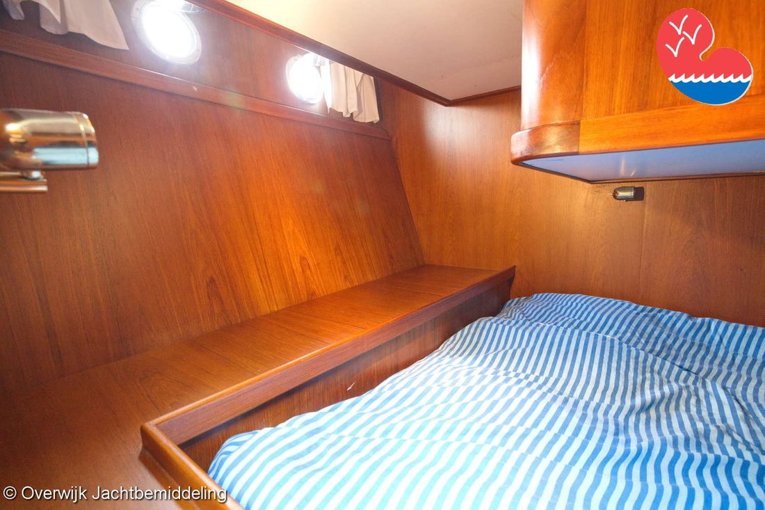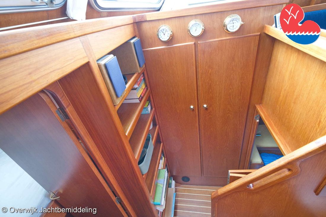 Spaces Saloon Comments Headroom Standing height tent: 201 - standing height saloon: 192 - standing height hall fore cabin: >220 - standing height toilet room: 195 - standing height shower room: 192 - standing height fore cabin: 194 cm. Separate Dining area Engine room Cabins 2 Layout and spaces inside Open cockpit with a bench seat and ample storage. The floor and bench are covered in solid teak. Underneath the floor is the engine room, with fully opening doors leading to the saloon. In the saloon, on the starboard side, there is a spacious cupboard and a corner sofa. To port are the galley and the helm station, with the forward cabin and guest cabin partially located under the saloon floor. To port is the bathroom with a toilet, washbasin, and separate shower. The forward cabin has a French bed and various cupboards. Decoration Type interior Classic, warm Color upholstery blue Mattresses Cushions Curtains Water Water tank & material Capacity 750 litre Water tank material stainless steel Water tank gauge Inhoud 100 litre Waste water tank material stainless steel Waste water tank Waste water tank gauge Waste water tank drainpump Deck suction Water system pressure Comments Water system Hydrophore. Hot water Comments Hot water Boiler 45 liters on car heat. Deck wash pump Deck Shower Plumbing Number of showers 2 Comments Number of showers In bathroom and bathtub. Toilets 1 Comments Toilets New 2023. Electric Entertainment Television Radio/CD player Comments Radio/CD player Kenwood. Kitchen Cooker & fuel Comments Cooker & fuel Smev with glass cover. Number 2 Cooking fuel gas Oven Comments Oven Gasoven Smev. Amount 1 Fridge & power source Comments Fridge & power source Weaco CR0110 (new 2019). Capacity 110 litre Power source electric Freezer Comments Freezer In refrigerator. Capacity 10 litre Climate control hot air Comments Heating Webasto Airtop 3500 diesel. -