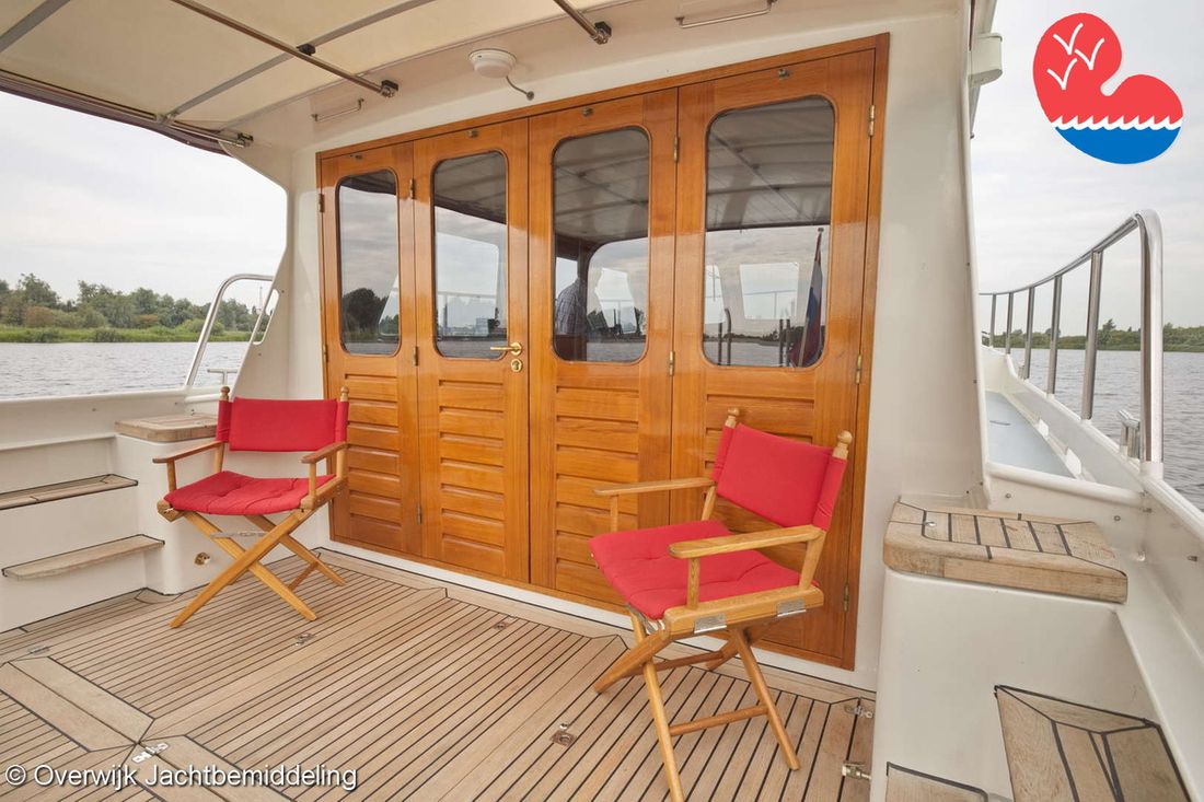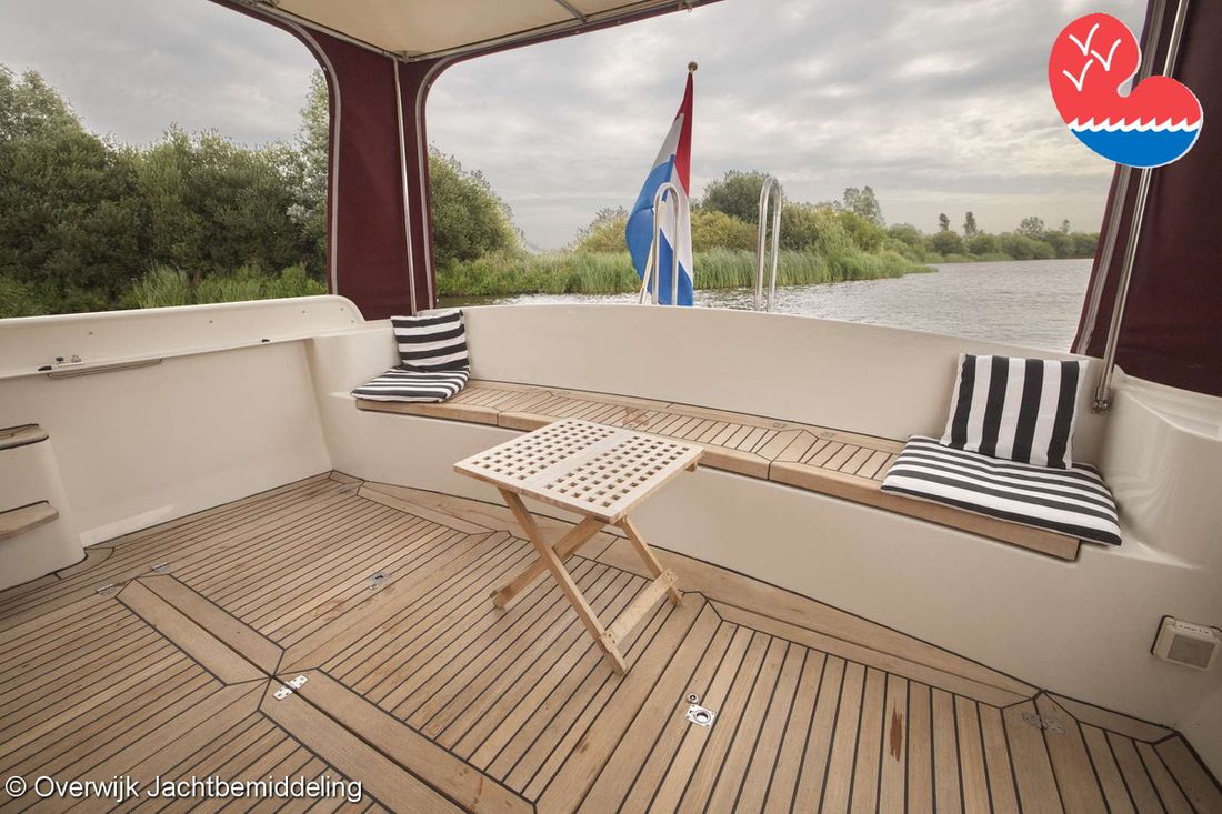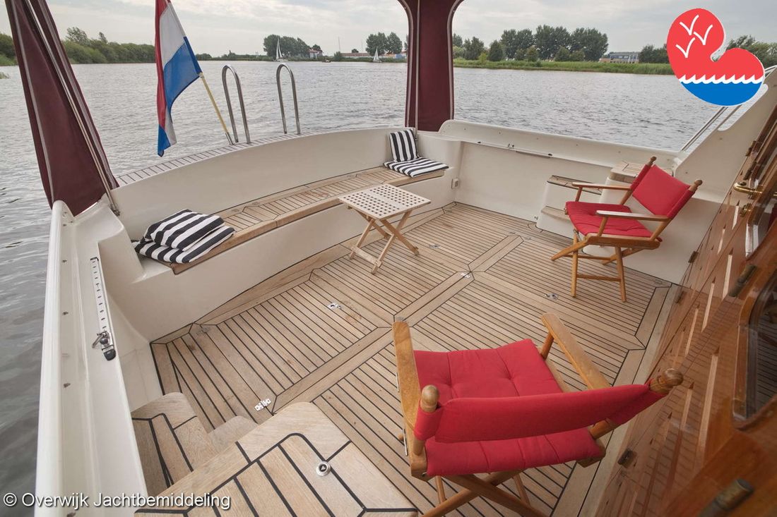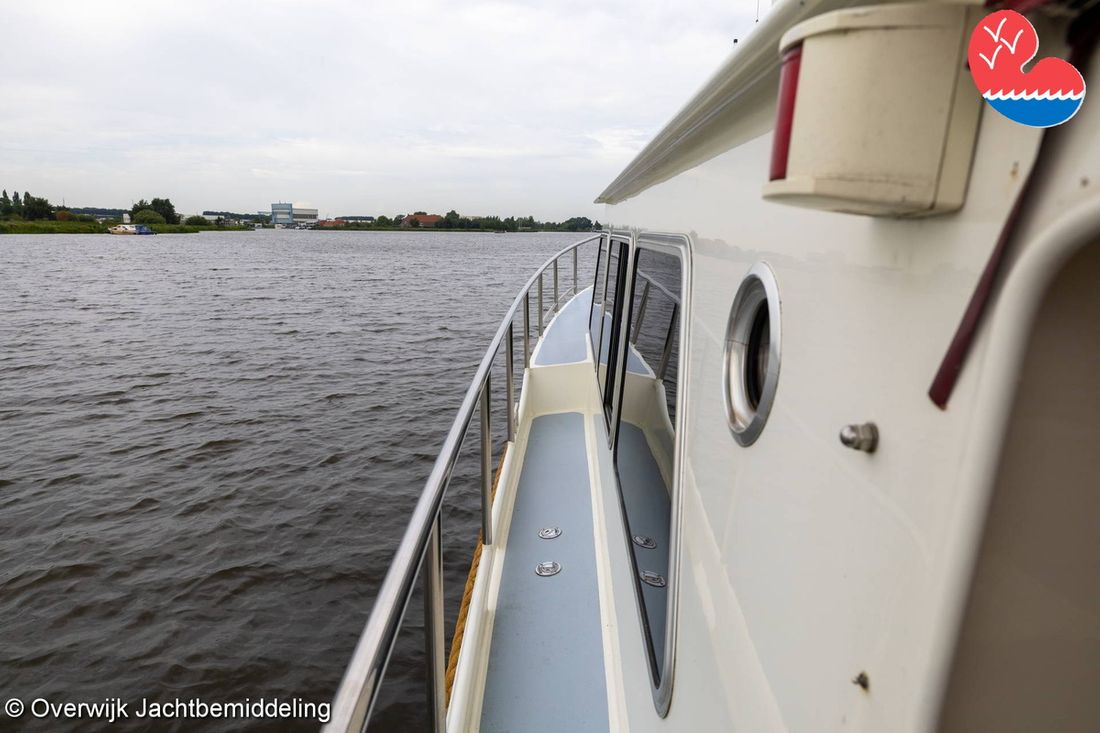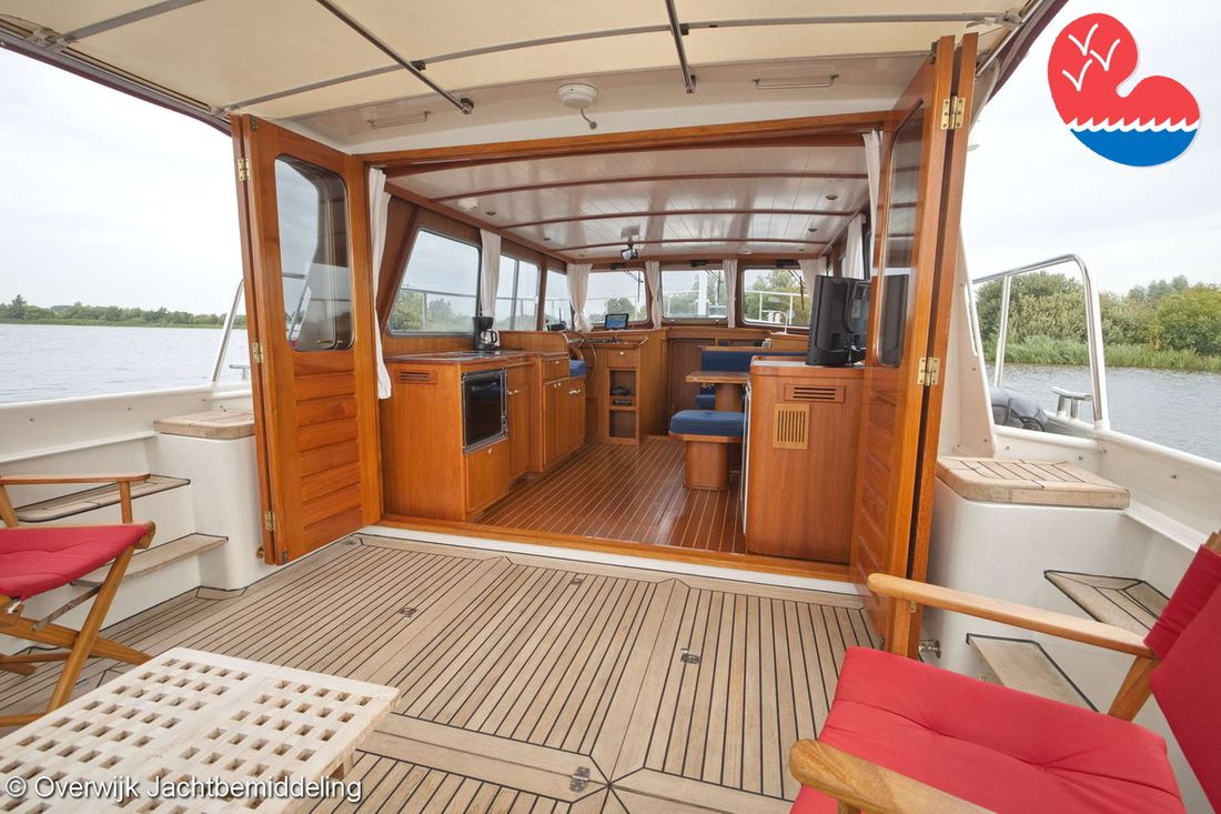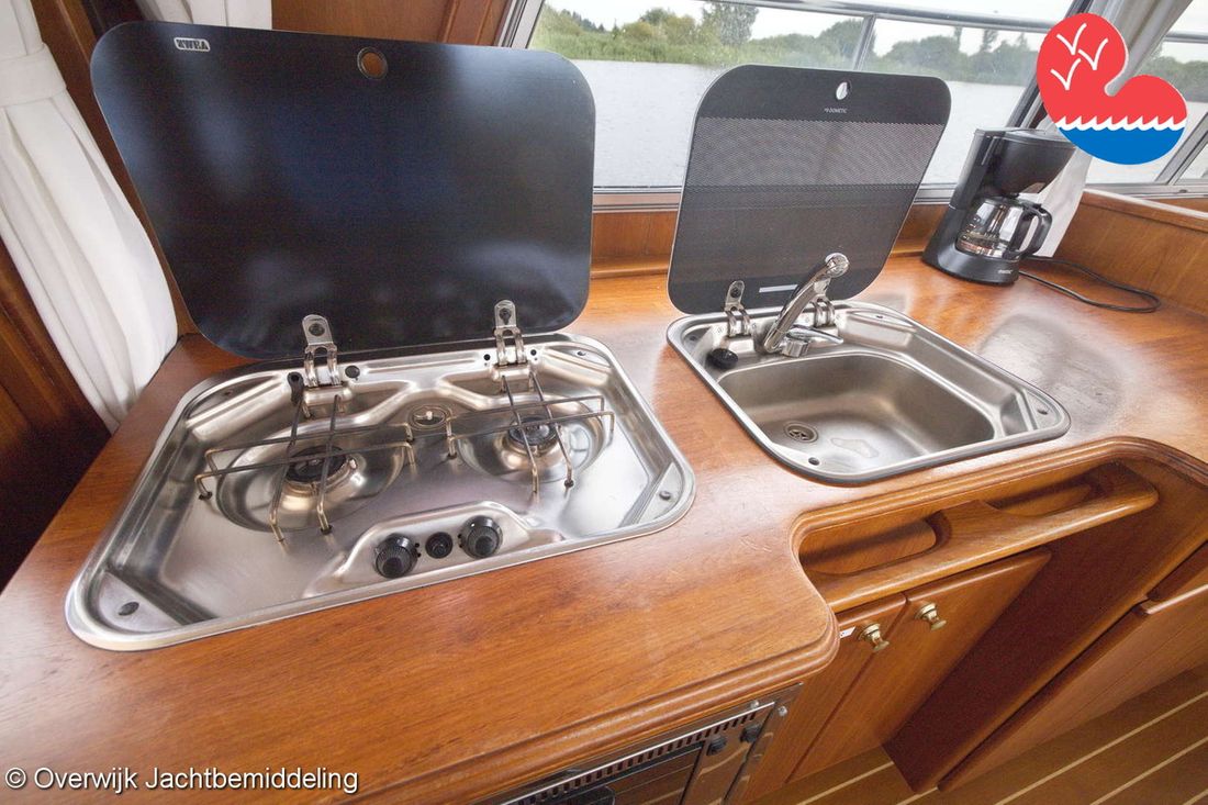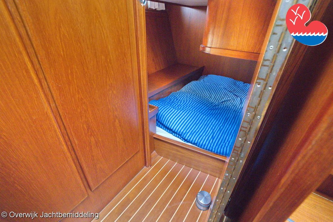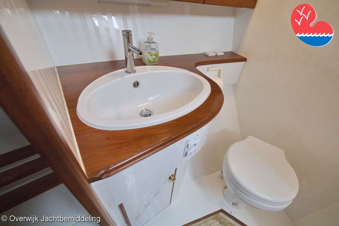 Spaces Saloon Comments Headroom Standing height tent: 201 - standing height saloon: 192 - standing height hall fore cabin: >220 - standing height toilet room: 195 - standing height shower room: 192 - standing height fore cabin: 194 cm. Separate Dining area Engine room Cabins 2 Layout and spaces inside Open cockpit with a bench seat and ample storage. The floor and bench are covered in solid teak. Underneath the floor is the engine room, with fully opening doors leading to the saloon. In the saloon, on the starboard side, there is a spacious cupboard and a corner sofa. To port are the galley and the helm station, with the forward cabin and guest cabin partially located under the saloon floor. To port is the bathroom with a toilet, washbasin, and separate shower. The forward cabin has a French bed and various cupboards. Decoration Type interior Classic, warm Color upholstery blue Mattresses Cushions Curtains Water Water tank & material Capacity 750 litre Water tank material stainless steel Water tank gauge Inhoud 100 litre Waste water tank material stainless steel Waste water tank Waste water tank gauge Waste water tank drainpump Deck suction Water system pressure Comments Water system Hydrophore. Hot water Comments Hot water Boiler 45 liters on car heat. Deck wash pump Deck Shower Plumbing Number of showers 2 Comments Number of showers In bathroom and bathtub. Toilets 1 Comments Toilets New 2023. Electric Entertainment Television Radio/CD player Comments Radio/CD player Kenwood. Kitchen Cooker & fuel Comments Cooker & fuel Smev with glass cover. Number 2 Cooking fuel gas Oven Comments Oven Gasoven Smev. Amount 1 Fridge & power source Comments Fridge & power source Weaco CR0110 (new 2019). Capacity 110 litre Power source electric Freezer Comments Freezer In refrigerator. Capacity 10 litre Climate control hot air Comments Heating Webasto Airtop 3500 diesel. -