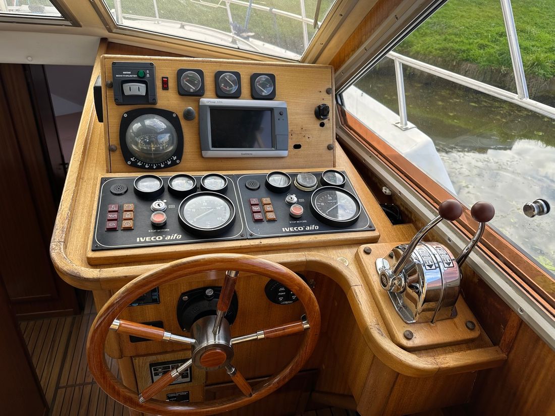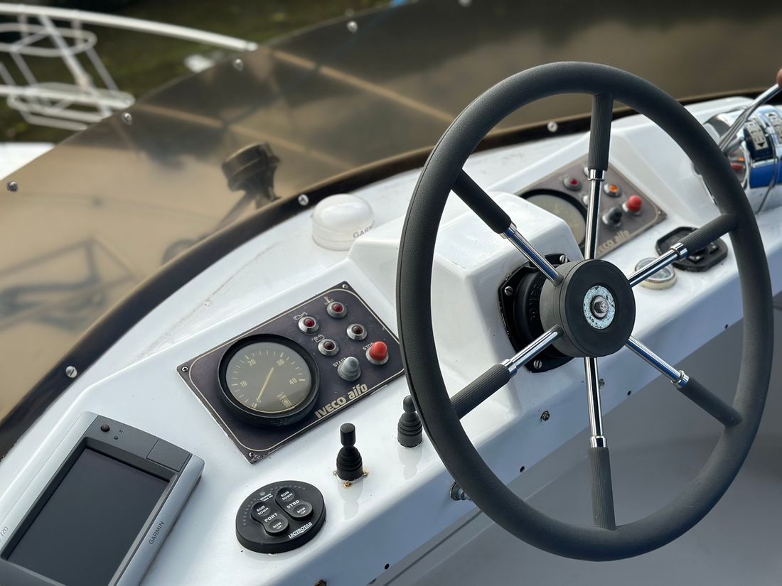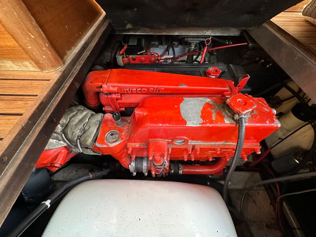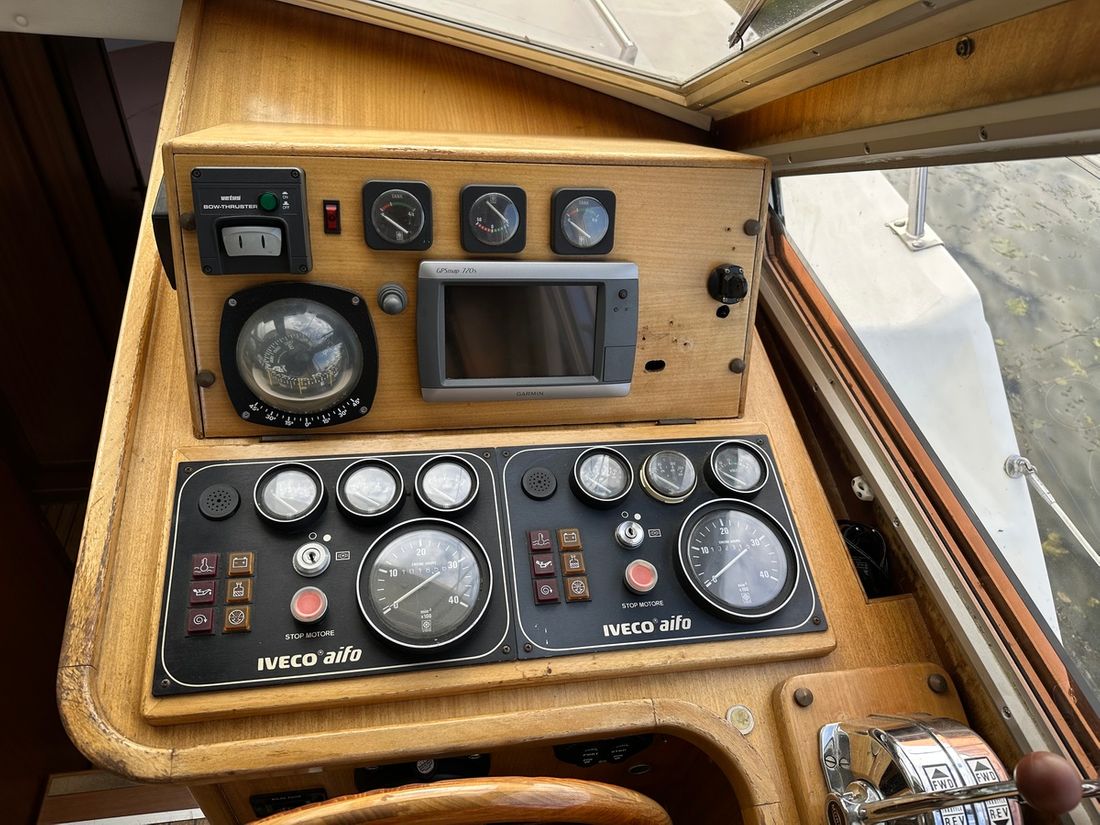 Engines Number of identical engines 2 Starting type electric Main engine Type inboard Brand Iveco Model 8141 Serial number 1655860 / 165858 Year 1997 Power 130 hp Hours counter Fuel diesel Drive Transmission shaft Propulsion propellor Cooling system indirect Tank Fuel tanks Measuring instruments Fuel tank gauge Brand fuel tank gauge 2x Tachometer Oil pressure gauge Temperature gauge Bow and stern thruster Bow thruster electric Stern thruster electric Electricity Battery Battery charger Generator Capacity 4 Brand generator Allpa diesel 4SY ( 2022 ) Voltmeter Shore power Shore power cable 12V 220V -
