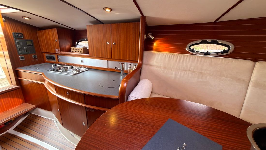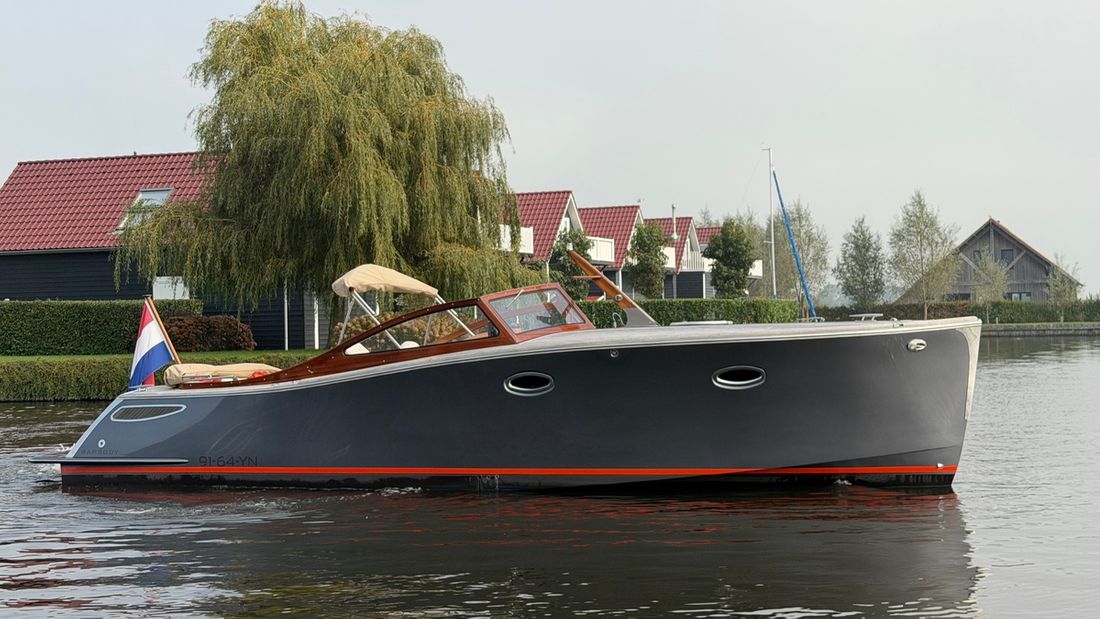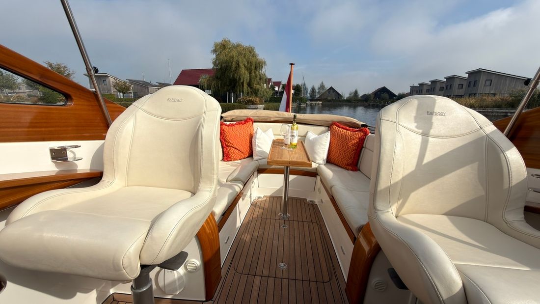 Delivered new Designer Rapsody Yachts Shipyard Rapsody Yachts CE-category C Hull deck superstructure Hull shape v-bottom Hull colour grey Deck colour white Deck construction grp (polyester) Cockpit aft cockpit Open cockpit Dimensions and weights Displacement 4500 kg Steering and Drift Limitation Steering system wheel Position steering system outside control Rudder single Trimflaps -