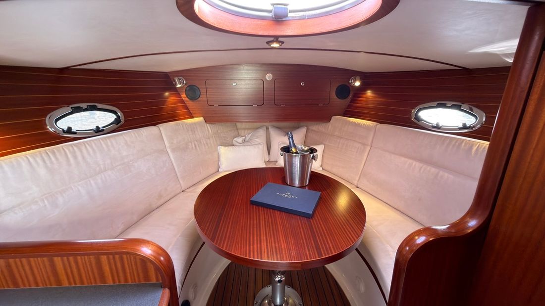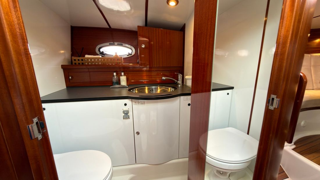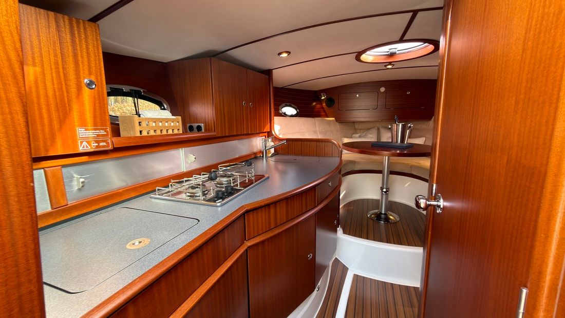 Engines Number of identical engines 1 Starting type electric Main engine Type inboard Brand Volvo Penta Year 2008 Number of cylinders 6 Power 310 hp Hours counter Engine hours 1229 Fuel diesel Drive Transmission stern drive Propulsion propellor Cooling system indirect Tank Fuel tanks Number 1 Total fuel tank(s) capacity 350 litre Fuel tank material stainless steel Performance Max speed 33 knots Measuring instruments Fuel tank gauge Tachometer Oil pressure gauge Temperature gauge Bow and stern thruster Bow thruster electric Electricity Battery Number 3 xAh per battery 250 Battery charger Alternator Voltmeter Shore power Shore power cable 12V -