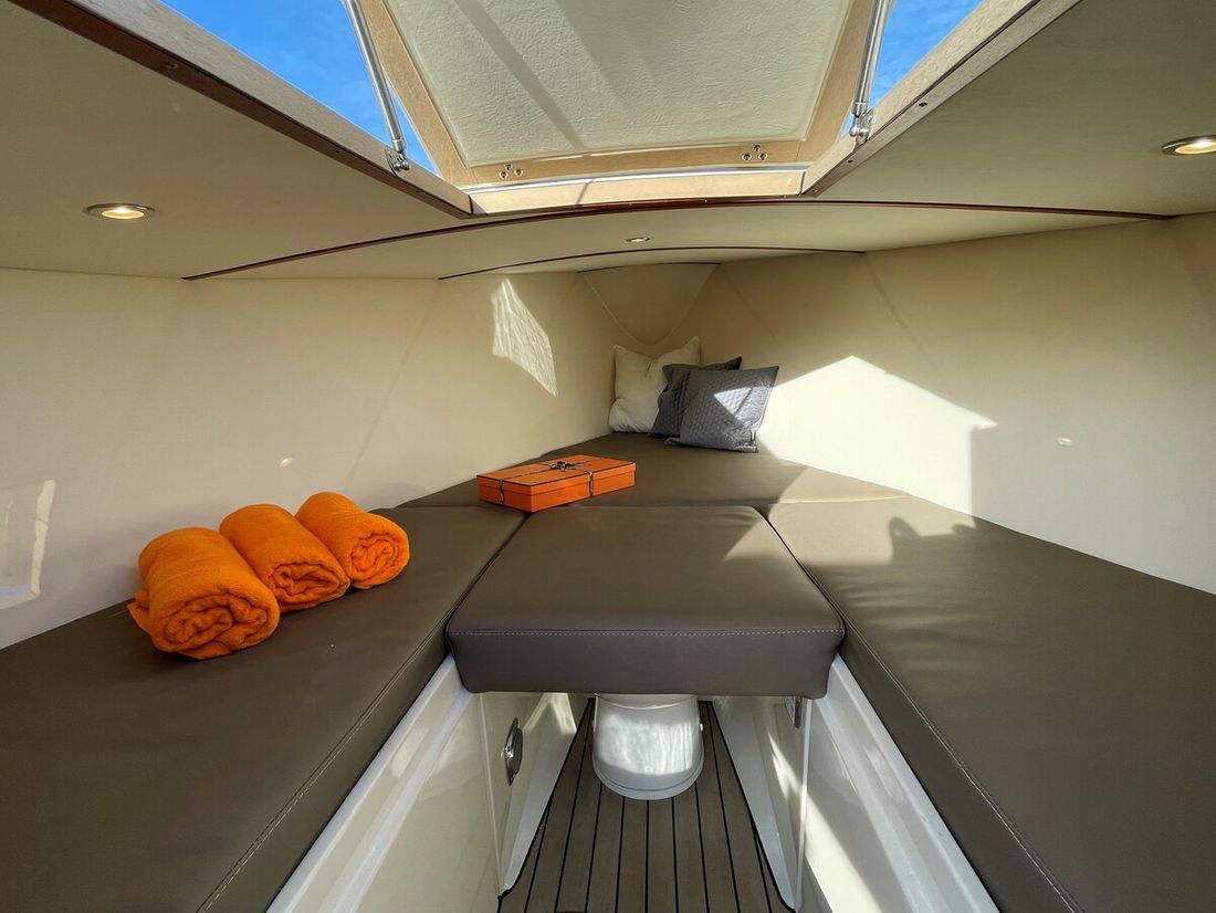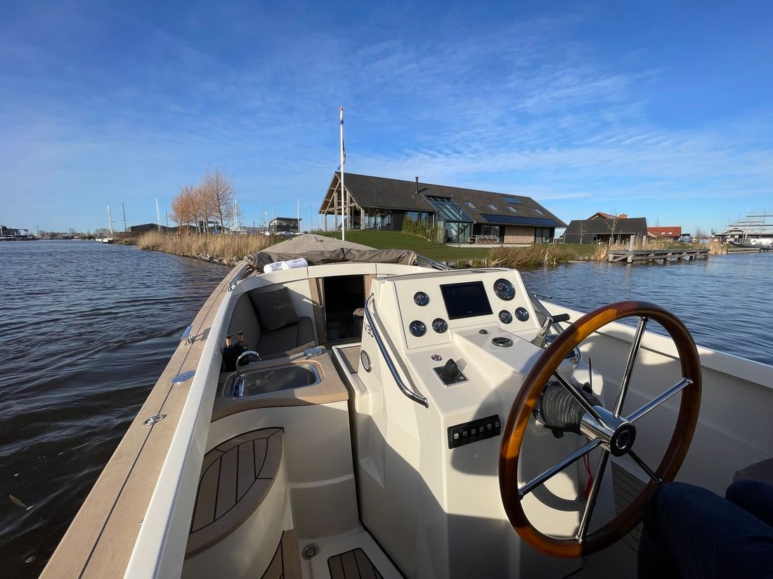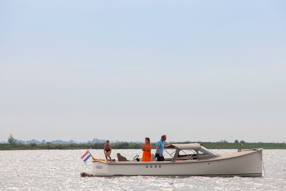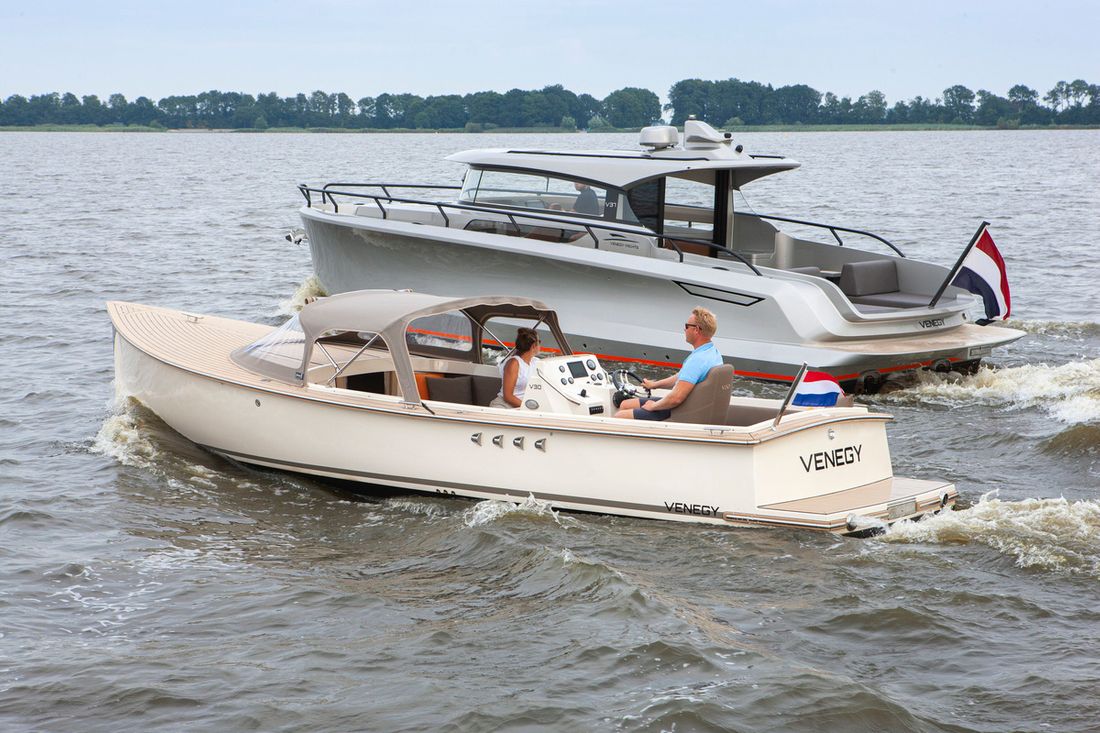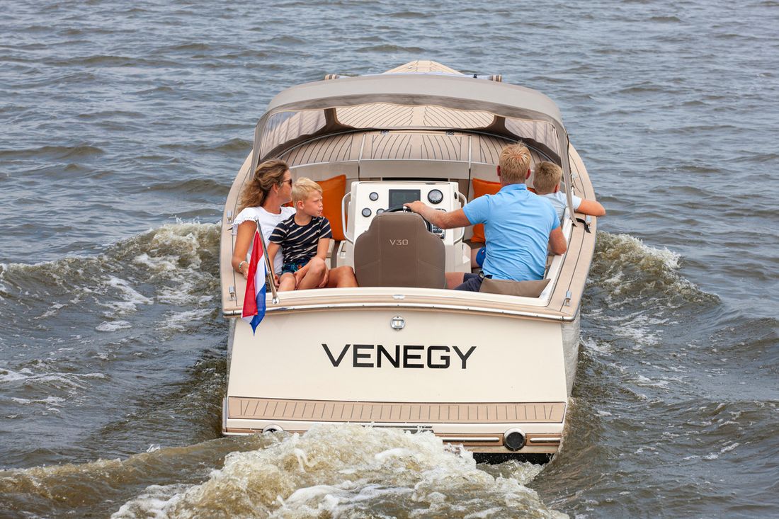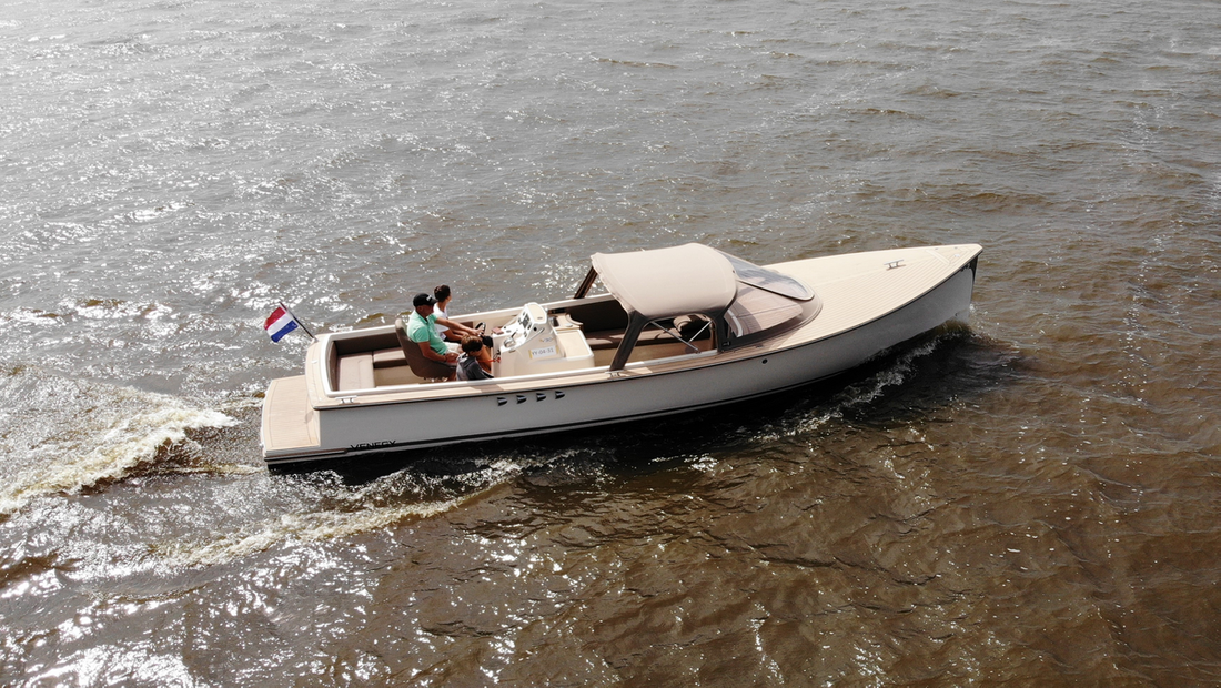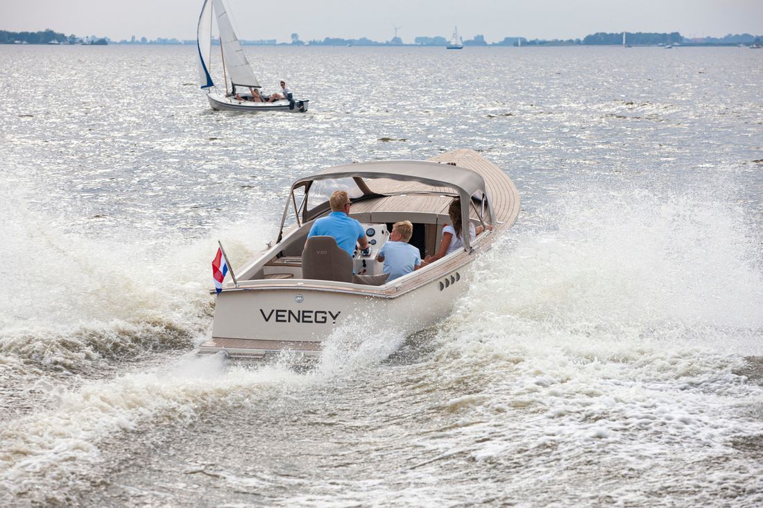 Meet the new Venegy V30 Classic Cabin. This fast sailing tender is classically lined and has a spacious open cockpit with cabin. The ship has a 190 hp Vetus engine with electric control and bow thruster. The deck and cockpit floor is made of Permateek, together with the vinylester hull this ensures a very maintenance-free ship. The tender has a swimming platform with an outdoor shower, refrigerator and electric toilet. The luxurious Silvertex cushions, iPhone charger (built-in) and Nespresso machine ensure a comfortable stay on board.