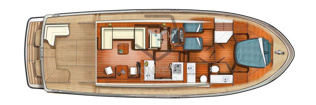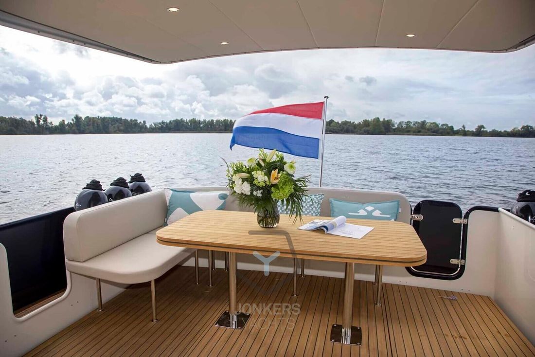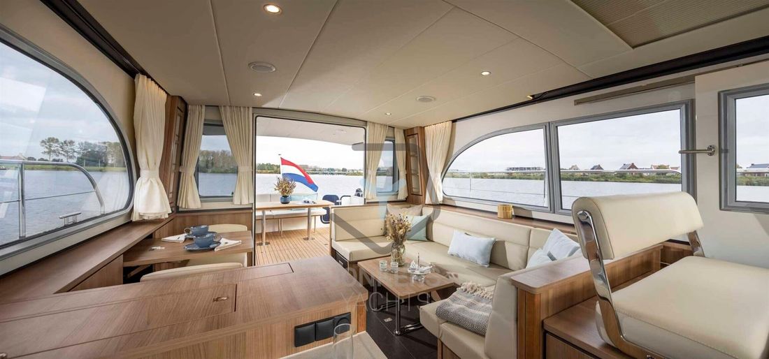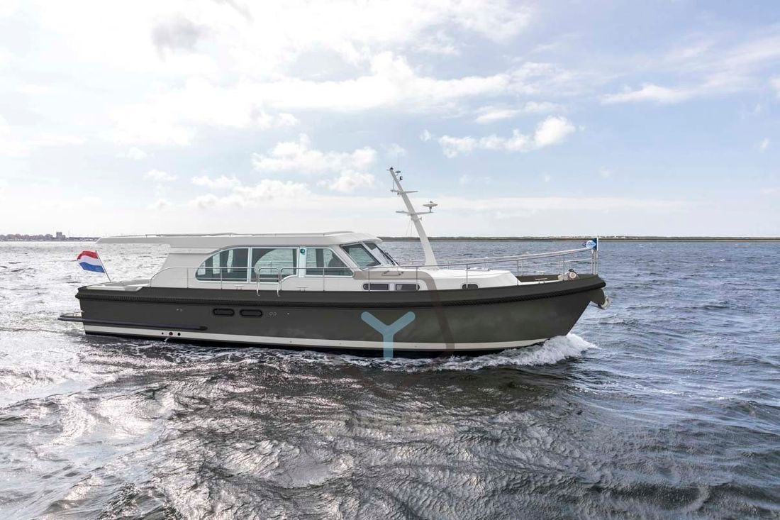 Linssen Grand Sturdy 45.0 Sedan Like all the other Sedan models in the Grand Sturdy® line, the Linssen Grand Sturdy 45.0 Sedan has a spacious saloon and the option of expanding this with a connection to the open cockpit. To involve this space even more with the outside, there is also the sliding roof which can be opened. This allows you to create a spacious environment and maintain contact with the outside while taking a seat behind the wheel in the comfortable salon. The steering position has an adjustable steering bench in both length and width and also offers a sliding door next to the steering position. Ideal for a breeze or contact with the outside of the vessel. Large living spaces aboard the 45.0 Sedan In addition to the spacious saloon and comfortable forward cabin with double bed, the Linssen Grand Sturdy 45.0 Sedan also offers two additional berths in the middle cabin with its own toilet and shower room. The forward cabin also has its own toilet and shower room. Extra comfort and privacy for all guests on board. The saloon has more than enough space for you and your guests. A spacious cozy U-shaped seating area with table and on the other side movable chairs and a folding table provide a large living space aboard the 45.0 Sedan. Combined with the French doors to the open cockpit, you make the living space even larger. The integrated cockpit bench in the spacious open cockpit is a great place to relax. The standard extended saloon roof offers you protection from moments when the weather is slightly less, or from too bright a sun. The central stern door provides access to the swimming platform via the Linssen Center Line Traffic. The saloon roof has integrated water drainage. There are also two solar panels - concealed in the saloon deck - for additional power supply. 2-motor optional