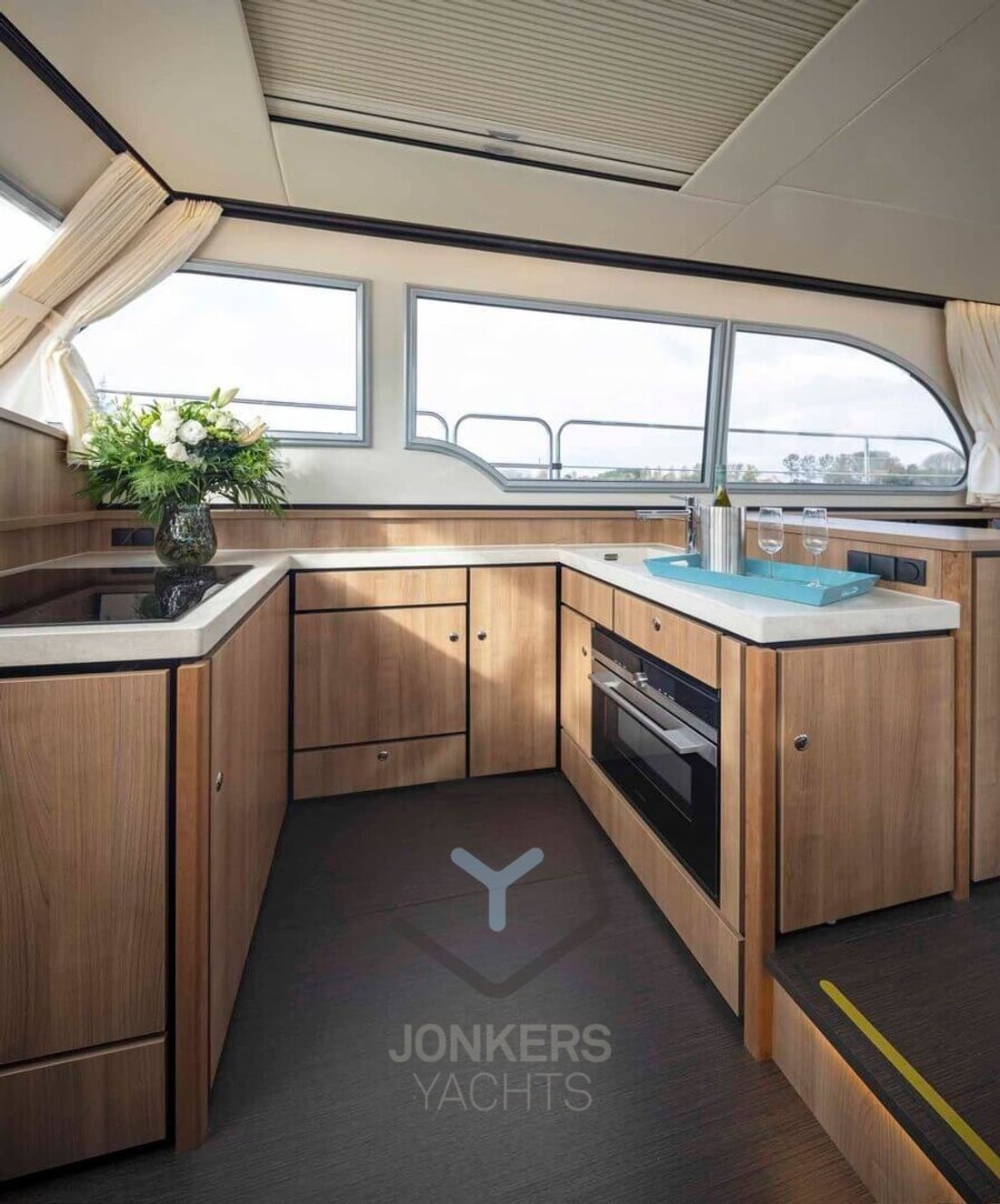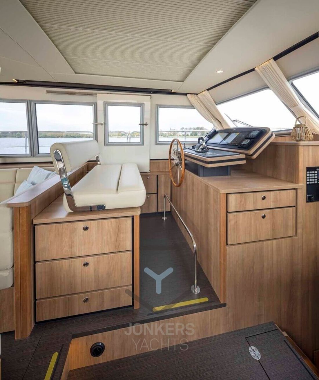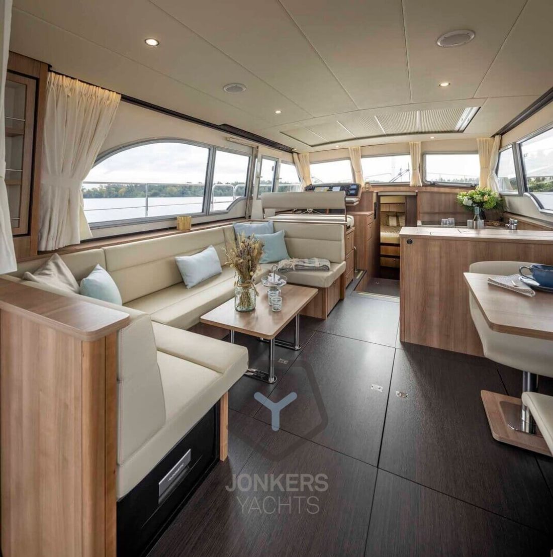 Linssen Grand Sturdy 45.0 Sedan Like all the other Sedan models in the Grand Sturdy® line, the Linssen Grand Sturdy 45.0 Sedan has a spacious saloon and the option of expanding this with a connection to the open cockpit. To involve this space even more with the outside, there is also the sliding roof which can be opened. This allows you to create a spacious environment and maintain contact with the outside while taking a seat behind the wheel in the comfortable salon. The steering position has an adjustable steering bench in both length and width and also offers a sliding door next to the steering position. Ideal for a breeze or contact with the outside of the vessel. Large living spaces aboard the 45.0 Sedan In addition to the spacious saloon and comfortable forward cabin with double bed, the Linssen Grand Sturdy 45.0 Sedan also offers two additional berths in the middle cabin with its own toilet and shower room. The forward cabin also has its own toilet and shower room. Extra comfort and privacy for all guests on board. The saloon has more than enough space for you and your guests. A spacious cozy U-shaped seating area with table and on the other side movable chairs and a folding table provide a large living space aboard the 45.0 Sedan. Combined with the French doors to the open cockpit, you make the living space even larger. The integrated cockpit bench in the spacious open cockpit is a great place to relax. The standard extended saloon roof offers you protection from moments when the weather is slightly less, or from too bright a sun. The central stern door provides access to the swimming platform via the Linssen Center Line Traffic. The saloon roof has integrated water drainage. There are also two solar panels - concealed in the saloon deck - for additional power supply. 2-motor optional