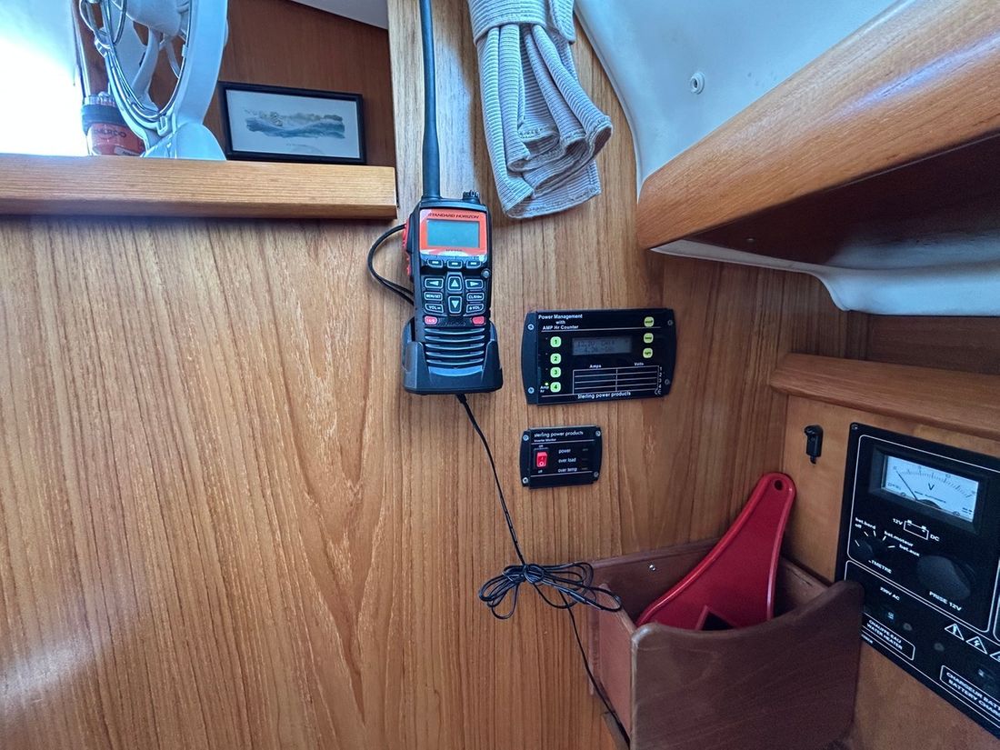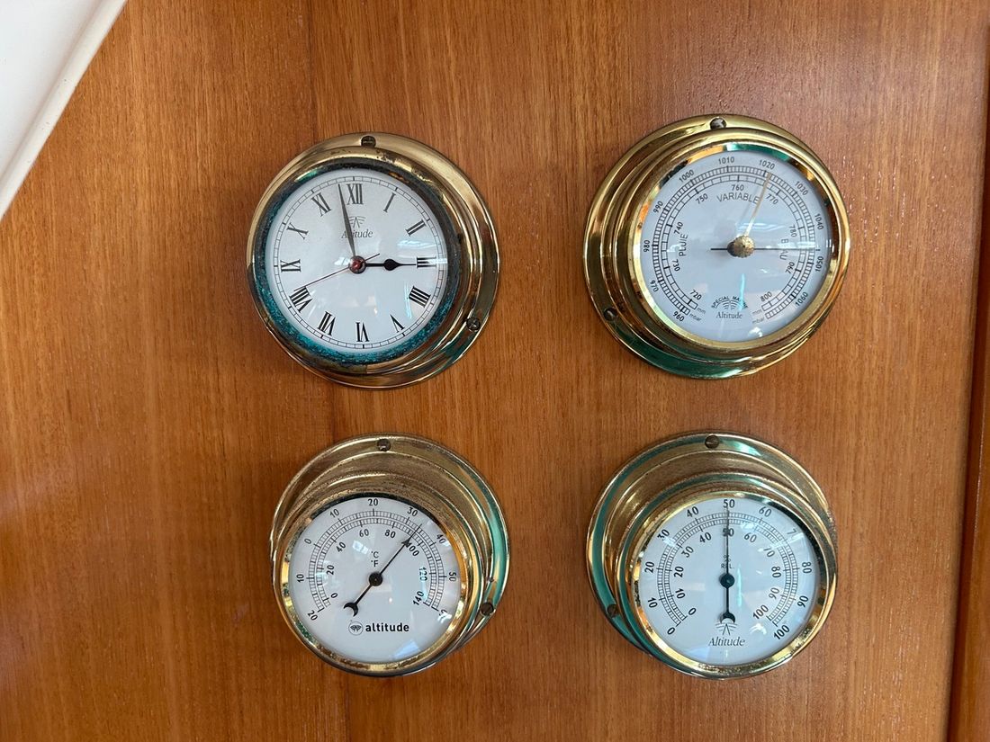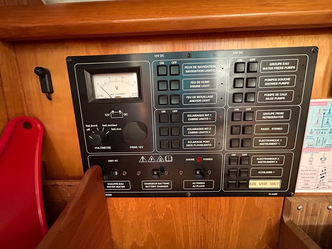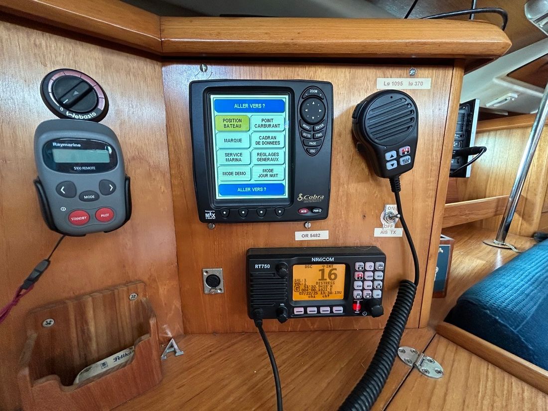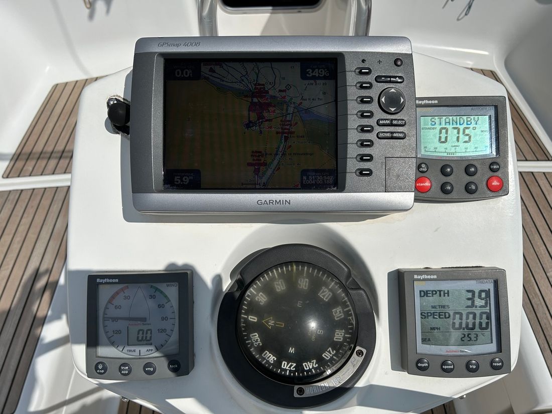 Basic tools Compass Brand kompas Plastimo Horizon 135 Log/speed Brand log/speed Raymarine ST 60 Depth gauge Brand depth gauge Raymarine ST 60 Wind gauge Brand wind gauge Raymarine St 60 Navigation lights Modern electronics Autopilot Brand autopilot Raymarine GPS Chart plotter Brand chart plotter Garmin Map 4008 en Cobra Cmap Brand AIS Garmin AIS 800 Communication VHF Brand VHF Navicom 2021 en handheld Standard Horizon 2019 -