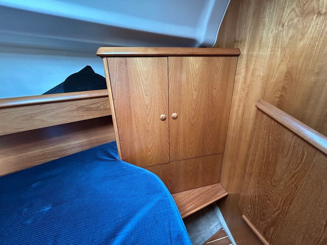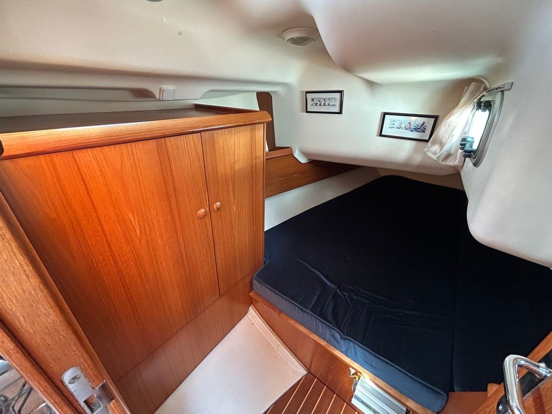 Spaces Saloon Separate Dining area Engine room Cabins 2 Saloon Decoration Type interior Classic, warm Color upholstery blue Mattresses Curtains Water Water tank & material Capacity 320 litre Water tank material plastic Water tank gauge Water system pressure Hot water Deck Shower Plumbing Toilets 1 Manual Entertainment Radio/CD player Kitchen Cooker & fuel Number 2 Cooking fuel gas Oven Fridge & power source Capacity 150 litre Power source electric Climate control hot air -