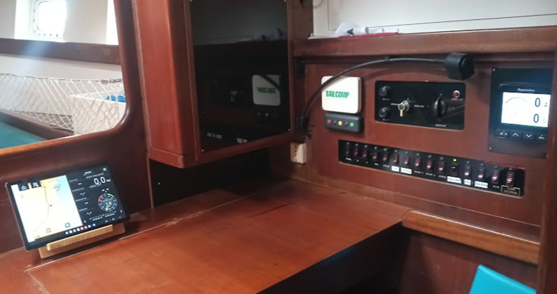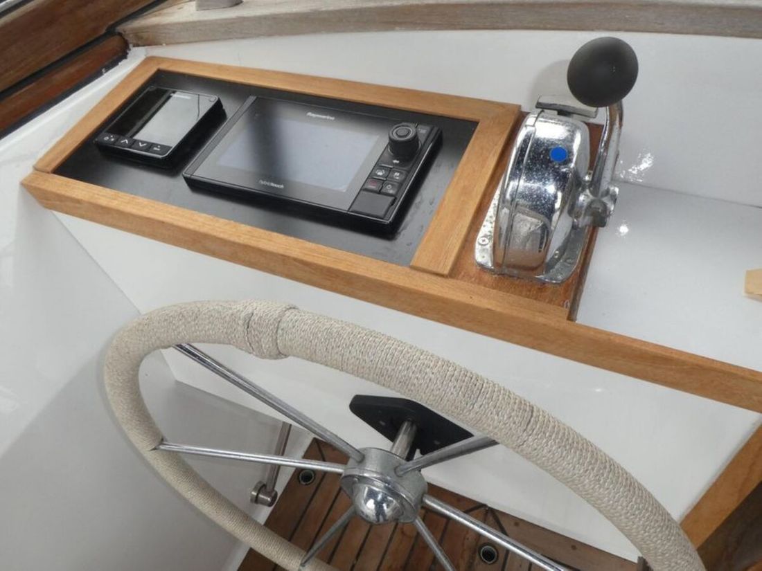 The outdated navigation equipment has been replaced by a new Raymarine marine radio, sea-talk network, plotter and two multifunction displays.