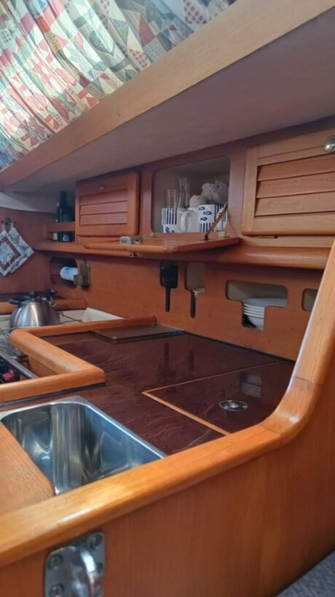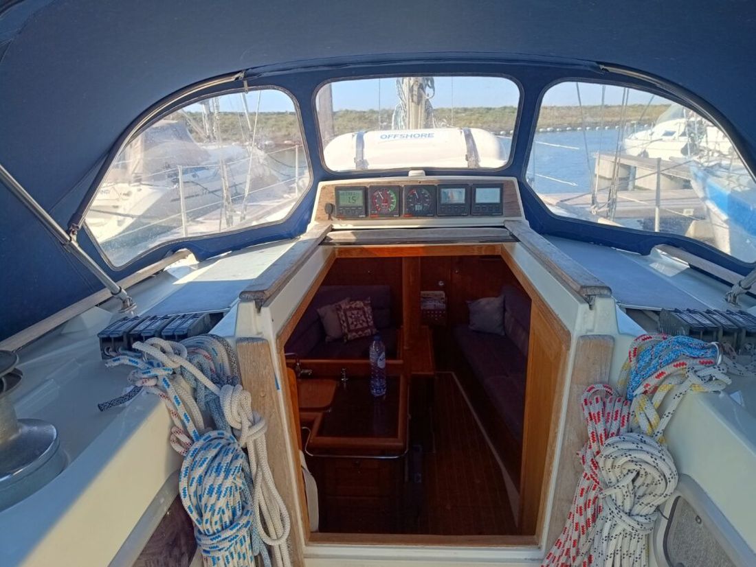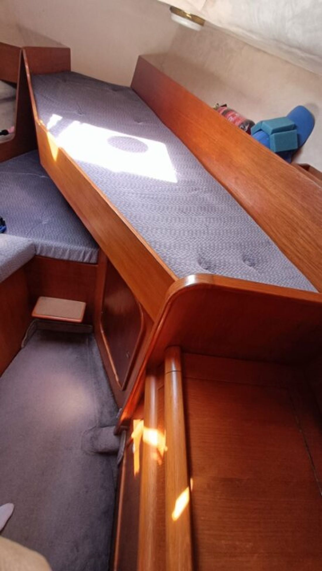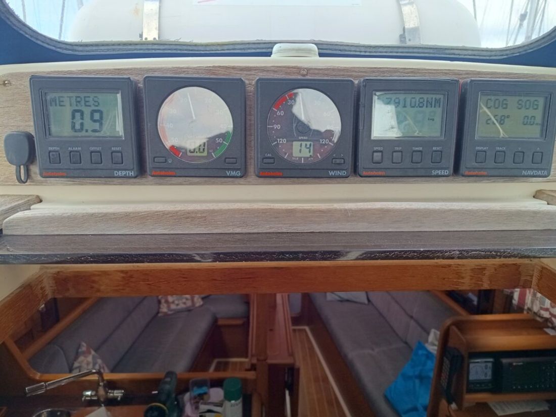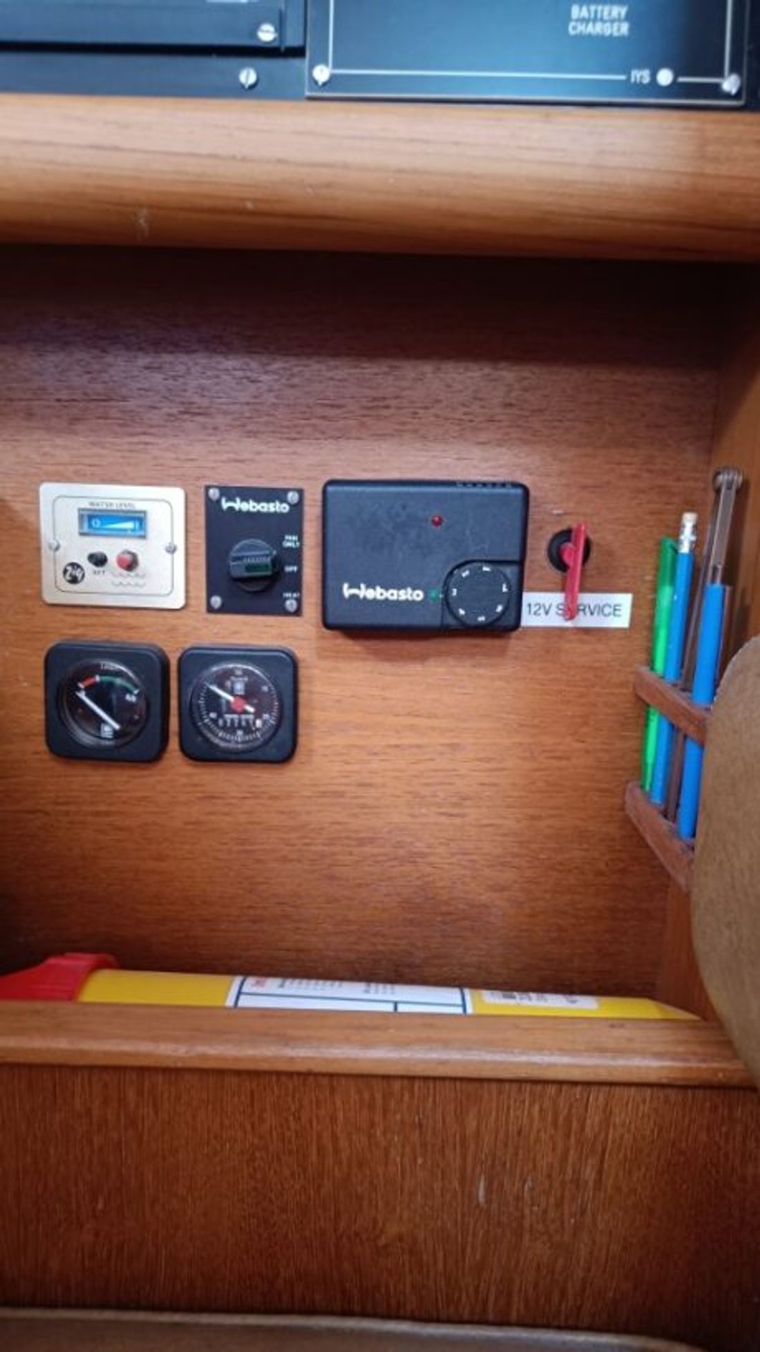 sink, sea charts, AIS - Autom. Identif. System, toilet manual, aft cabin, bow cabin, salon, head, steering position outside, steering position on quarterdeck, radar reflector, life jackets, boom aluminium, shore supply 220V, radio, anchor chain, second anchor, winter cover, sun shade / aftdeck, pressurized water system, warm water system, guard rail, bathing ladder, underwater paint, engine battery, hob gas, anchor windlass bow, bathing platform, cushion cover textile, stern shower